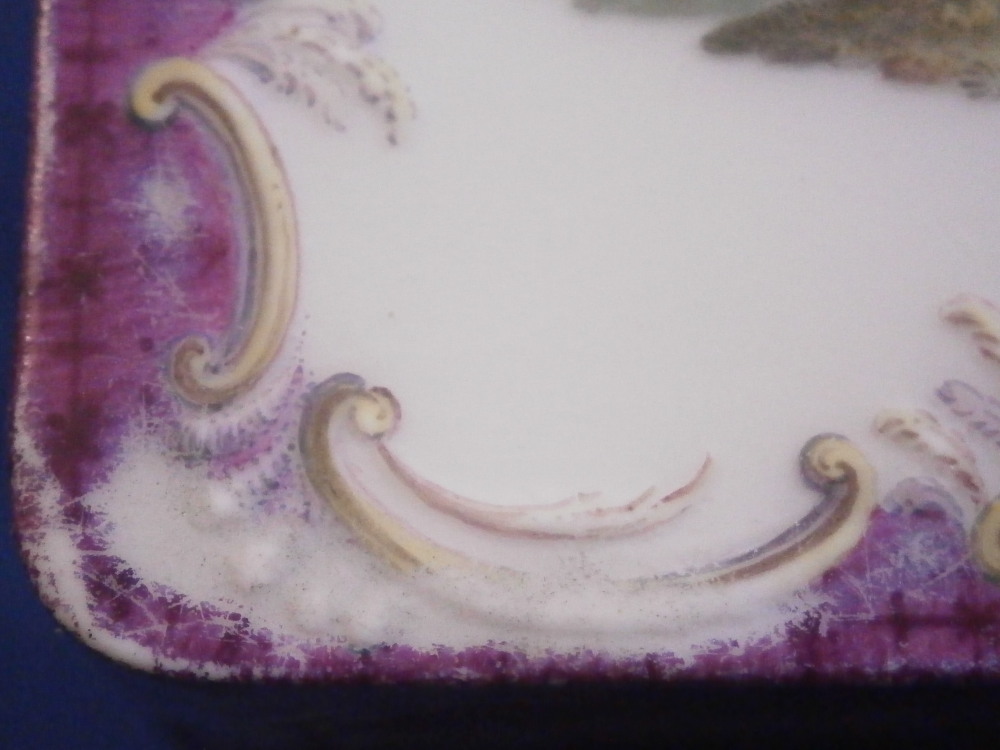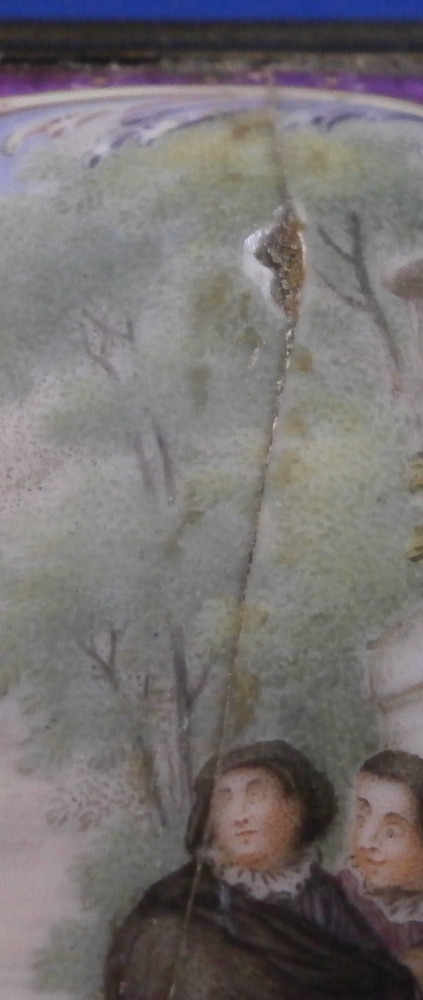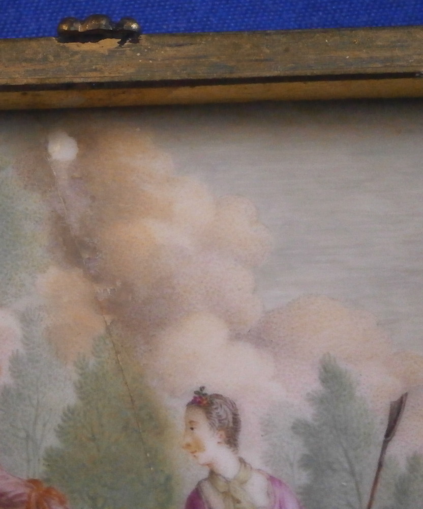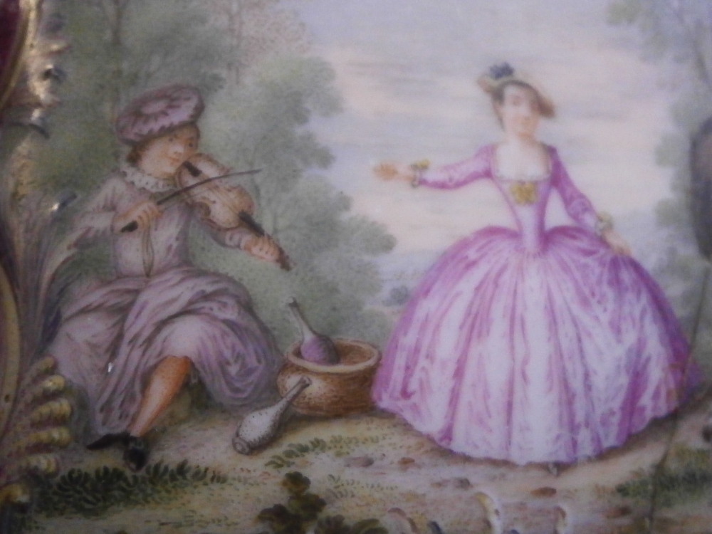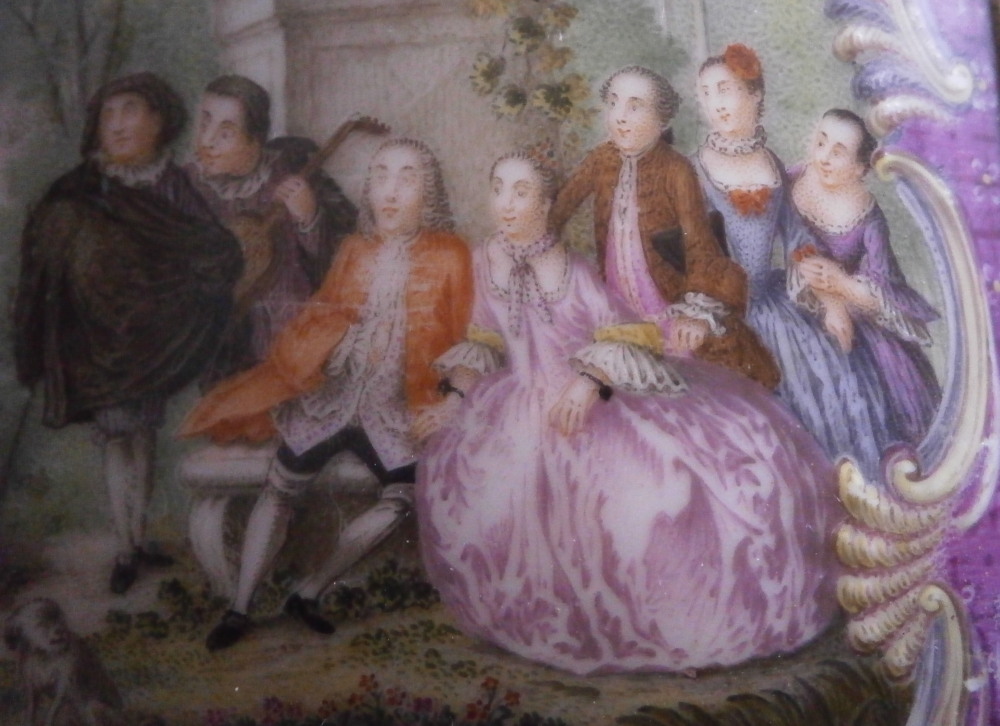 This is a really superb snuff / patch / pill / tabatiere box made by Meissen around 1750. This is a really nice example in terms of the painting. It has seven hand painted nice quality scenes on it as well as some nice relief scroll work plus this amazing puce trim to fill in the areas that are usually white. Most scenes include multiple people and all are in a landscape surrounding. Only the scene on the udnerside has a single shepherdess with its sheep in it. The mounts are brass and they still work perfectly. The quality of the scenes is superb! The box is in good condition - The bottom has no real issues except a little wear to the underside corners and a tiny chip to the edge. The lid sadly has been broken in half and was restored at some point. Hard to spot on the inside but could use a quick redo to bring it back to perfection! On the outside / top it is visible as a dark line but a decent restorer could make it look perfect again. It's a clean break with almost no dmage to any paint. The box is not marked which is normal but the piece speaks for itself. The snuff box is about 1.625 inches tall, 3.375 inches wide and 2.625 inches deep so a very nice size. Please email me for more information or other pictures.