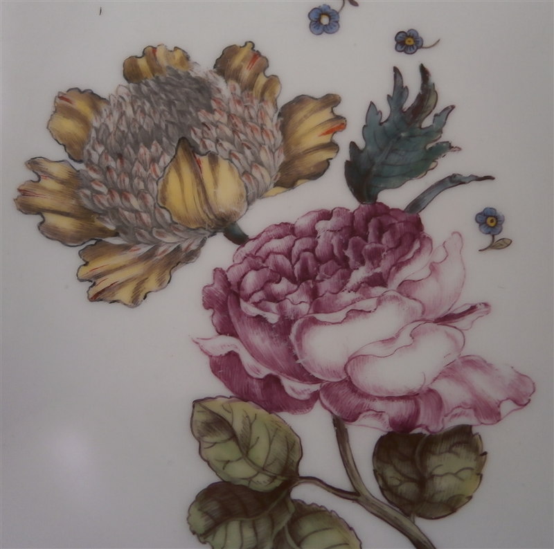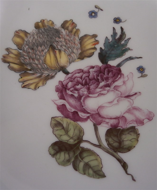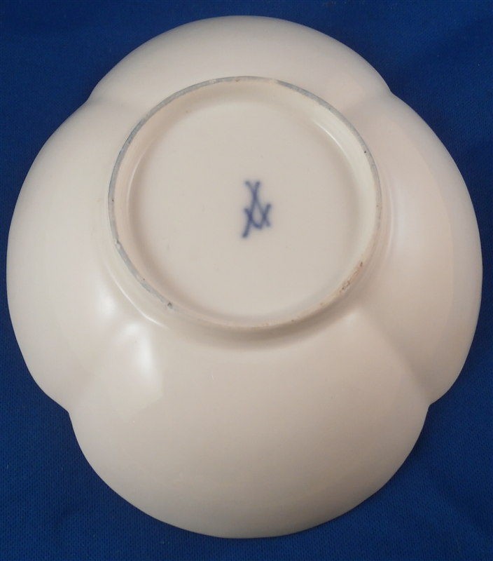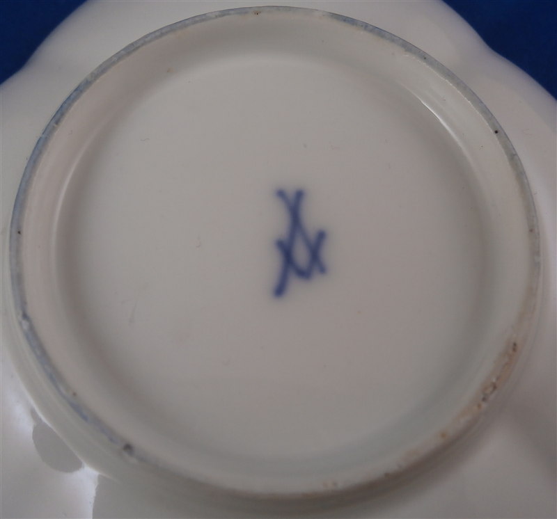 This is avery nice and early saucer made by Meissen in about 1740. It has a nice quatrefoil shape to it and is handpainted with one of the nicest larger floral arrangements I have ever seen in the center as well as three small flowers scattered throughout with a gold trim to the edge. The saucer is marked with the straight blue crossed swords underneath as well as the usual impressed number. The piece is in great condition with a bit of wear mostly to the gilding. The saucer is 1.25 inches tall, 5.5 inches wide and 4.75 inches deep. Please email me for more information or other pictures.