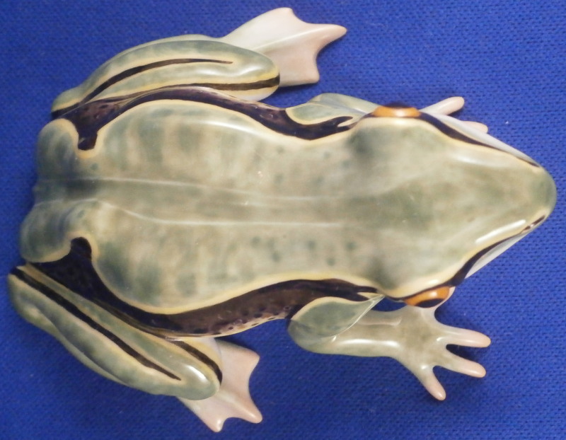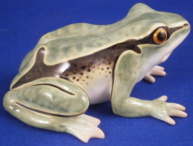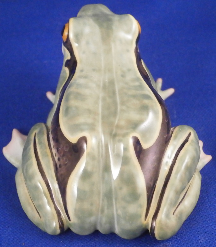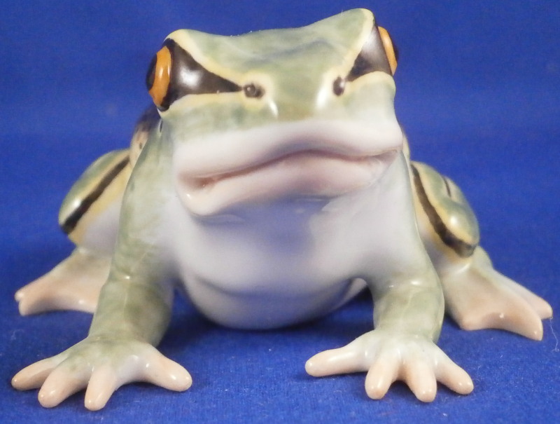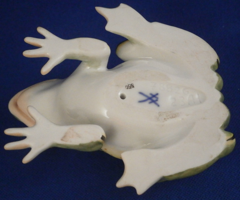 This is a really superb figurine of a frog made by Meissen in the 20th century. Definitely a new favorite of mine. I do believe the model dates back to the 18th century and was made by the famous Kaendler who outdid himself on this one. Perfectly modeled and hand painted to perfection. He looks real and is the perfect size as well. The figure is in perfect condition. It is marked underneath with the under glaze blue crossed swords mark as well as the usual impressed marks and a painter's number in black as shown. The frog is 1.375 inches tall, 2.5 inches wide and 2.875 inches deep. Please email me for more information or other pictures.