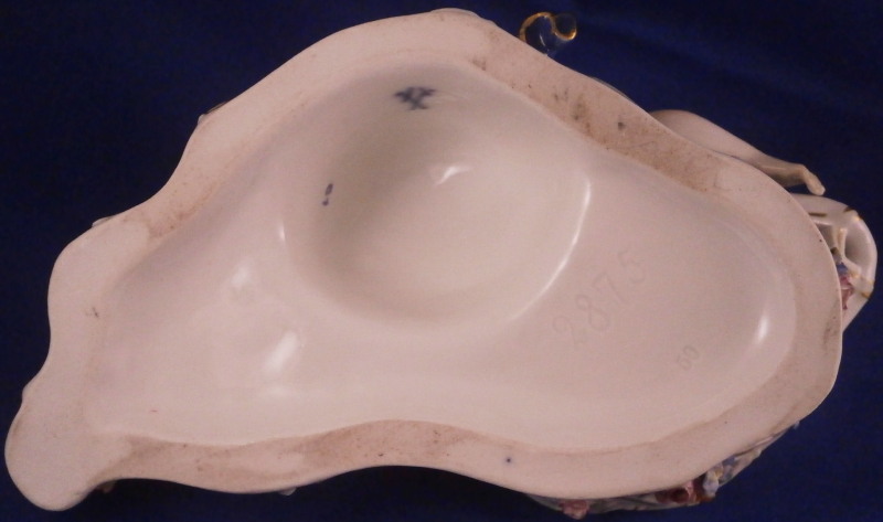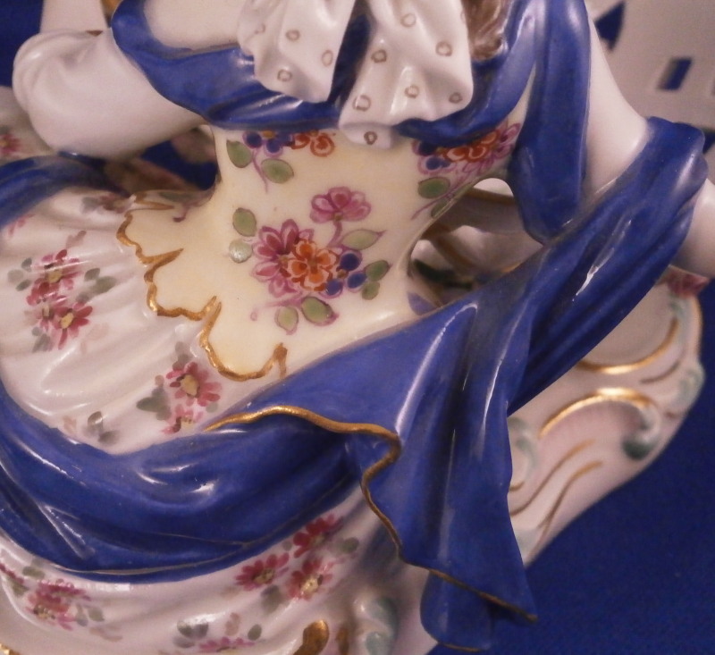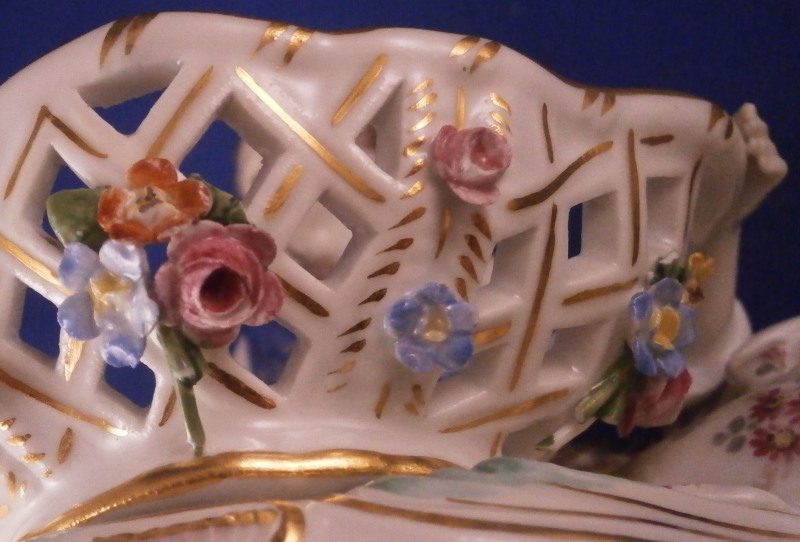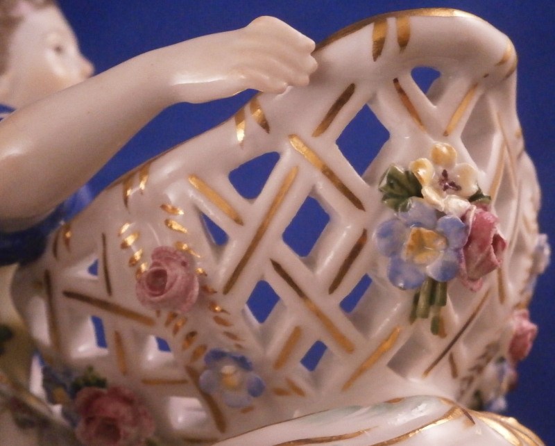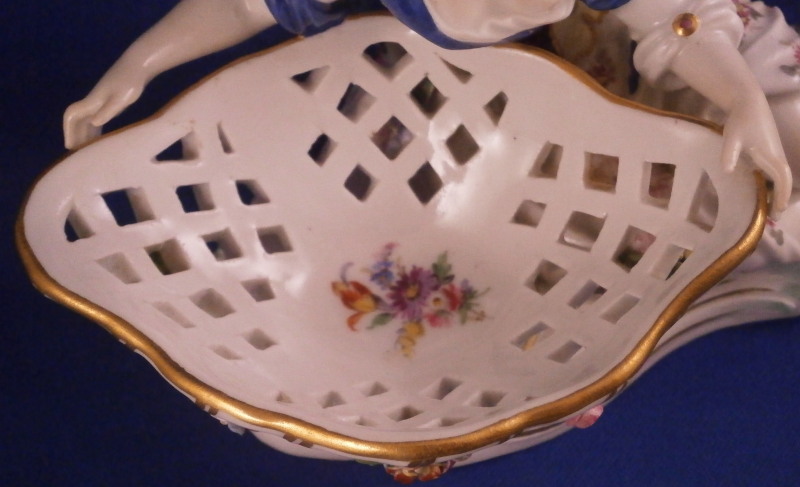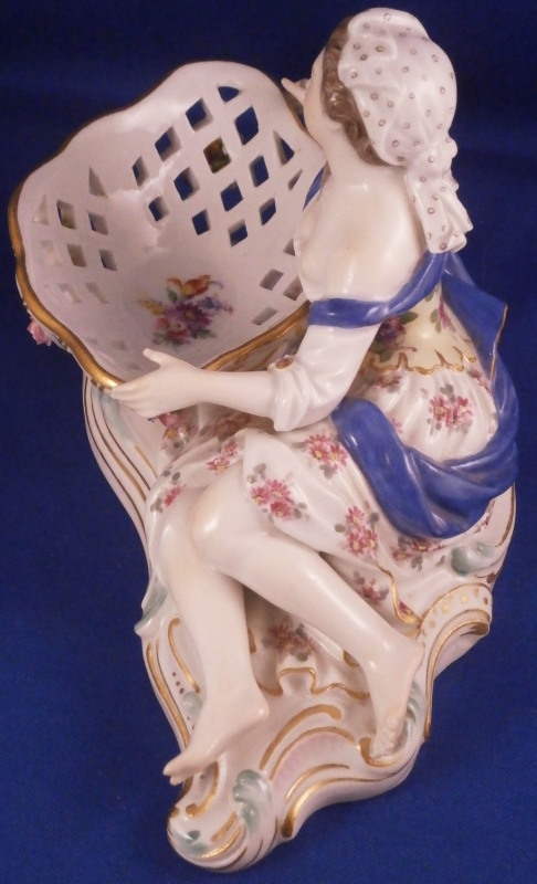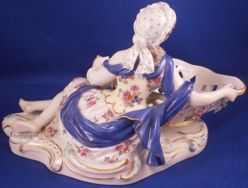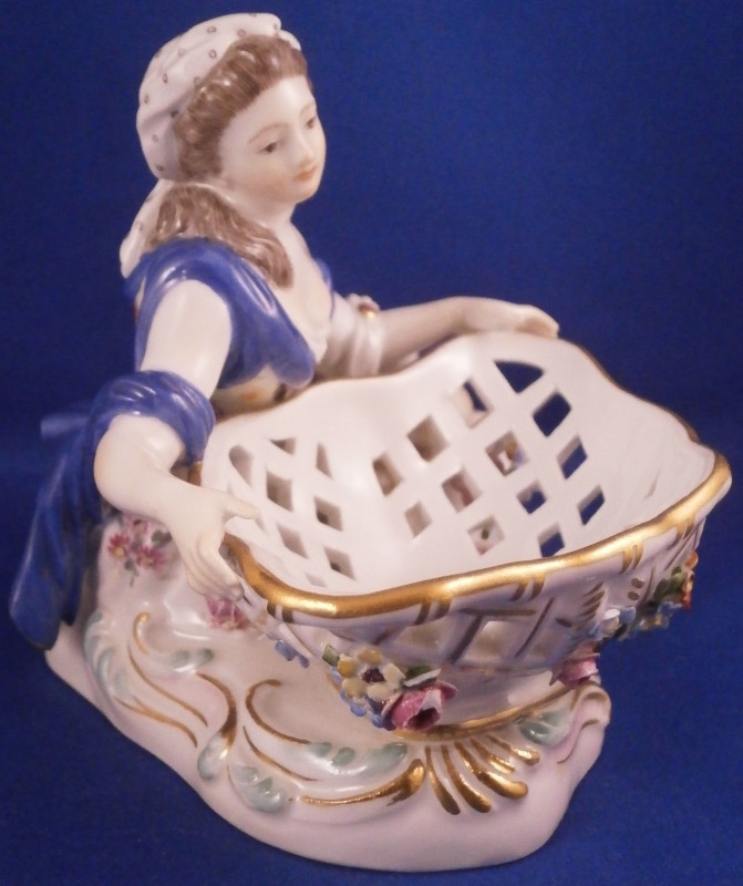 This is a superb figural sweetmeat dish made by Meissen in the 19th century. One of the nicest I have ever seen! Very nicely modeled with a lady figurine holding a basket in front of her while lying on a base with gold and turquoise trim along the edge. The lady is nicely dressed with a fancy skirt hand painted with lots of flowers and a blue cloth draped around her top. Head scarf on her head. The basket on these pieces if mot often solid but here is is reticulated with a nice floral arrangement in the bottom center and lots of applied 3D flowers to the outside as shown. Some gold trim to it as well. A really stunning piece and I ahve the matching male version to her as well if anyone would like a pair of these. The piece is in amazing condition with just a touch of damage to the 3D flowers which is normal. Four leaves are chipped and one petal plus a stem as far as I can tell. The piece displays perfectly! The figure is marked underneath with the under glaze blue crossed swords mark, the usual impressed / incised numbers as well as a painters mark in form of a blue 81 as shown. The piece is about 4 inches tall, 6.75 inches wide and 4 inches deep. Please email me for more information or other pictures.