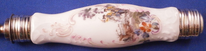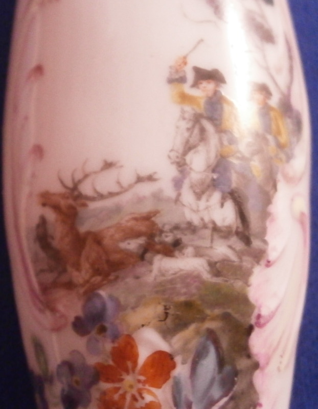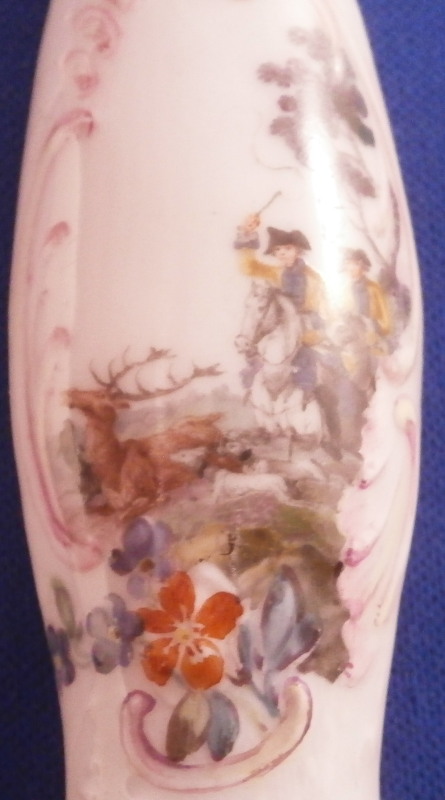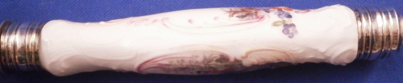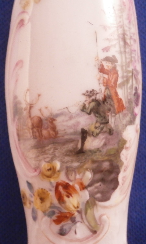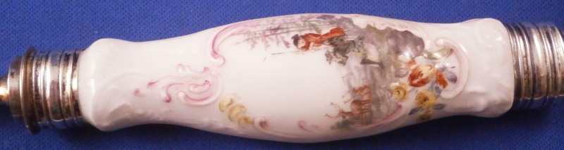 This is a superb fork with the porcelain handle made by Meissen in about the 18th century and the silver tines being a replacement from London in 1858 though the exact Silversmith seems to be unidentified. The handle is nicely shaped with a molded scroll pattern to the paste and a hunting scene hand painted on either side surrounded by colored scrolls. A hand painted flower under each scene. Sterling silver end capand ferrule between the porcelain and the blade both of which seem to be original to the porcelain piece. The fork part was replaced and is nicely hallmarked as shown. The piece is in superb condition with just some oxidation to the silver. It came with a knife that is very similar in a very beat up case but the knife porcelain part is slightly different so I am offering them separately but if anyone would like them as a set that is certainly possible and they look great together when displayed. The fork is 7.875 inches long of which 3.25 inches is the visible porcelain handle and 3.5 inches the silver form part. The porcelain is not marked or shall we say visibly marked since it would be hidden by the ferrule which is normal but it is definitely made by Meissen during this period. Please email me for more information or other pictures.
