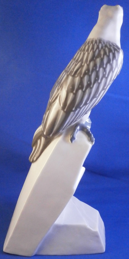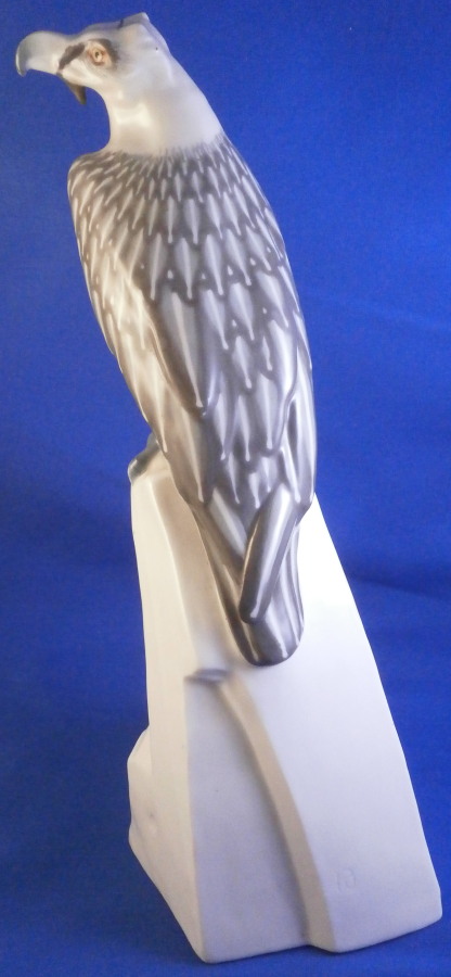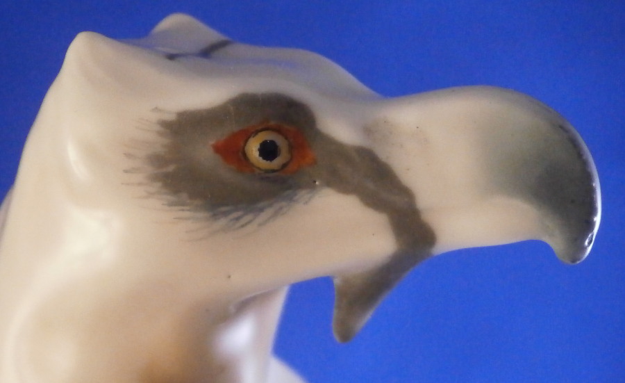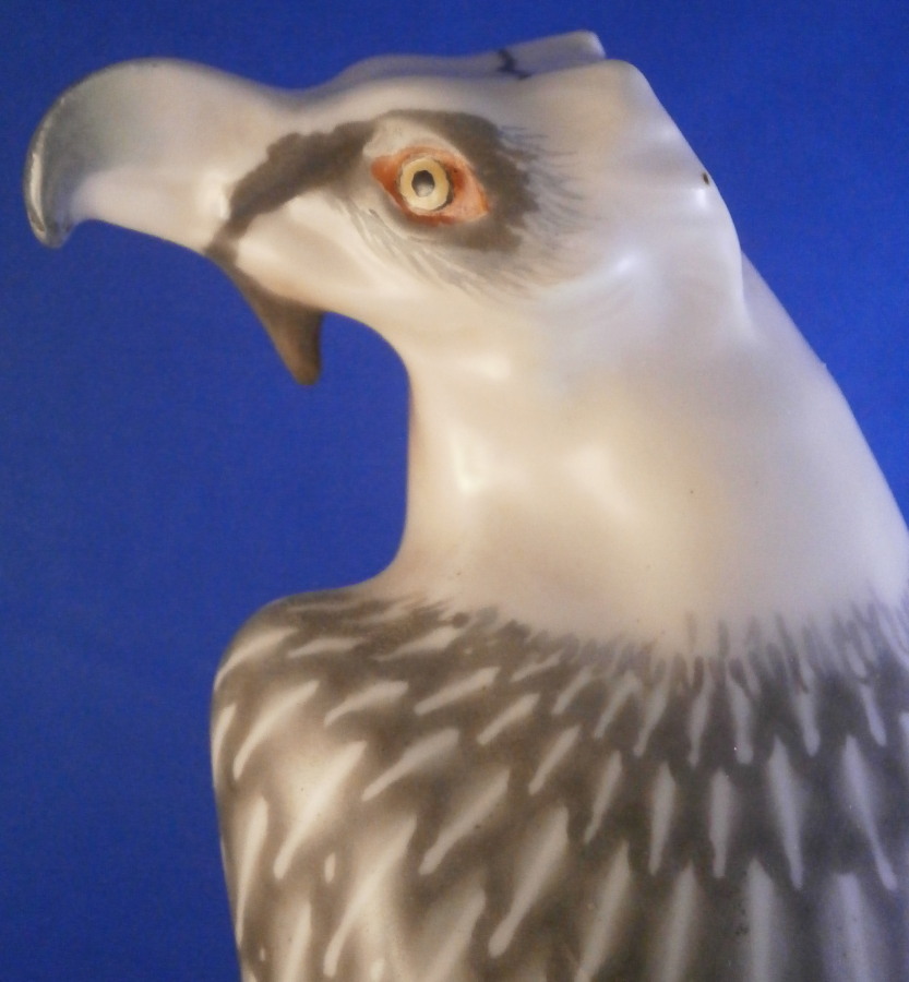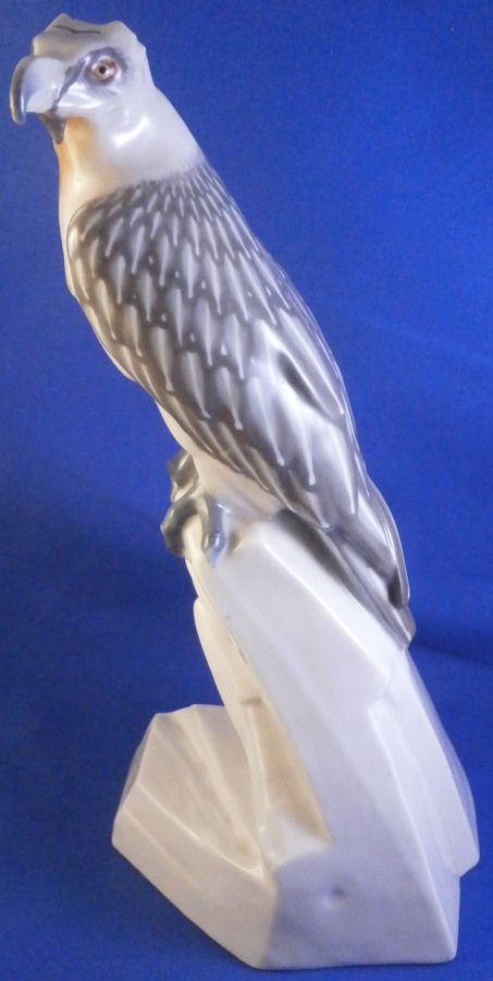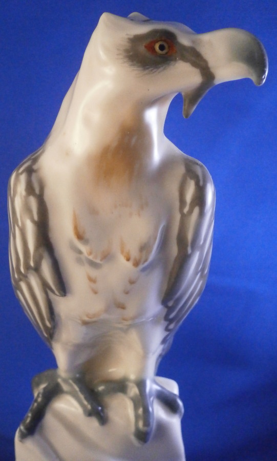 This is a really superb figurine of a bearded vulture made by Meissen during the Jugendstil / Art Nouveau period of the early 20th century. It was first designed in 1904 by the famous Paul Walther who designed quite a few animal figurines for them during this period. The figure is of a bird sitting on a rock at the edge of a cliff. The figure is superbly painted in their famous and rare under glaze colors from this period. It is very well modeled with lots of details and hand painted perfectly. The figure is in great condition! It does have some minor manufacturing flaws like two extra pain spots and a ground down firing flaw but these are from when it was made and there is no actual damage, repair, etc. It is marked under neath with the blue crossed swords mark (first choice) as well as the model number U184, impressed number 156 and the artist monogram to the back base as shown. The swords are not under glaze because the bottom was ground down to stop it from being wobbly and then the swords were reapplied at a later firing. It happens from time to time but is not common. The piece is still a tiny bit wobbly if you try but perfectly stable when on display. The coloration of this example is extra nice! The piece is 10.5 inches tall, 3.75 inches wide and 5 inches deep. Please email me for more information or other pictures.