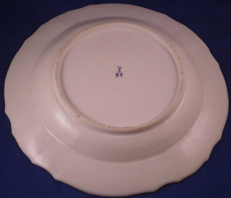 This is a nice early plate made by Meissen in about 1740. A nicely shaped piece with a relief design to the rim broken up by four small flower panels, a brown trim to the edge as well as some single flowers to the well that are of top quality but the best part is the floral arrangement in the center including a superb tulip and two roses with their leaves. Still in the woodcut style of the period before the Deutsche Blumen took hold. No comparison if you ask me - they are just amazing and the paste of the porcelain on this piece is my favorite as well - much whiter than later pieces. The plate is in superb condition with some minor wear as shown. It displays perfectly! The plate is marked with the under glaze blue crossed swords mark on the underside as well as an impressed number as shown. The piece is 1.25 inches tall and 9.5 inches in diameter. I have a matching plate from the same set as well if anyone is interested in a pair! Please email me for more information or other pictures.