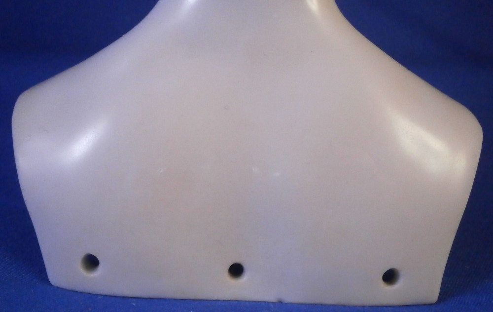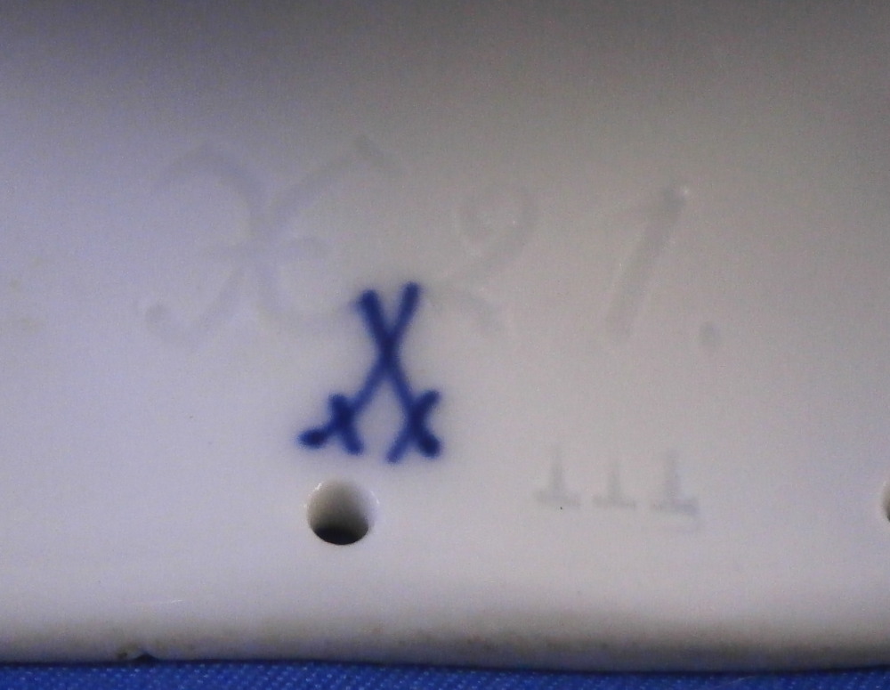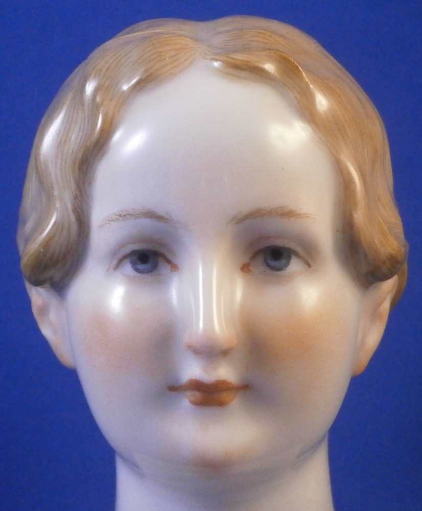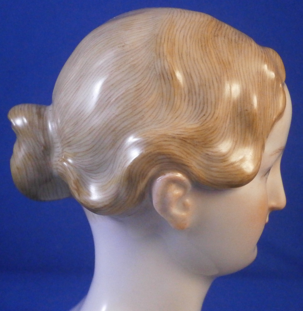 This is a very rare and fine porcelain shoulder head for a doll made by Meissen in the mid to late 19th century. One rarely ever sees these pieces and I have never seen this example before. It is of a young lady or girl with lots of fine details to it. Superb light brown or dirty blonde hair drawn back into a bun, nicely detailed ears and very well painted facial features. In terms of dolls this would have been the most high end of pieces like this! The shoulder plates in the front and back each have three holes in therm to attach to the doll's body! It is marked on the inside of the shoulder plates with their under glaze blue crossed swords mark, incised model number X.21 and imprssed number 111. Possibly originally modeled by Johann Gottfried Dressler . These pieces truly cross the line of the German China doll from being a toy to true art. As nice as they come! I have only seen a handful of these over 25 years and only once as part of a whole doll and that sold for almost 10K. So definitely a very special piece. It is 3.875 inches tall, 3 inches wide and 2.25 inches deep. Insuperb condition except for a flake to the bottom edge as shown that is glazed over and from when it was made. Please email me for more information or other pictures.