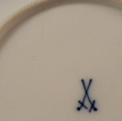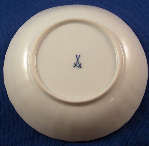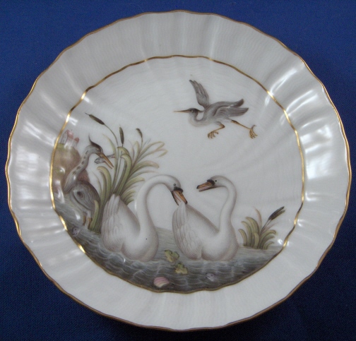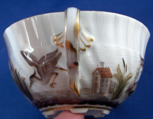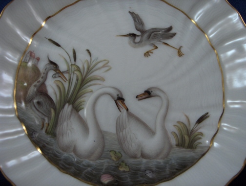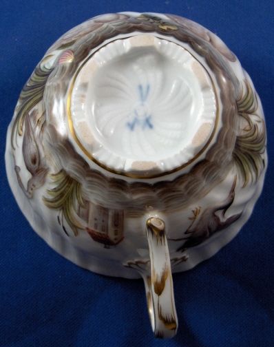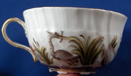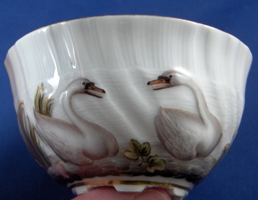 This is a cup and saucer from the famous Swan Service made by Meissen in the late 19th century. Originally this service was made between 1737 and 1741 by Johann Joachim Kaendler and Johann Friedrich Eberlein. Made for Heinrich, Count von Brühl, the factory director, it was composed of 2,200 pieces modeled and painted in the Rococo style with such aquatic motifs as swans and water nymphs. It is regarded as the single finest table service ever made in porcelain. This cup and saucer here is the rarer polychrome version with the raised design including swans and birds in the center and some gold trim. The cup stands on six small feet. The set is in perfect condition with a spot of minor wear on the heron of the saucer. Both pieces are marked with the underglazed blue crossed swords mark - the one on the cup is disturbed by the relief design thus the look. Both are first quality. The cup is 1.875 inches tall and 3.5 inches in diameter. The saucer is 1.125 inches tall and 5.875 inches in diameter. Please email me for more information or other pictures.