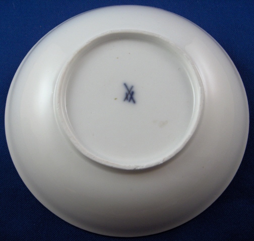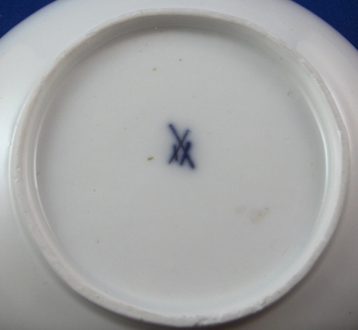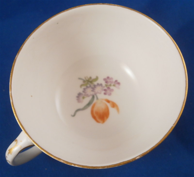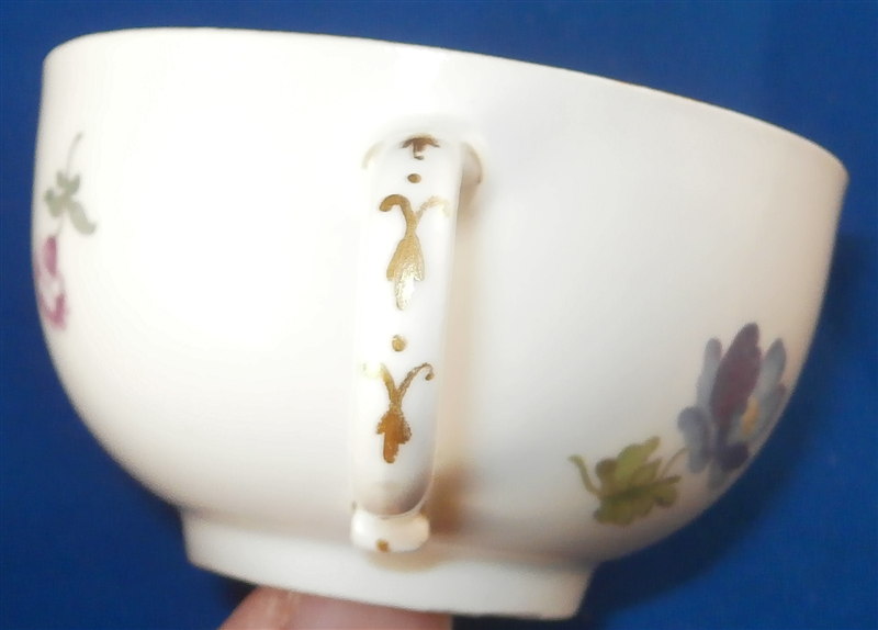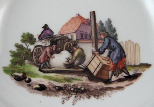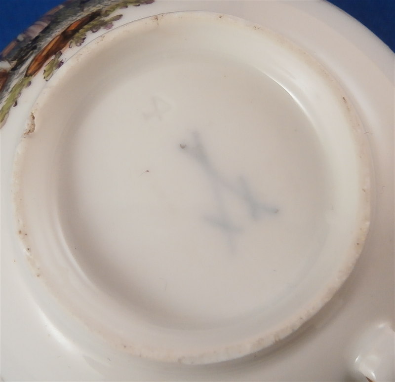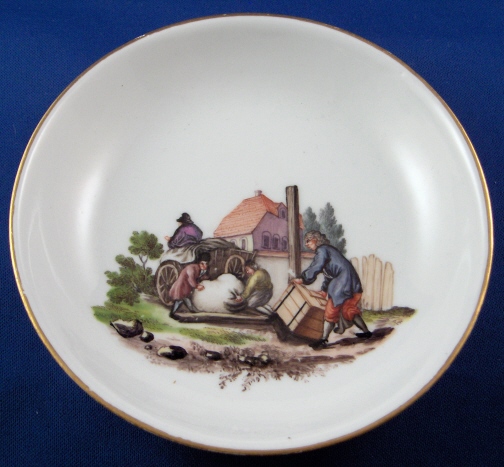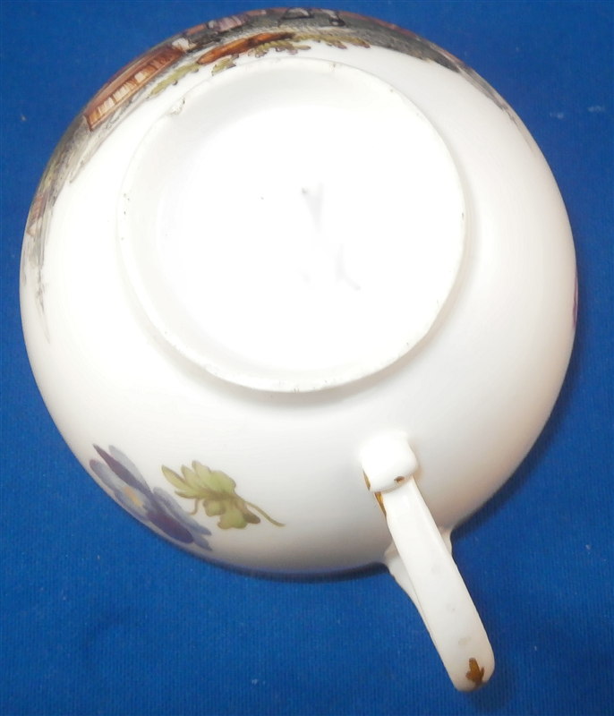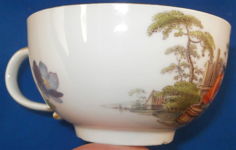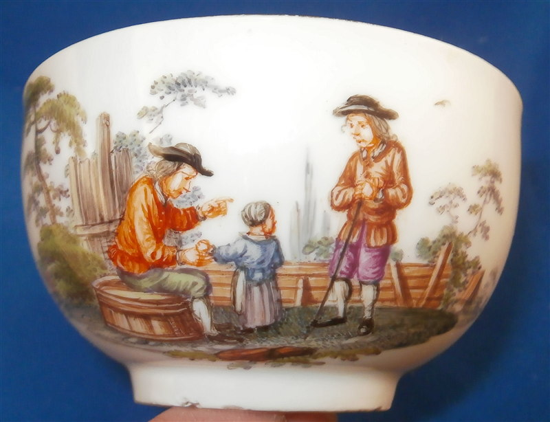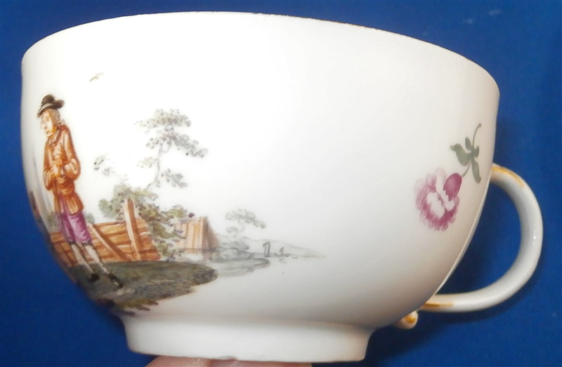 This is a cup and saucer made by Meissen in about 1750. Both are handpainted with a large scene after Teniers showing people in daily life. Nice gold trim to the rim. The saucer has a scene of four men loading or unloading a cart near a house and the cup a scene of two gentlemen with a little girl by some kind of wooden structure. The cup also has two nice flowers painted on it as well as a small floral arrangement on the bottom inside. Nice gold trim on the handle. I love these old scenes because they show life as it was back then - a snapshot of history. The set is in great condition with a tiny bit of wear - one spot in the scene of the saucer and one spot on the rim where the gold has flaked off on the saucer and a tiny bit of wear to the gold trim of the cup. Tiny chip on the footring resulting from a firing imperfection. The cup is 1.75 inches tall and has a diameter of 3.25 inches. The saucer is 1.125 inches tall and 5.125 inches in diameter. Both are marked with the underglaze blue crossed swords mark underneath as shown. Please email me for more information or other pictures.