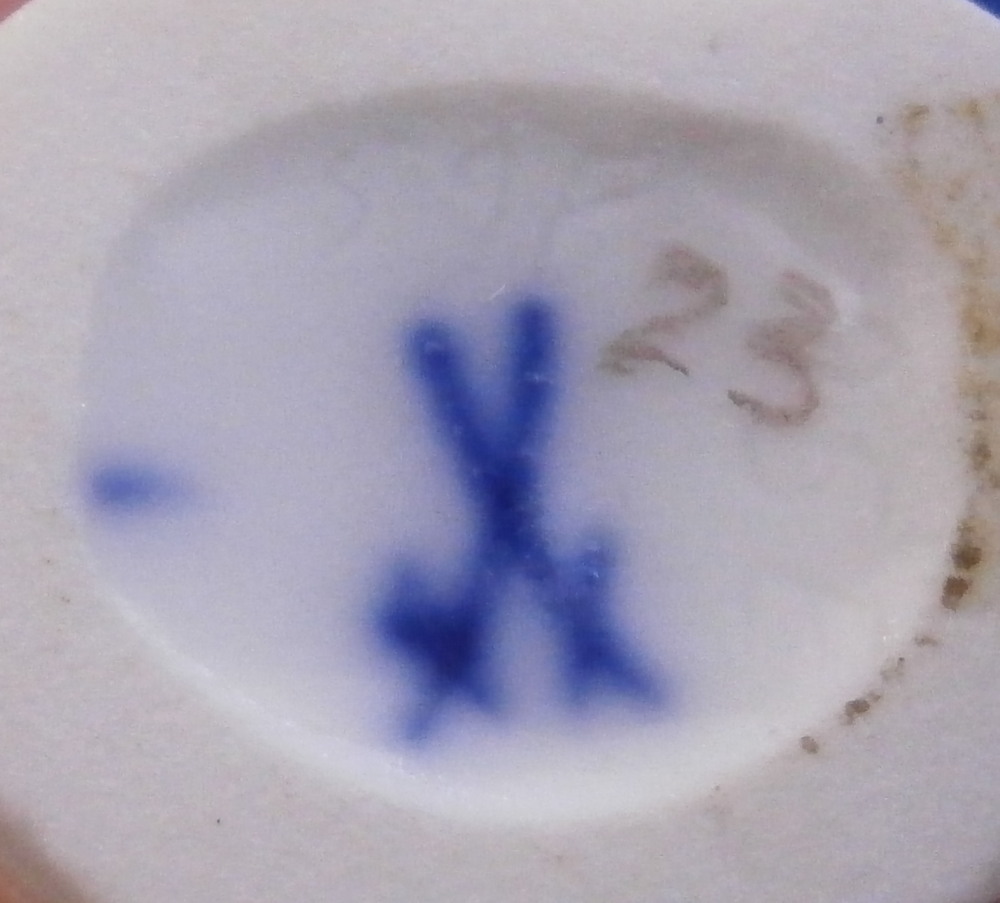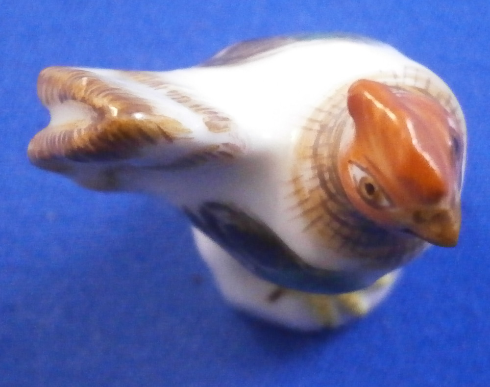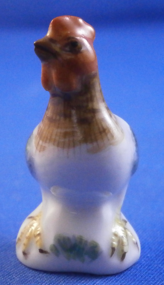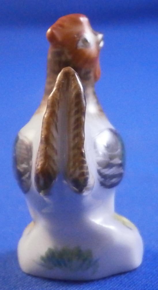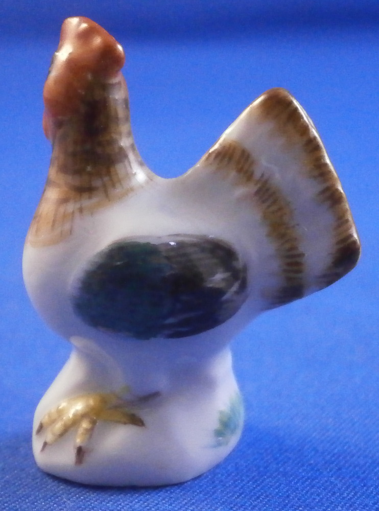 This is a superb miniature figurine of a colorful chicken made by Meissen in the 20th century. It looks to be a hen and is super cute! The piece is superbly modeled and hand painted with lots of detail. The bird is just over 1.25 inches tall, 0.625 inches wide and 1 inch long. The piece is marked underneath with the under glaze blue crossed swords mark as well as the usual impressed numbers and a painter's mark as shown. The figure is in perfect condition which is always a bonus. These tiny miniature are hard to find! Please email me for more information or other pictures.