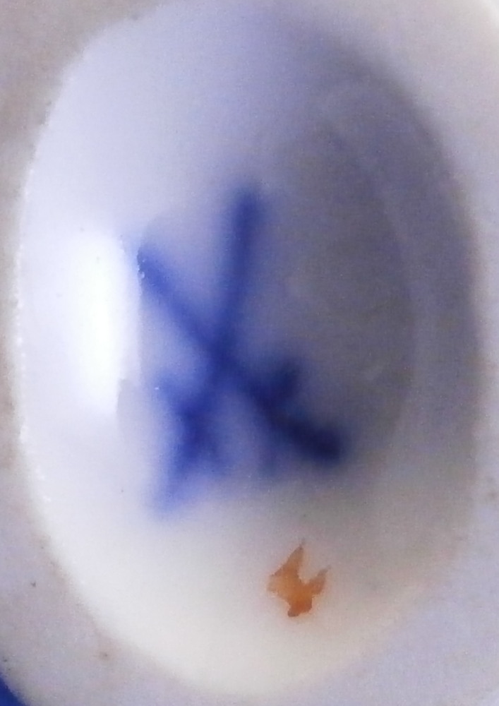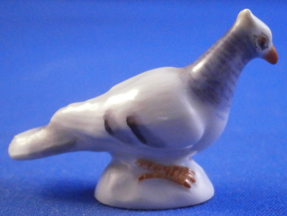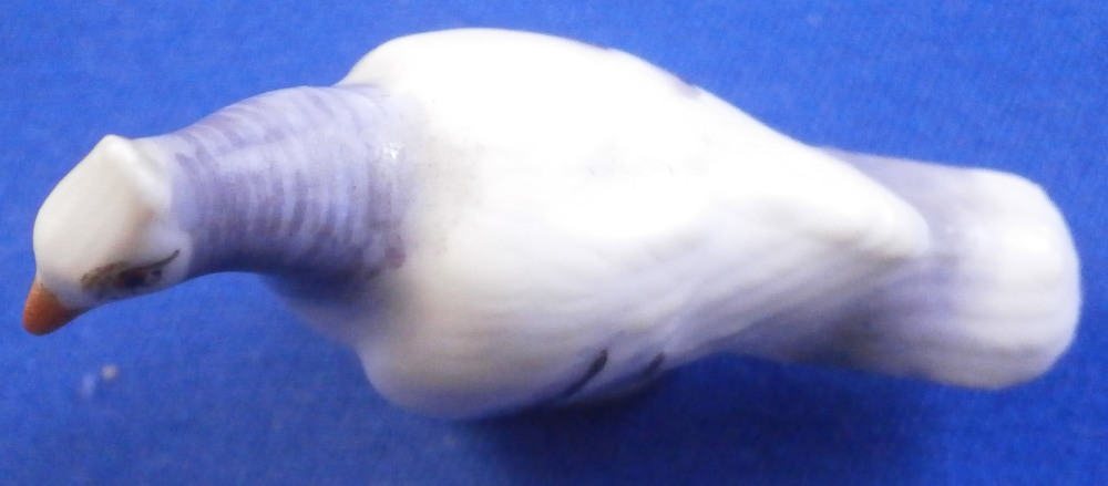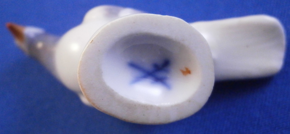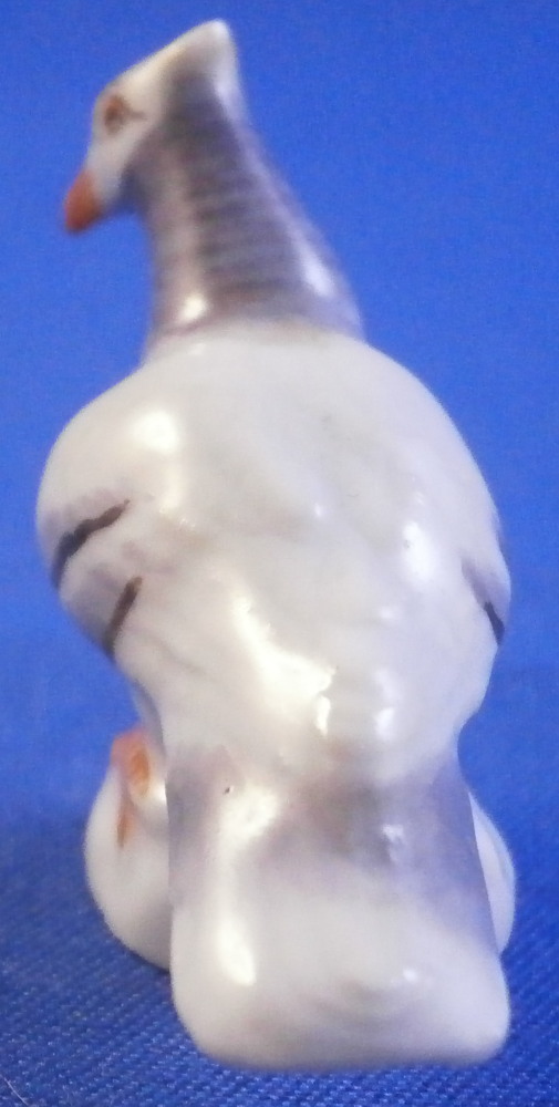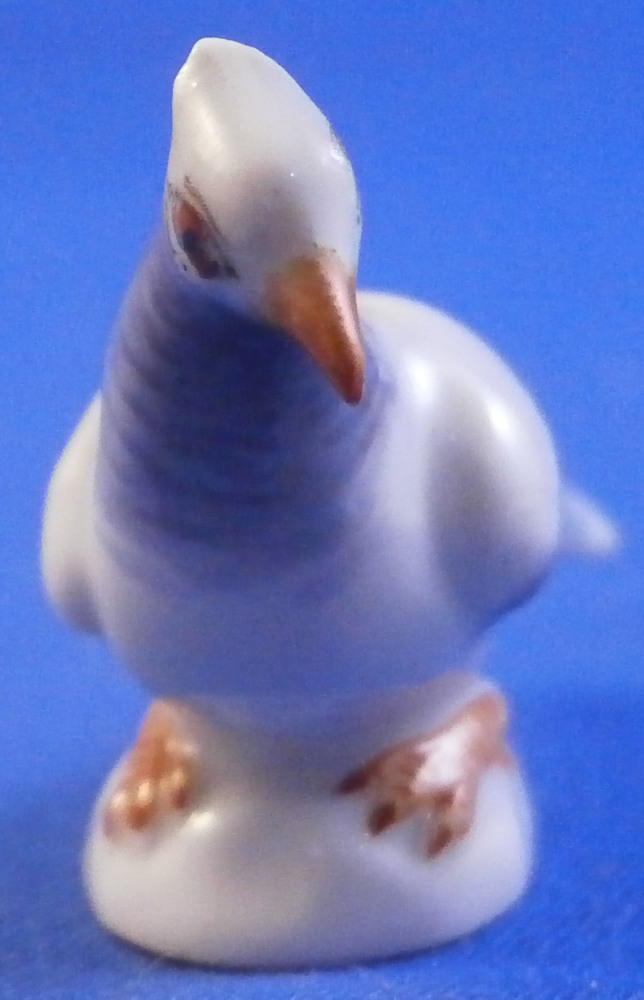 This is a really fun miniature pigeon bird figurine made by Meissen in the 20th century. The figure is super cute and a true miniature. It is just standing on the ground. Modeled with some nice detail and really nicely hand painted. Quite elegant. Amazing quality as one expects from the top maker in the world :) The figure is in perfect condition. It is marked underneath with the under glaze blue crossed swords mark as well as the usual impressed numbers and a painter's mark as shown. The piece 1 inch tall, just over 0.5 inches wide and 1.5 inches long. Please email me for more information or other pictures.