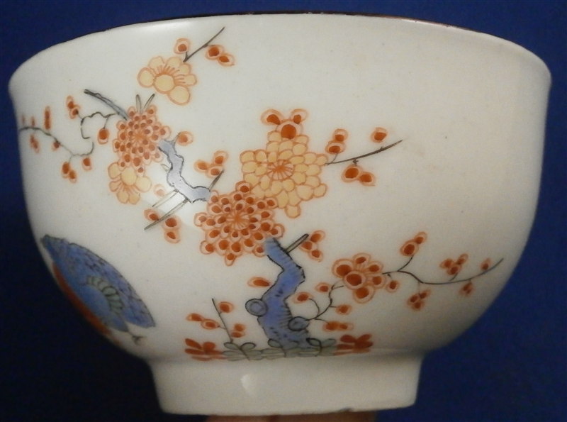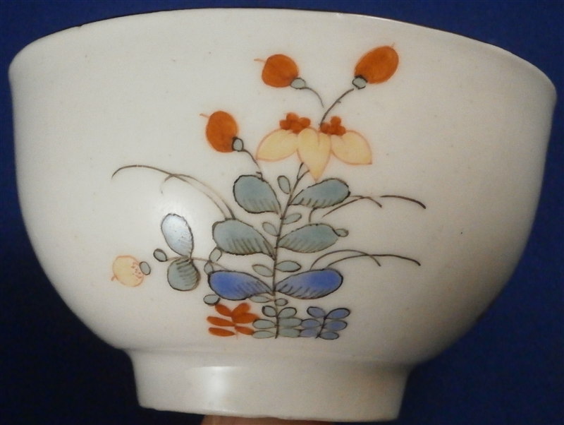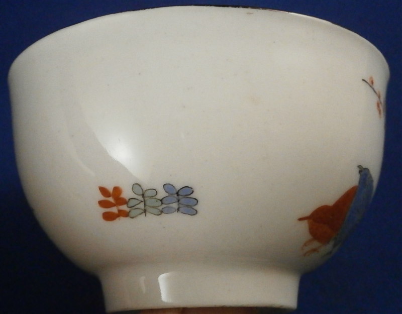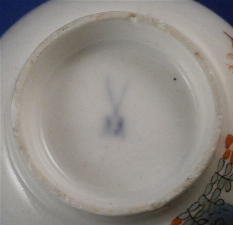 This is superb tea bowl / Koeppchen / handleless cup made by Meissen in about 1740. It is hand painted in the Kakiemon style with the well known two quails pattern that one can find on different makers of the porcelain world. It includes a flowering tree, a large flower as well as a small flower to the back side and off course the two fat quails in red and blue. Nice brown trim to the edge. Another flower to the inside the cup. Nice brown trim to the edge. Kakiemon colors of this period are some of my favorites and this is one very nice design! The cup is in great condition with a small repaired chip as shown. It displays perfectly! The piece is marked underneath with the crossed swords mark as shown as well as an impressed number. Please email me for more information or other pictures.