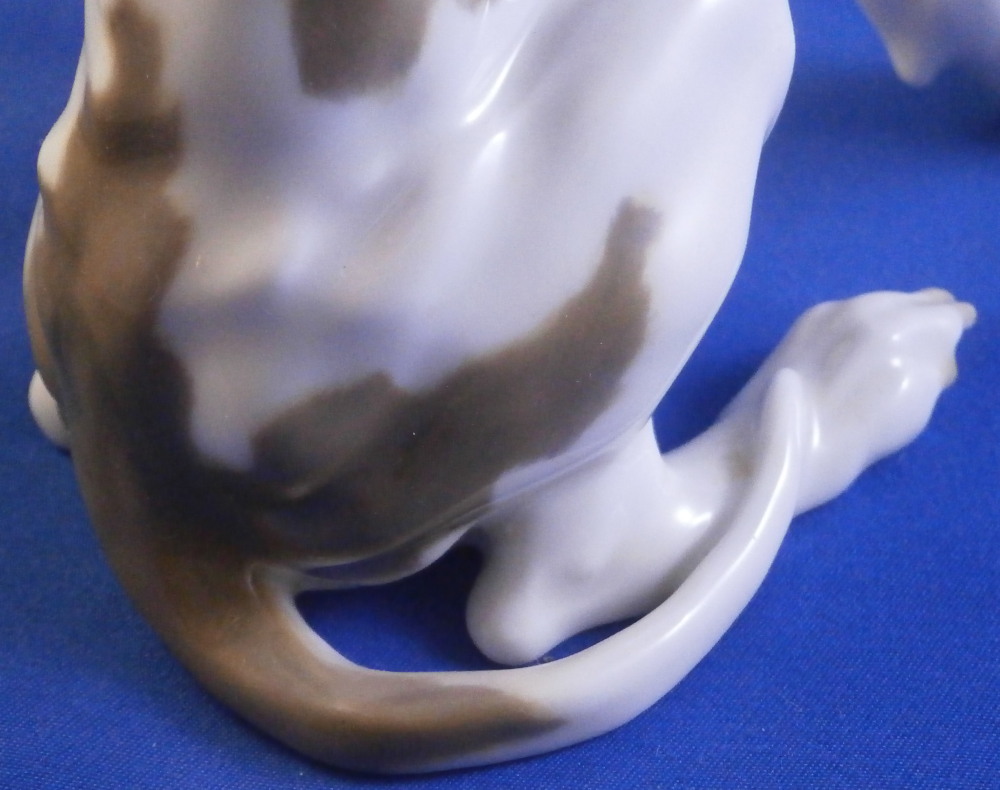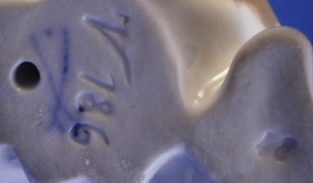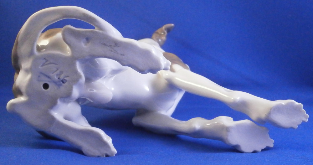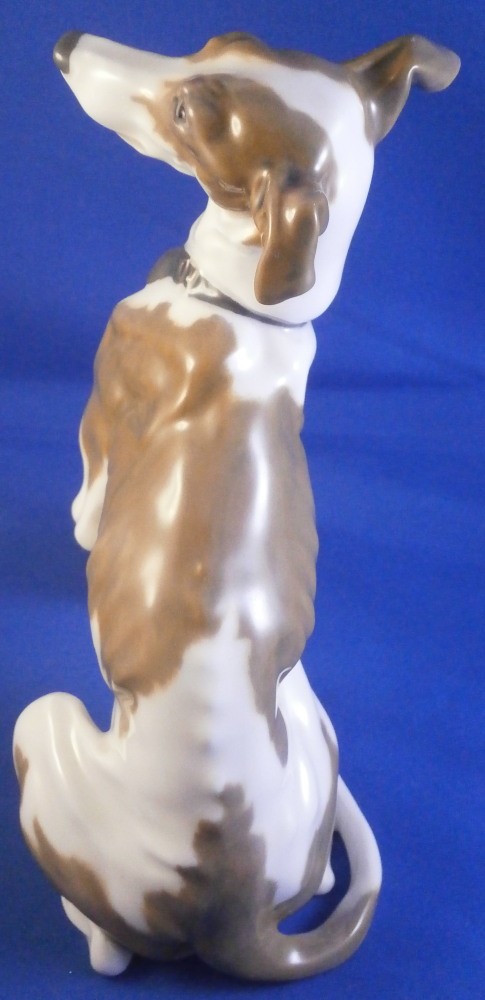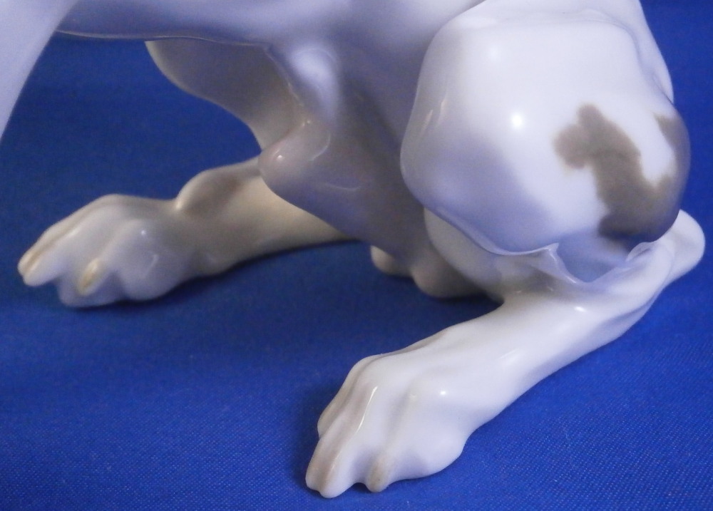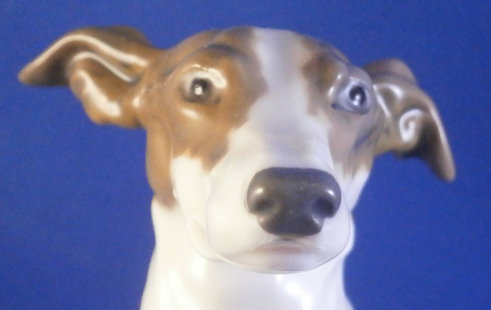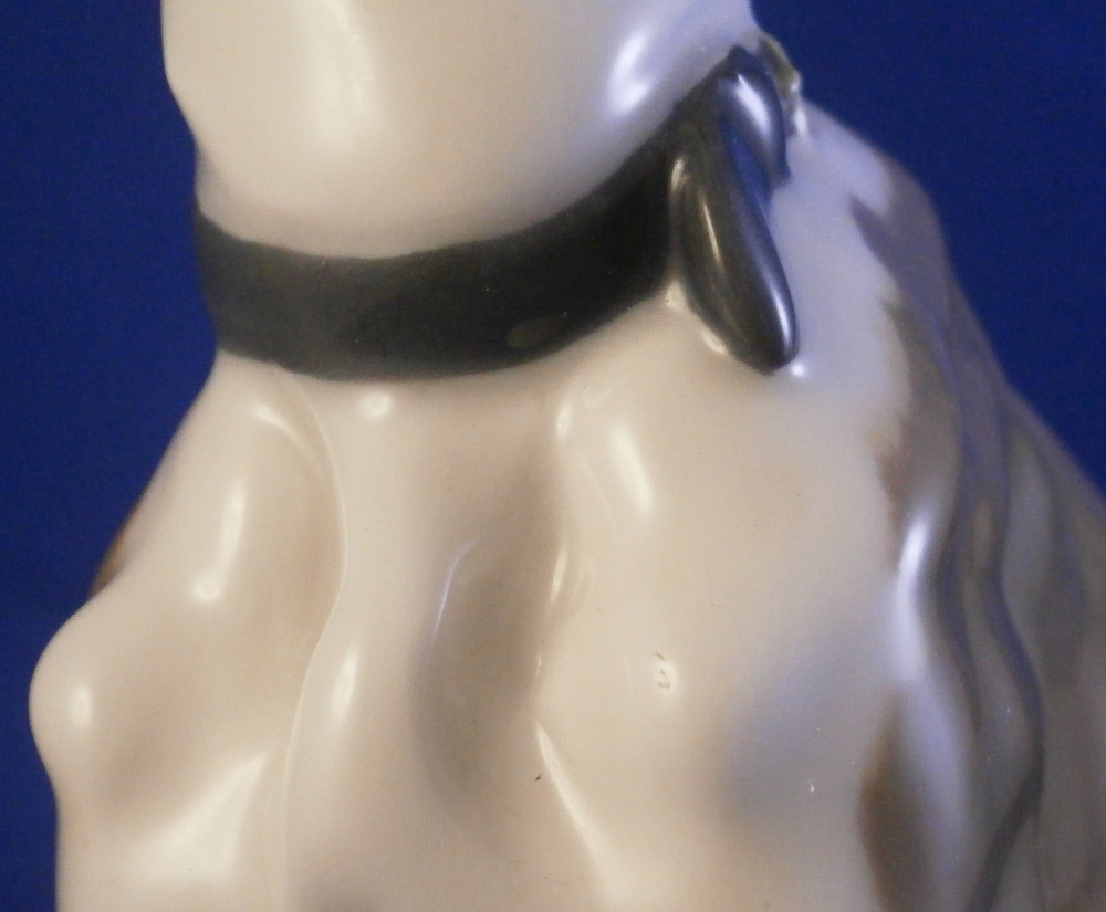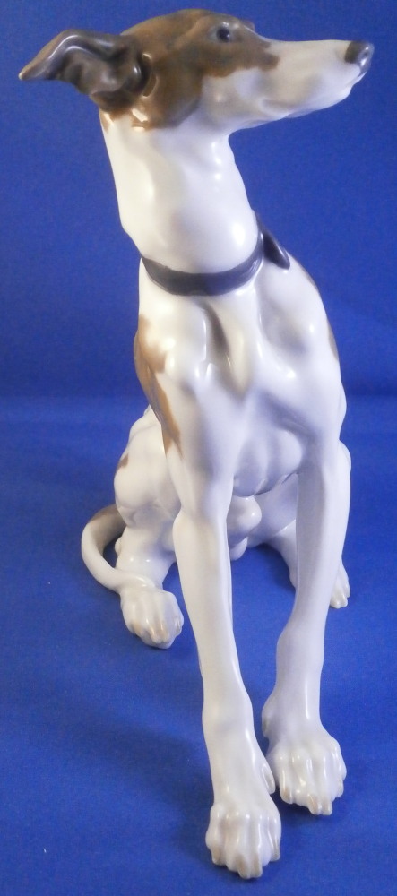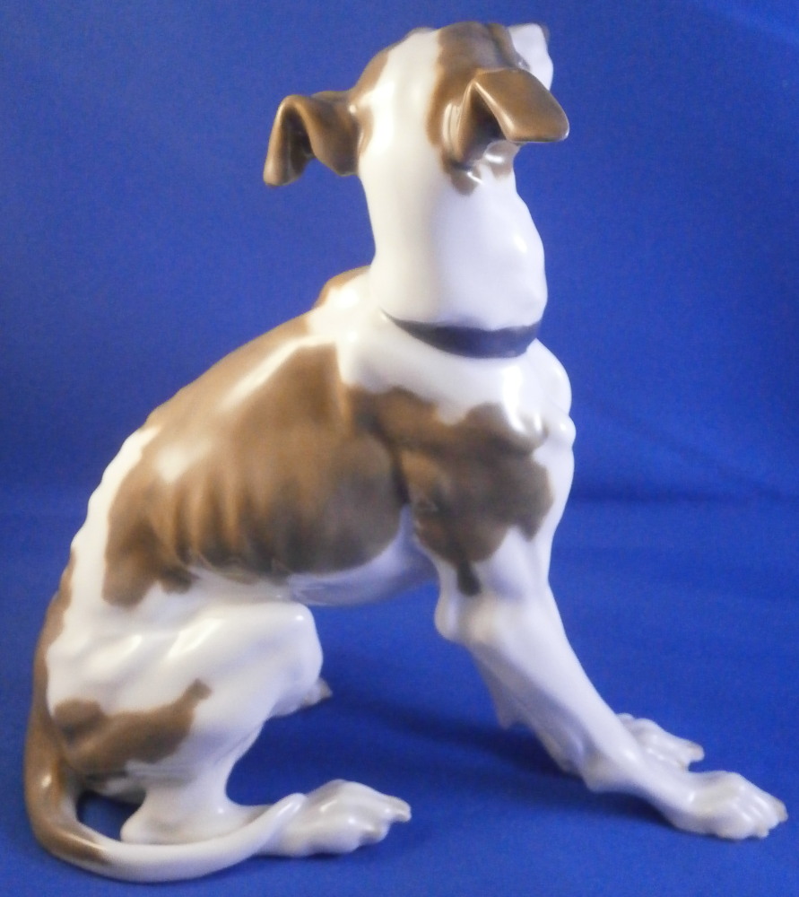 This is a superb figurine of a whippet / greyhound dog made by Meissen during the Pfeiffer period of the 20th century between 1924 until 1934. This is not a model you see often at all. and it is superb! The modelling is amazing and it is hand painted in the rare under glaze colors Meissen used occasionally on these types of figures mostly during the Art Nouveau / Jugendstil period. Look at all the detail in the modelling and hand painting! I especially love the collar around his neck. The coloration of the entire piece looks amazing! I think it was originally modlled by Paul Walther though I am not 100% sure of that part. Either way the figure is amazing and in perfect condition which is always a bonus. It is marked underneath with the blue crossed swords mark with the dot between the tops, the model number V186 and another impressed number as shown. The piece is 6.25 inches tall, just under 3 inches wide and 6.25 inches long. A really superb dog figurine - one of the nicest I have seen in a while. Please email me for more information or other pictures.