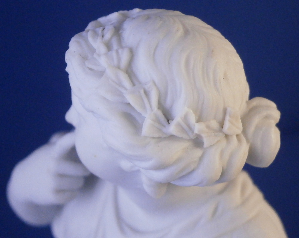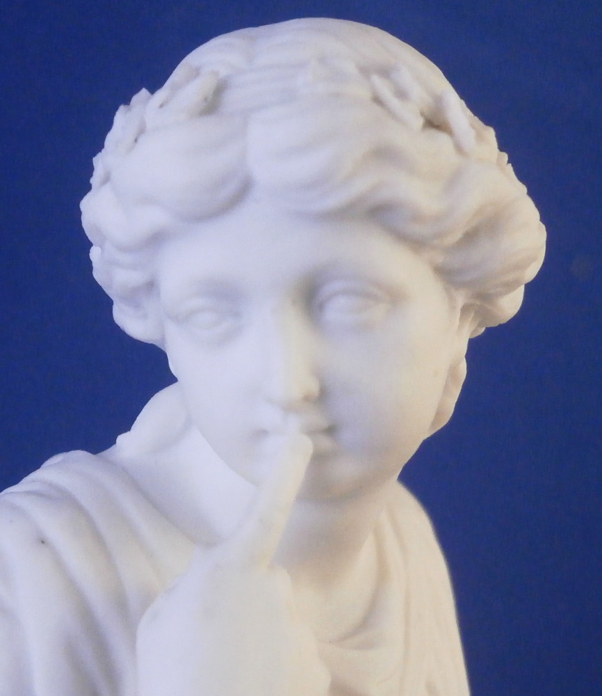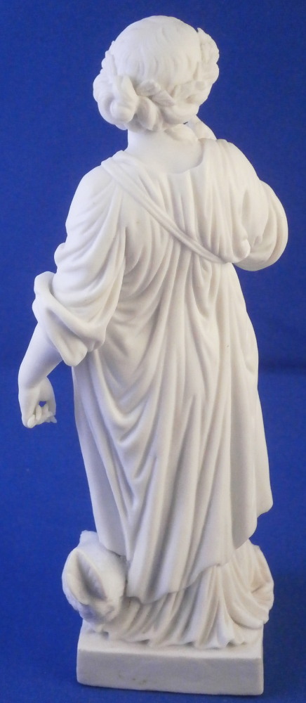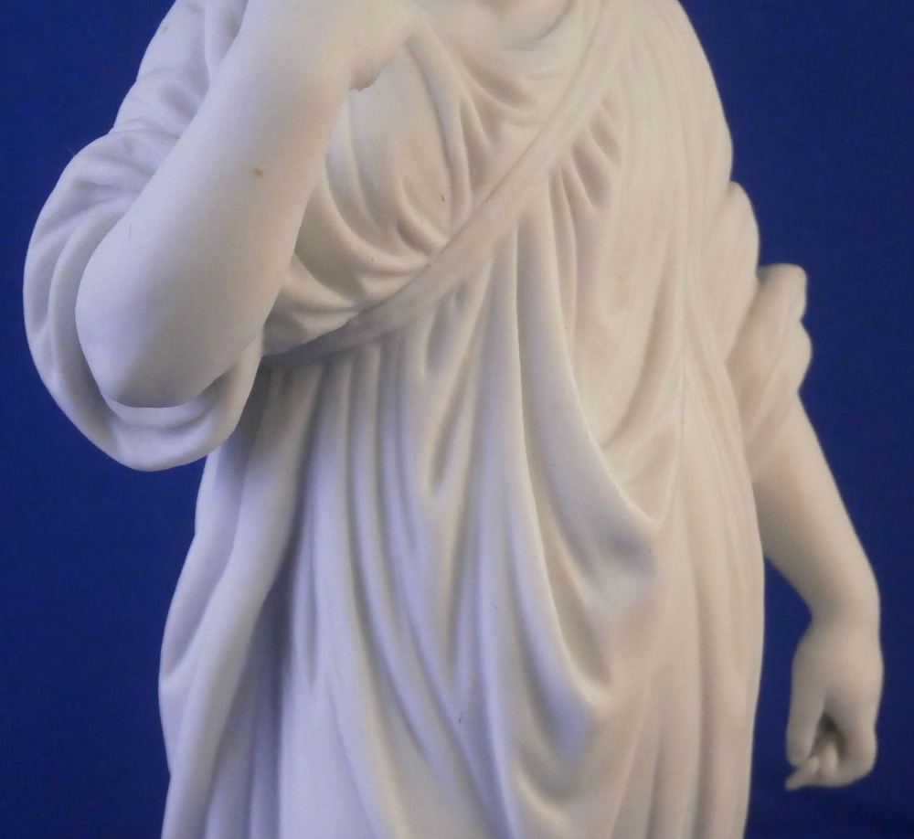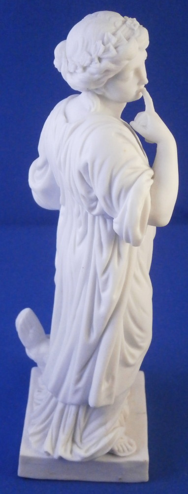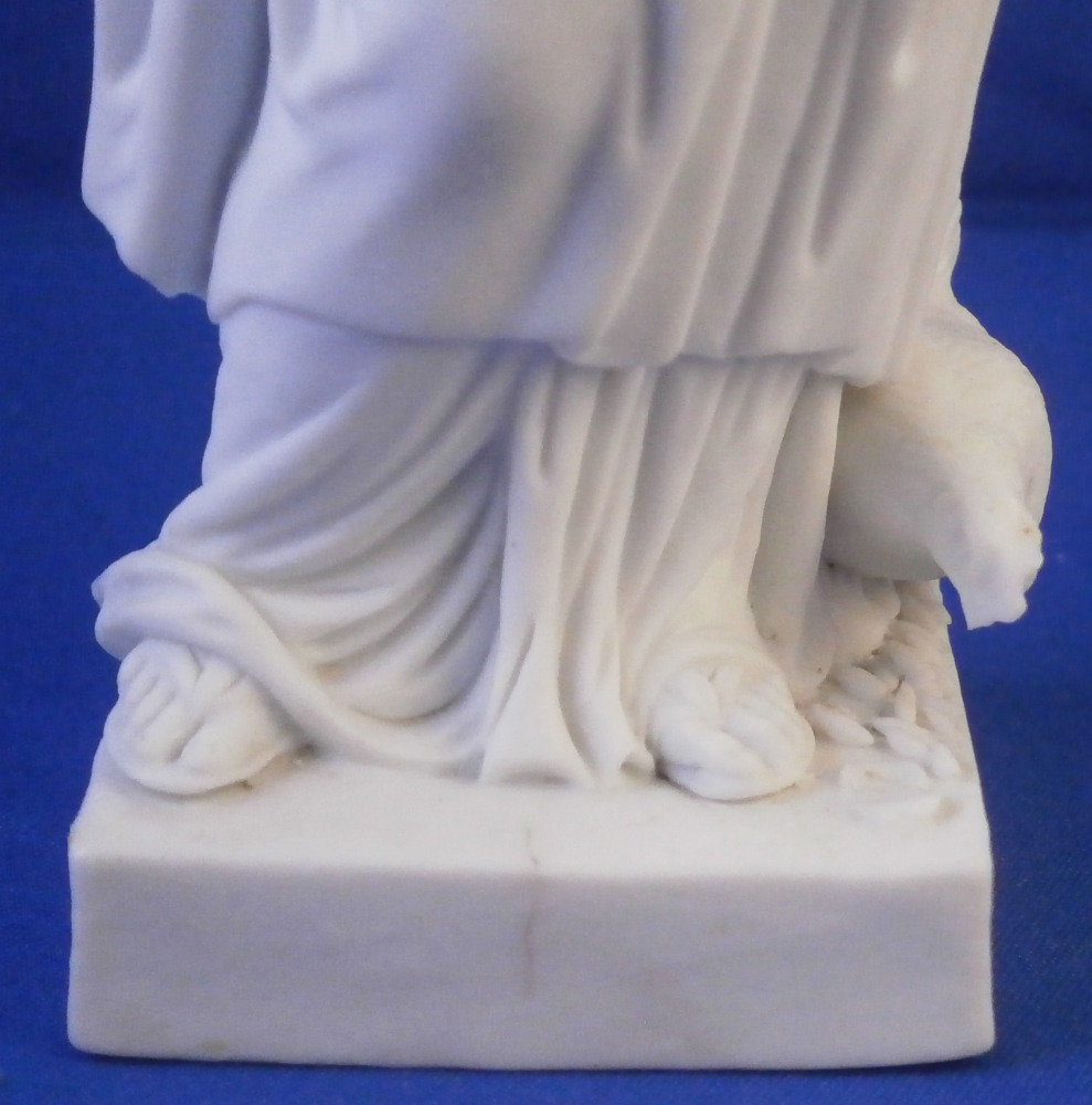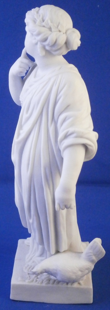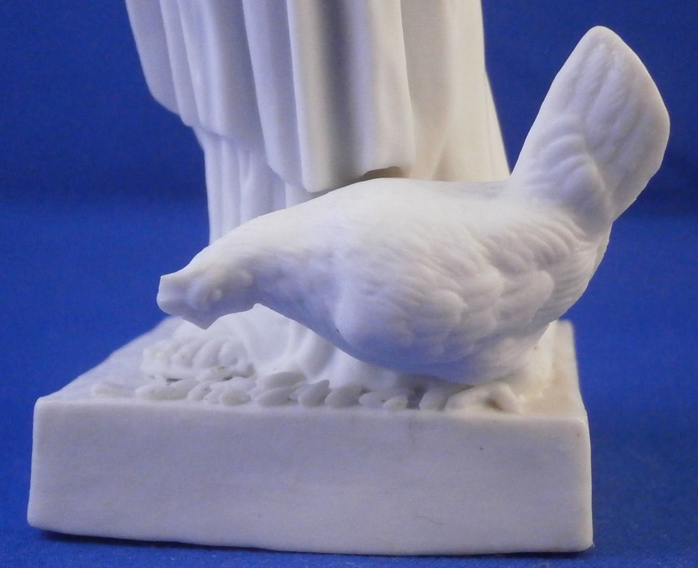 This is a rare unglazed porcelain figurine made by Meissen in the late 18th or early 19th century. The biscuit or bisque pieces are not easy to find from this period or any other made by Meissen and this one is a stunner. Meant to imitate marble they sure did a good job of doing that. I especially like them because the all the detail is not hidden by the usual glaze and thus even better than the usual Meissen pieces. The figure is of a lady feeding a chicken next to her. She is deressed in a long robeand wearing a leaf garland in her hair and sandals on her feet. The chicken is pecking at some seeds by her feed with more in her hand. One finger against her lips as if contemplating the leaning of life :) Or something less dramatic. The piece is marked with the incised triangle with the crossed swords inside as well as the model number. This mark was only used until 1814. The figurine is in superb condition with the leaves of the garland in her hair missing their tips, a tight firing crack to the front of the base that has stained slightly and possible a chip to the chicken's top of the head though I am not sure on that. Might jsut be how it was made. Having said all that the piece does display perfectly and looks amazing! The figurine is 6.125 inches tall, 2.25 inches wide and about 2 inches deep. Please email me for more information or other pictures.