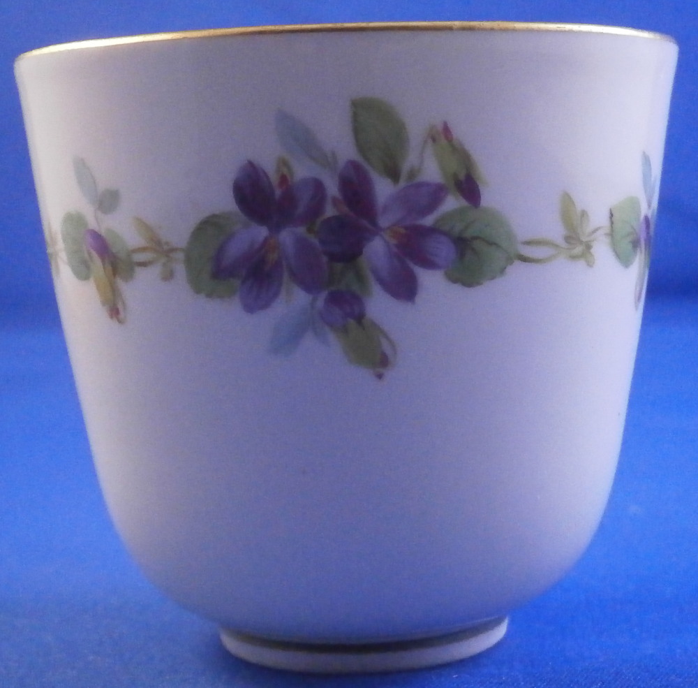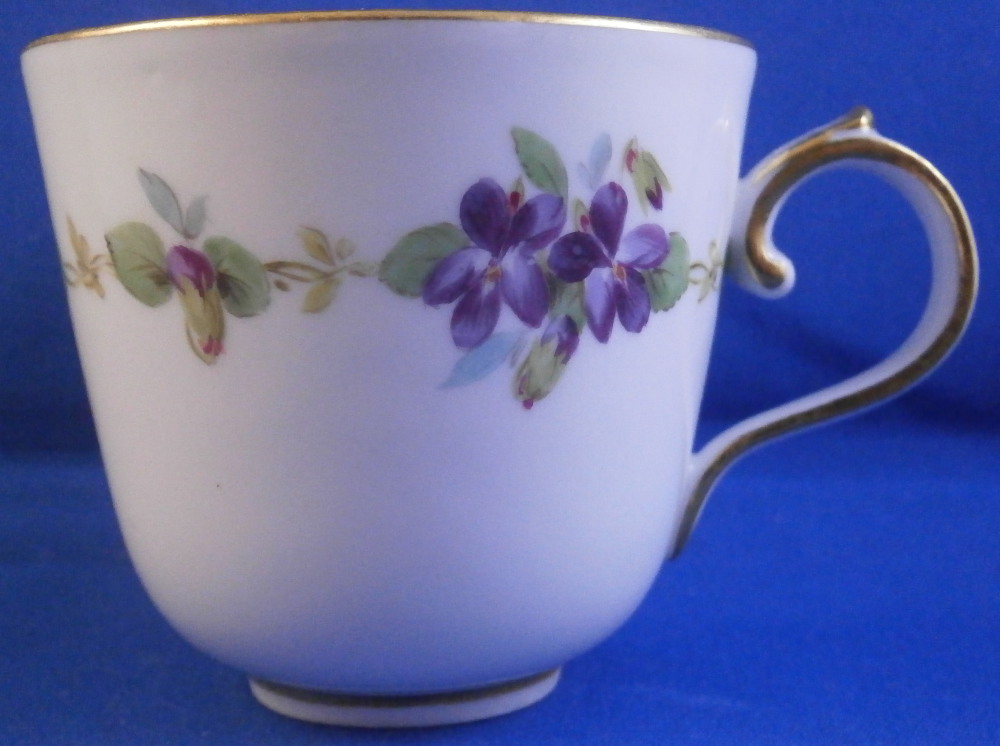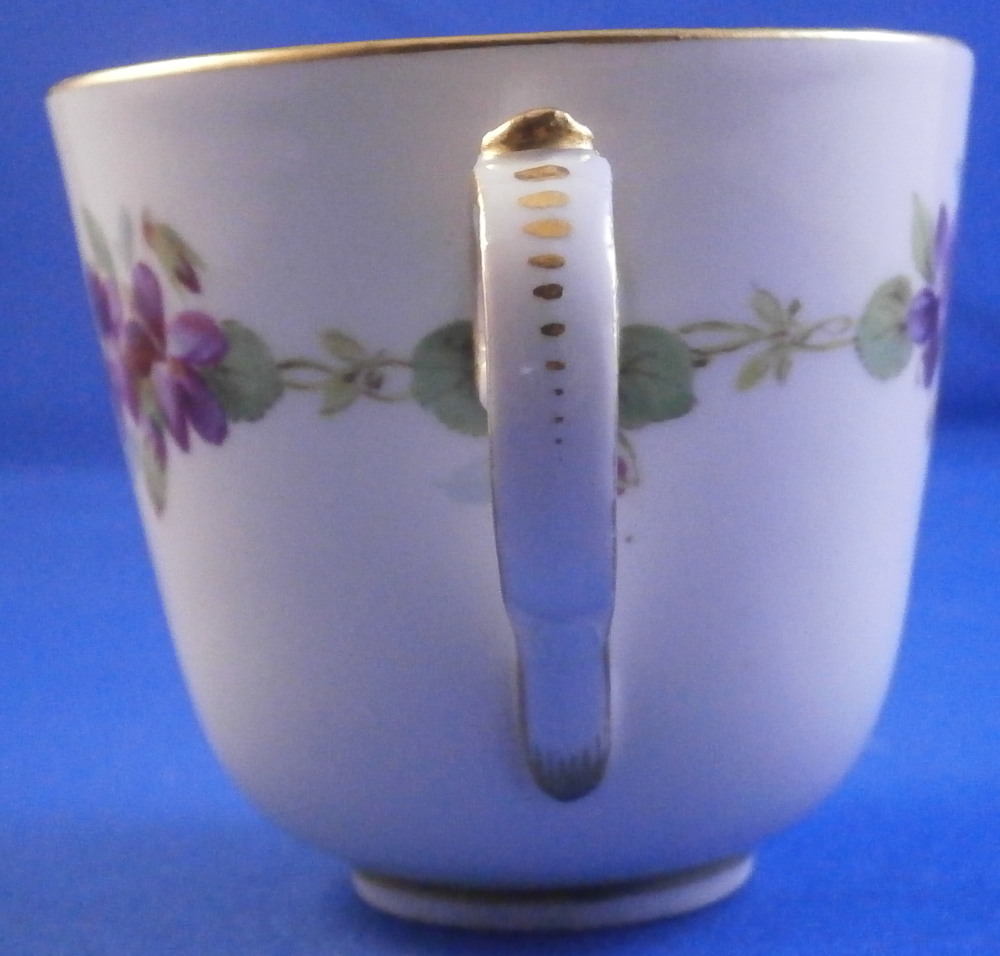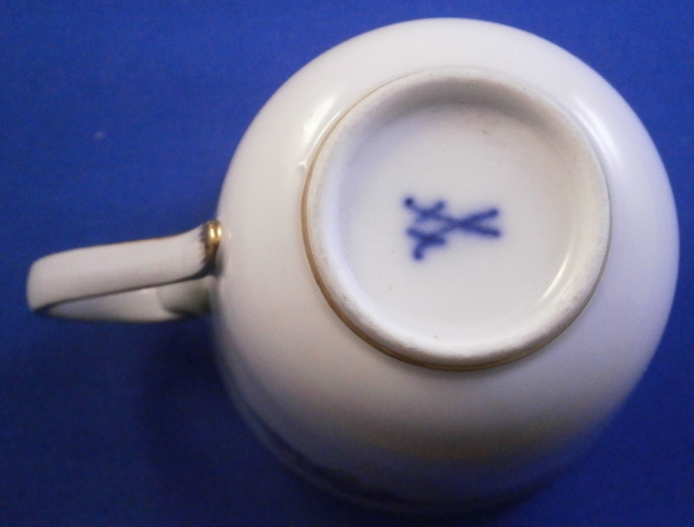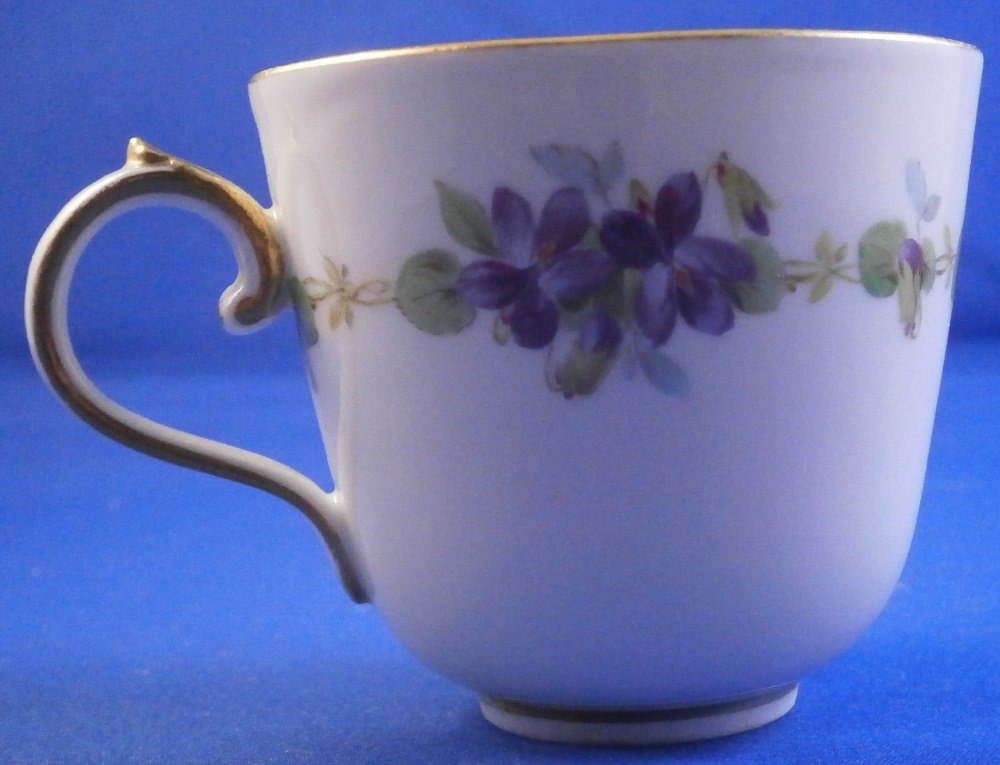 This is a cute smaller cup and saucer made by Meissen during the Art Nouveau / Jugendstil period of around 1900. Both pieces are hand painted with a cute violet flower garland design and some gold trim to the edges and nicely shaped handle and a gold ring around the well of the saucer. The set is in great condition with an odd stained spot to the inside of the cup (possibly from an old sticker but I have not been able to get rid of it). The violets on the cup are slightly lighter in shade than on the saucer but this color is notoriously difficult to deal with and any temperate difference will make it come out slightly different. They definitely belong together. The saucer is 1 inch tall and has a diameter of 4.75 inches. The cup is 2.25 inches tall and has a diameter of 2.5 inches. Both are marked underneath with the under glaze blue crossed swords as well as the usual impressed numbers common to Meissen pieces of this period and a red painter's number 35 on the saucer as shown. Please email me for more information or other pictures.
