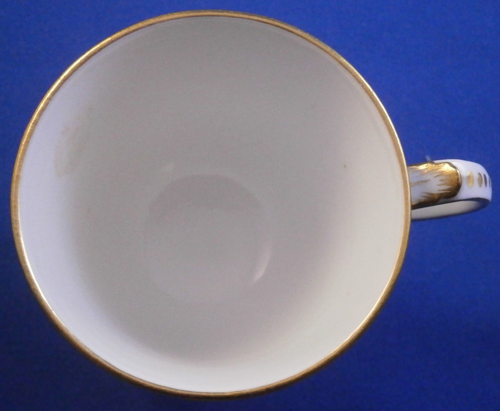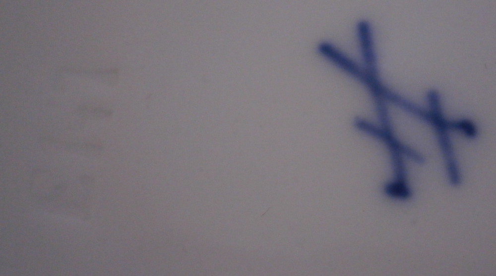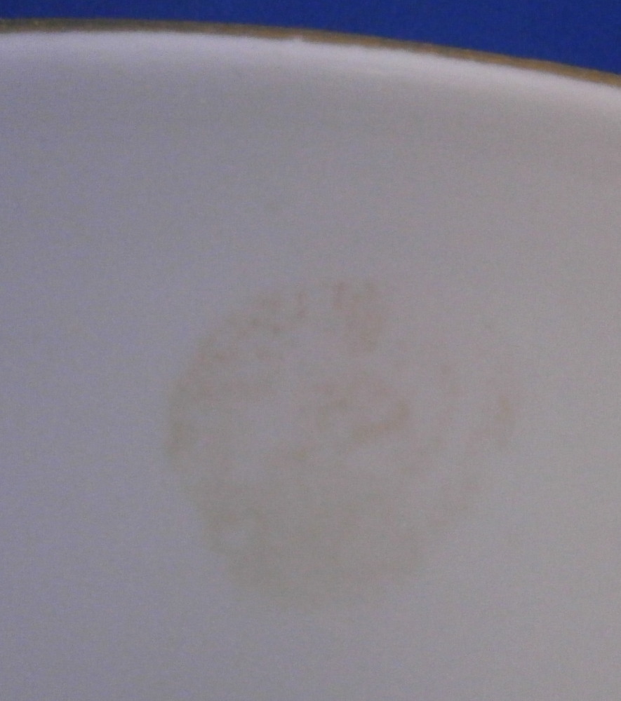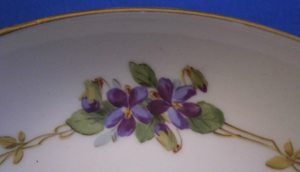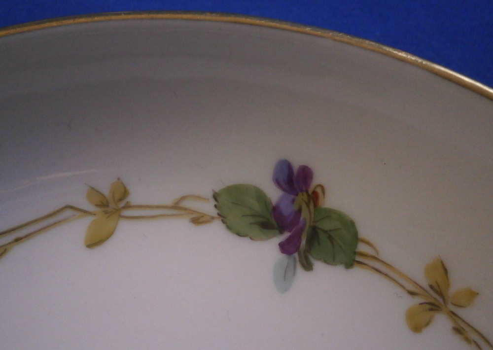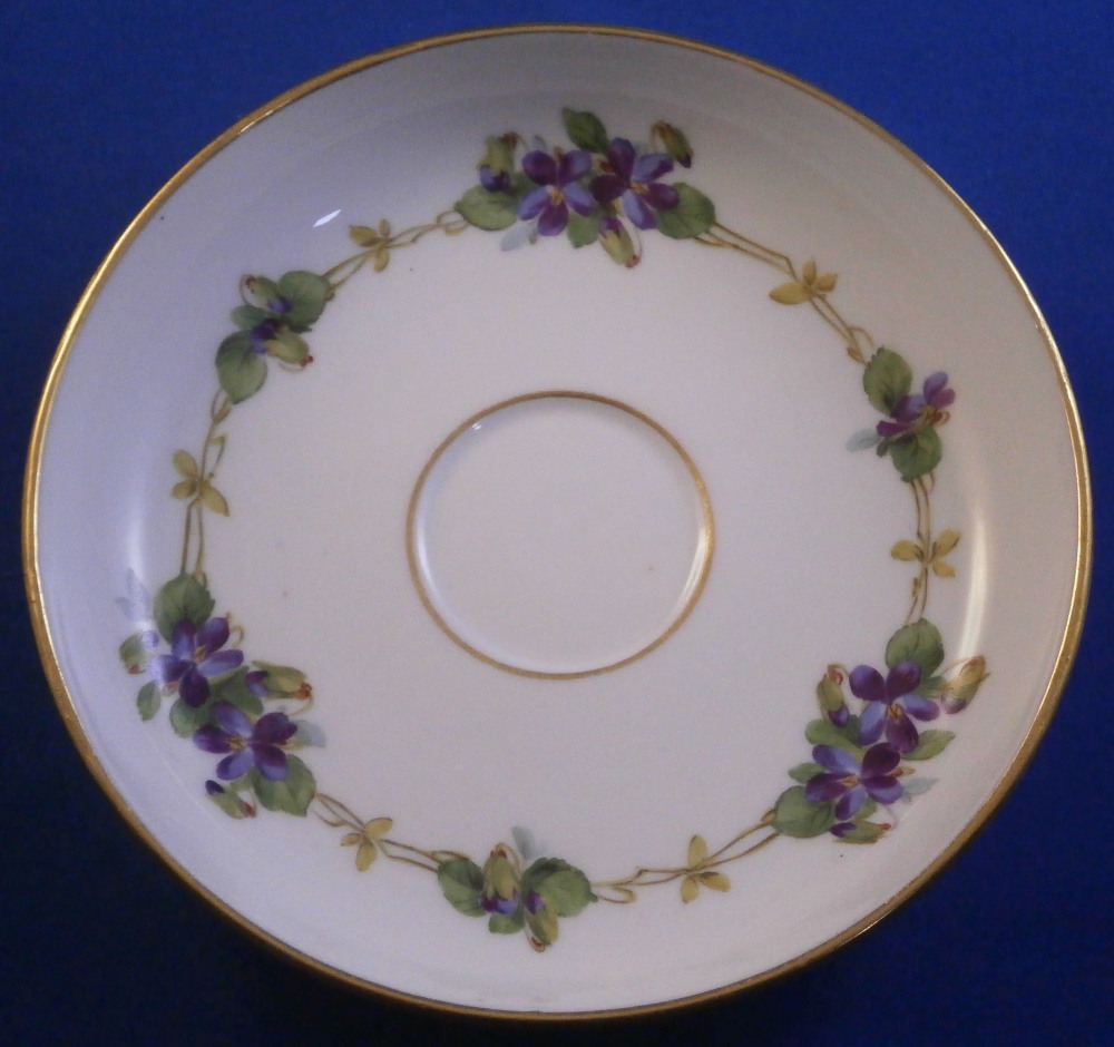This is a cute smaller cup and saucer made by Meissen during the Art Nouveau / Jugendstil period of around 1900. Both pieces are hand painted with a cute violet flower garland design and some gold trim to the edges and nicely shaped handle and a gold ring around the well of the saucer. The set is in great condition with an odd stained spot to the inside of the cup (possibly from an old sticker but I have not been able to get rid of it). The violets on the cup are slightly lighter in shade than on the saucer but this color is notoriously difficult to deal with and any temperate difference will make it come out slightly different. They definitely belong together. The saucer is 1 inch tall and has a diameter of 4.75 inches. The cup is 2.25 inches tall and has a diameter of 2.5 inches. Both are marked underneath with the under glaze blue crossed swords as well as the usual impressed numbers common to Meissen pieces of this period and a red painter's number 35 on the saucer as shown. Please email me for more information or other pictures.