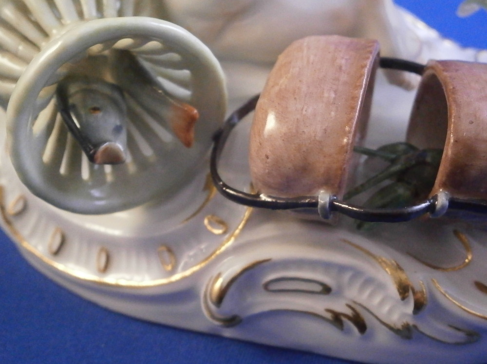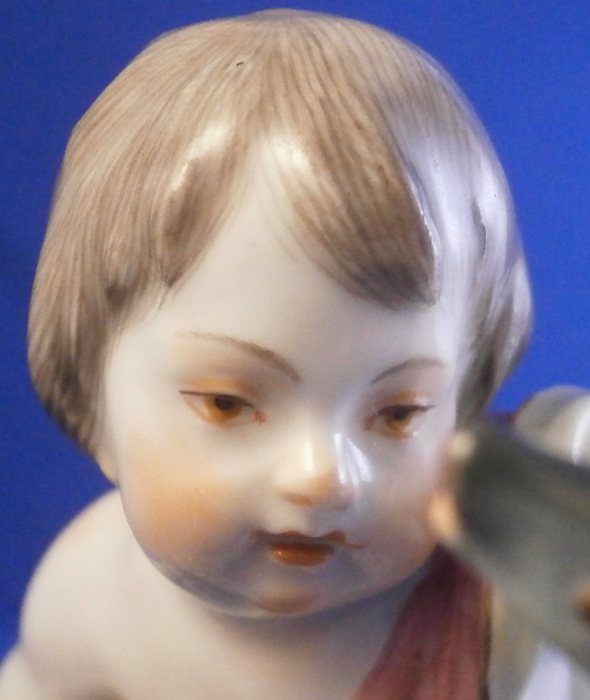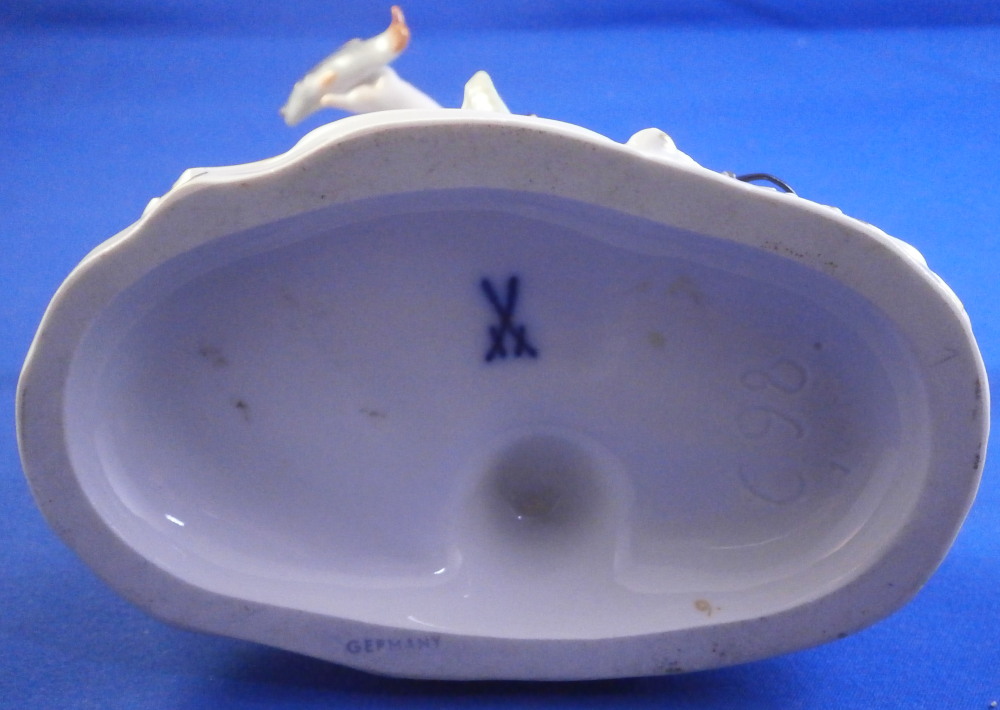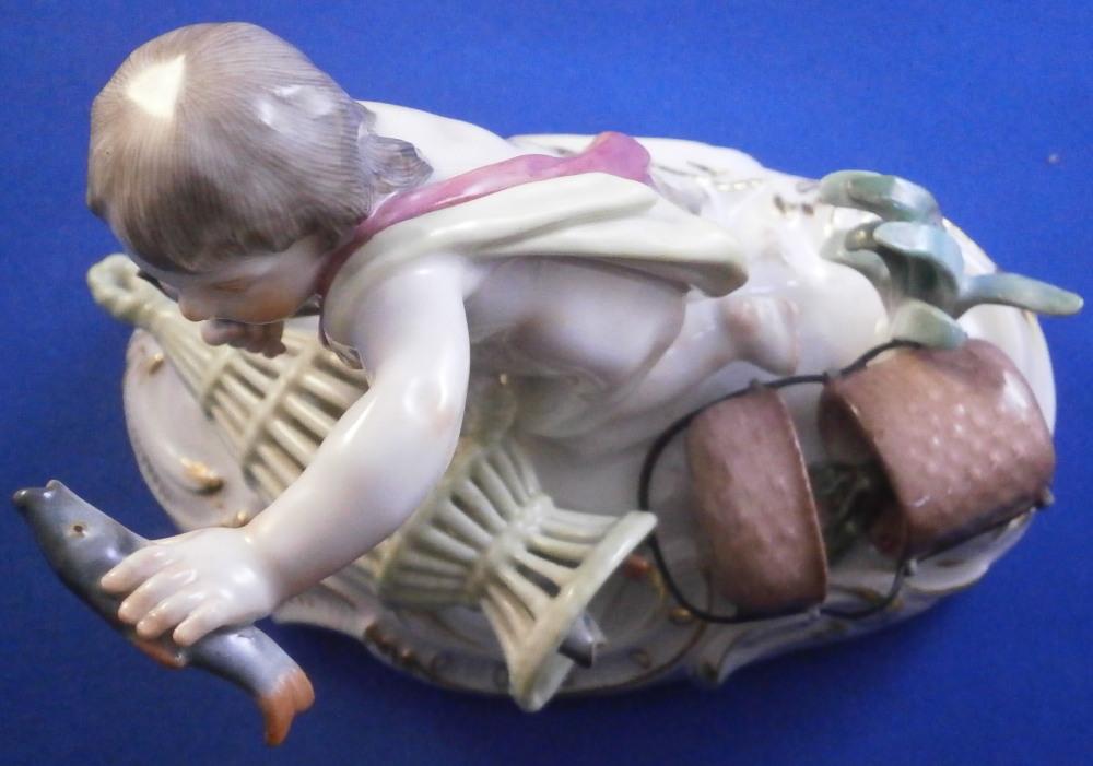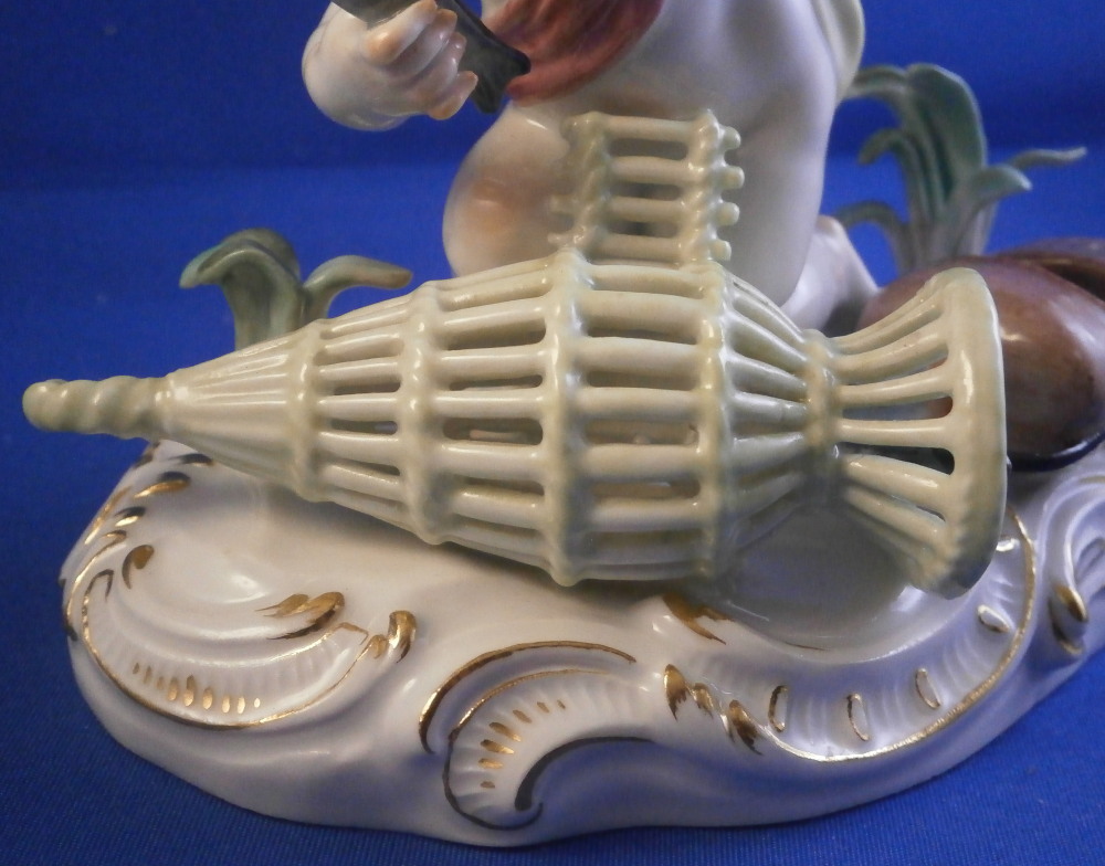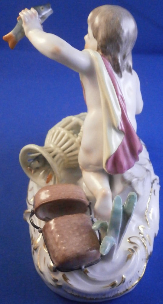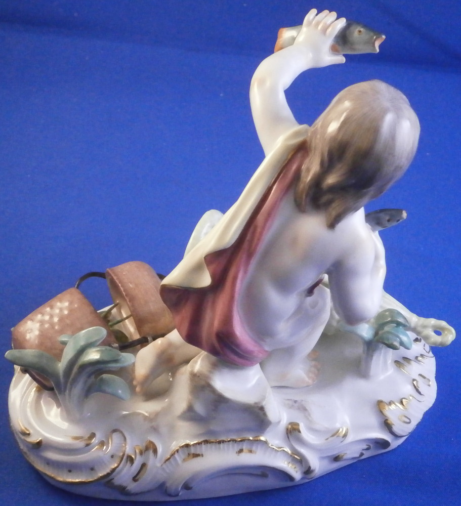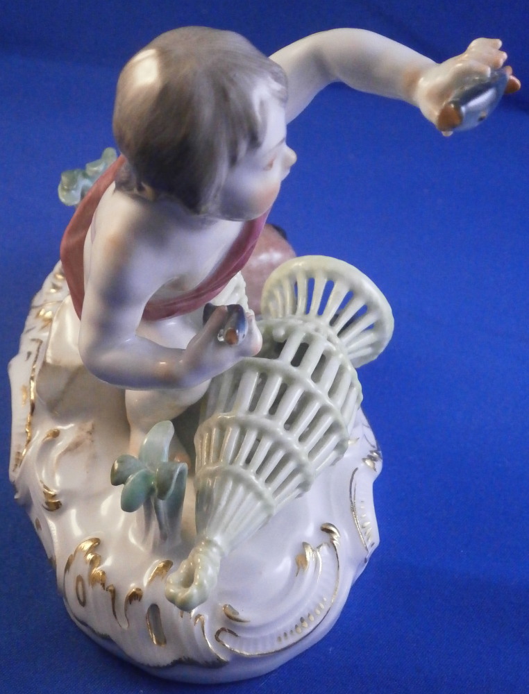 This is a really nice figurine emblematic of the element of water made by Meissen in the mid 20th century. Not a rare figurine by any means but what is very rare about this piece is that it is in almost in perfect condition - just a tiny thin glaze flake to the bottom edge which is invisible unless you hunt for it. The piece is of a putto holding a fish in his upper hand, another fish in his lower hand, there is a primitive fish trap in front of him and a basket with its straps next to it that has a lobster in it. Two reeds growing out of the base which has lots of scrolls all around highlighted with gilding. This figure is one from the series of elements. I also have air and earth but there is one more out there - fire.The figure is very well modeled and hand painted. It looks stunning on its own or even nicer in the set. The figurine is 4.125 inches tall, 5 inches wide and 3 inches deep. It is marked with the crossed swords mark underneath the base (first choice) as well as the usual impressed / incised marks, a painter's mark and Germany in blue on the edge. Please email me for more information or other pictures.