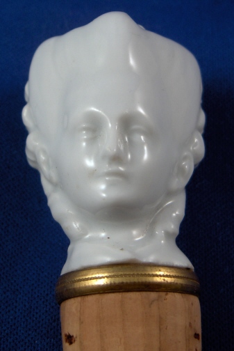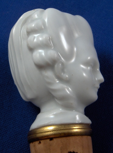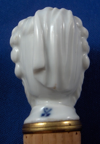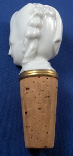 This is a bottle stopper made by Meissen during the Pfeiffer period (about 1927). It is in the form of a lady which I think might be Marie Antoinette. Left in the white to show off all the modeling detail it is quite a nice piece! The porcelain head is connected with a screwlike metal piece to a cork which is still the original one! The cork has a decorative metal ring to the top that is golden in color - might be brass or gold plated or bronze. The cork is original and doesn't look like it was ever used. The porcelain head is in perfect condition as is the rest. The stopper is marked in the back with the underglaze blue crossed swords with the dot in between the tips. When you take the cork off the porcelain is marked with an incised 1. The entire piece is 3.5 inches tall. The cork is 1.625 inches long and 0.875 inches in diameter. The head is 1.75 inches tall and 1.375 inches wide. The metal screw is one inch long. Please email me for more information or other pictures.