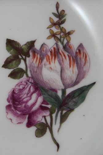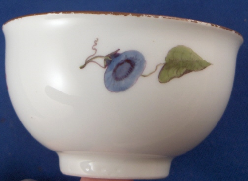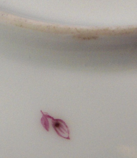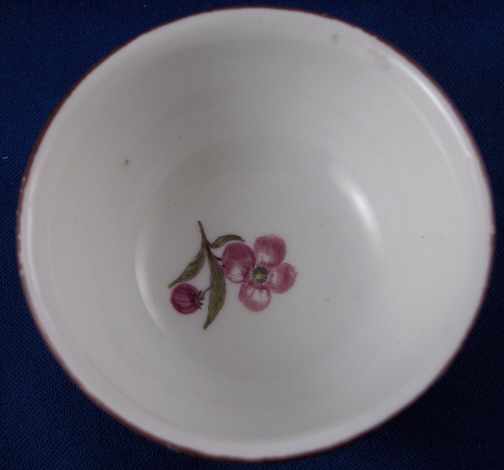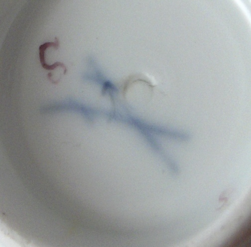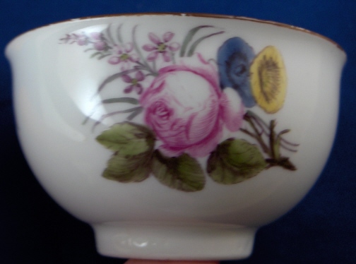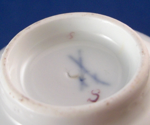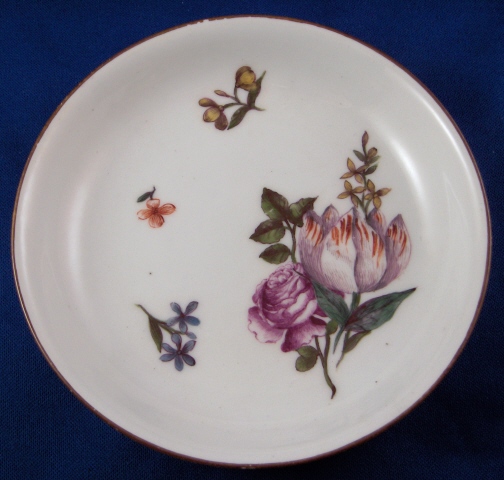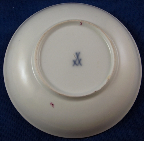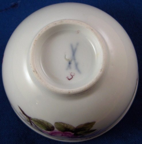 This is an early cup and saucer made by Meissen in the 1740's. Both are handpainted with flowers in the woodcut style with the ones on the teabowl already showing the influence of the the Deutsche Blumen style that took hold around this period. The saucer has a large floral arrangement on one side and three smaller ones next to it with the cup having a large floral arrangement to one side with three small flowers on the other side and another on the inside bottom. Both pieces also have a the nice brown trim to the rim. The set is in great condition with some very minor wear to the brown trim. The cup is 1.625 inches tall and just under 3 inches in diameter. The saucer is 1 inch tall and 4.875 inches in diameter. They are both marked with the underglaze blue crossed swords mark that are straight from around 1740 and a puce painter's mark S. There is an impresssed 3 under the cup. Please email me for more information or other pictures.