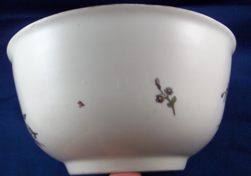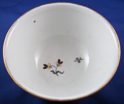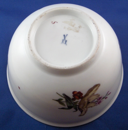 This is an early 18th century Meissen bowl dating to the 1740's. It is handpainted with two larger flower arrangements in the old woodcut style so pre 1750, two smaller flowers, a tiny leaf on the outside and two flowers and a tiny leaf (these are usually to hide tiny defects like firing spots) on the inside. Gold trim to the top edge. This was most likely a waste or slop bowl. The bowl is 3.125 inches tall and 6.25 inches in diameter. It is marked underneath with the early Meissen blue crossed swords in underglaze blue and a painters mark of the letter S. The bowl is in great condition but I think the gold trim was redone which is certainly nothing major :) Please email me for more information or other pictures.