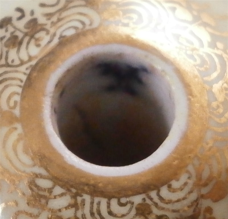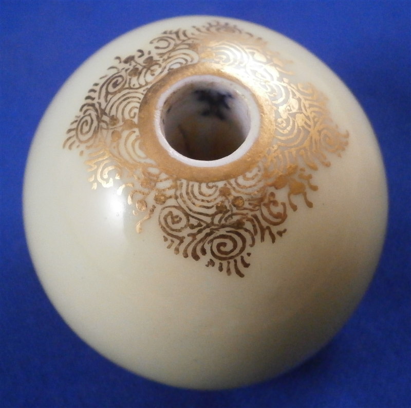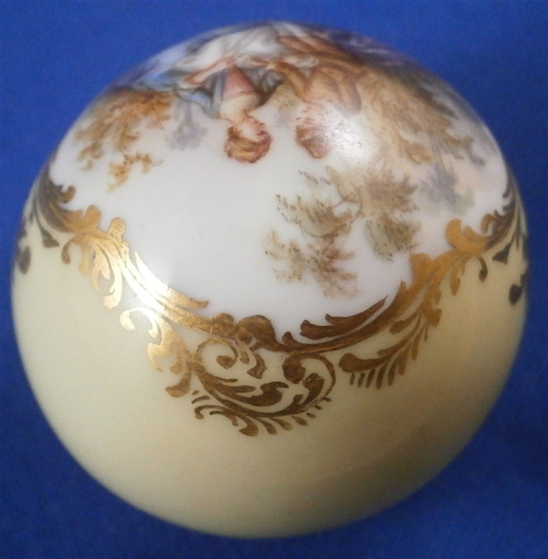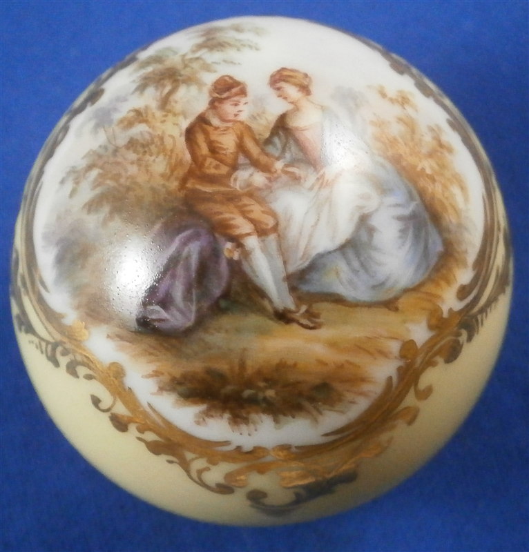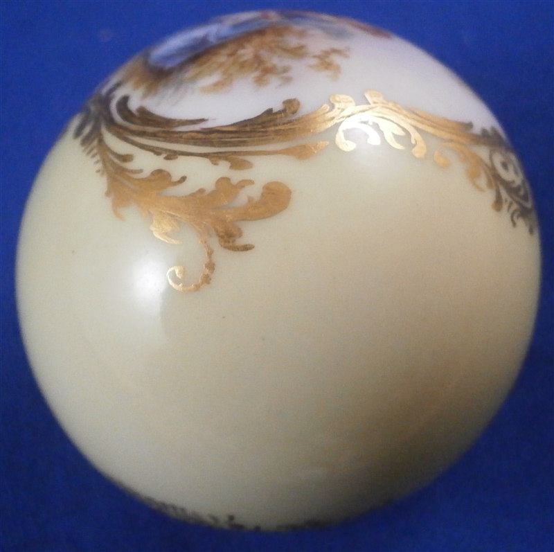 This is a small cane or umbrella handle made by Meissen in the late 19th or early 20th century. It is in the shape of a ball and is in perfect condition. The piece is hand painted with a very high quality detailed couple in a landscape scene on the top part surrounded by some very nice gilding with the rest of the piece having a nice yellow ground color and some more fancy gilding around the hole for the cane as shown. It was probably never used or used very few times. The piece is marked on the inside hole where it usually would not be visible when attached to a cane or umbrella. The handle is 1.5 inches in diameter and the inside diameter of the hole is just over 0.25 inches. Please email me for more information or other pictures.
