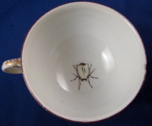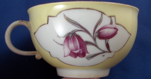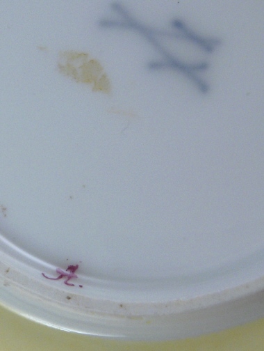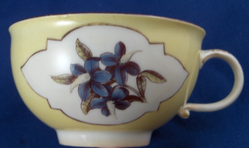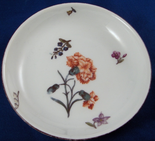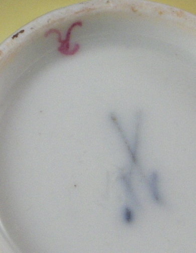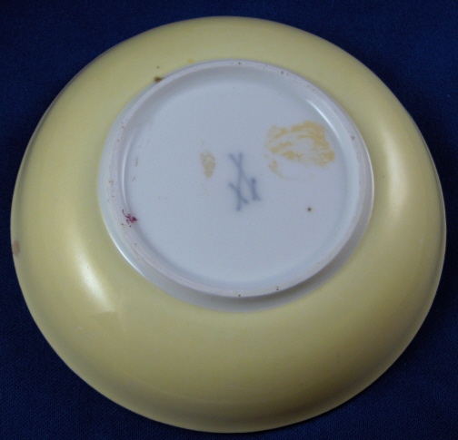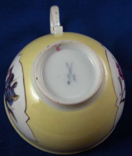This is an early cup and saucer set made by Meissen in about 1740. The cup is nicely painted with two woodcut style flowers on white ground srrounded by a nicely shaped trim with the rest of the cup having a superb light yellow ground color. The simple handle shape has a bit of gold trim on it and the top rim has a brown trim. Inside is a handpainted bug with its shadow - something only used for a short time period and attributed to the painter Klinger. The saucer is nicely handpainted with one larger flower as well as five smaller flowers scattered throughout with a nice brown trim to the rim. In this case the underside of the saucer is painted with that same light yellow ground color which is very nice! The set is marked with an early version of the blue crossed swords underneath as well as a puce painters mark as shown. The set is in great condition with a shallow outside rim chip to each piece which was filled in but could be improved upon easily. A little bit of wear to the brown trim and two spots on the flowers of the saucer. The saucer is 1 inch tall and 4.875 inches in diameter and the cup is 1.75 inches tall with a diameter of 3.125 inches. Please email me for more information or other pictures.