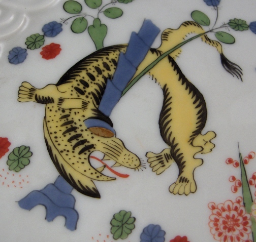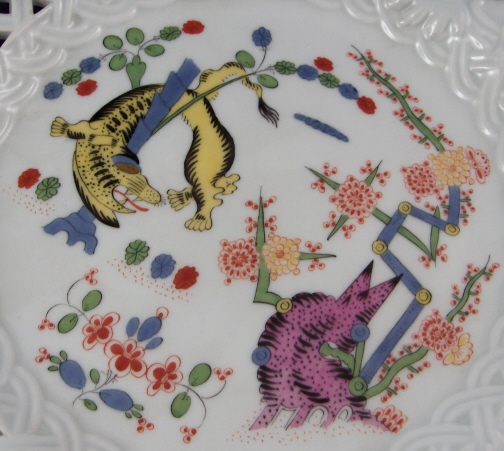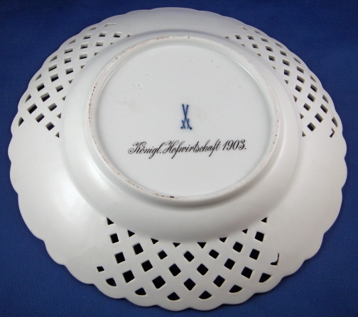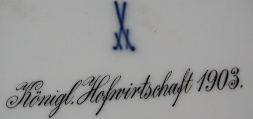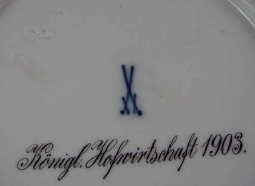 This is a rare porcelain plate made by Meissen in 1903. It is handpainted with the superb yellow Tiger pattern made for the Saxon Royal Court. A very rare design on a nicely reticulated plate made for royalty and likely still used by them - it does not get much bettter than this!! This plate is in perfect condition. It is 1.5 inches tall and 9.25 inches in diameter. It is marked underneath with the underglaze blue crossed swords as well as the usual impressed numbers and has the black writing for the royal kitchen underneath - Koenigliche Hofwirtschaft 1903 . Please email me for more information or other pictures.