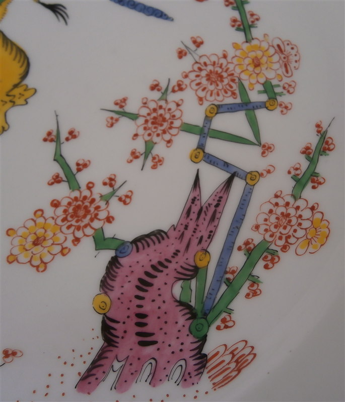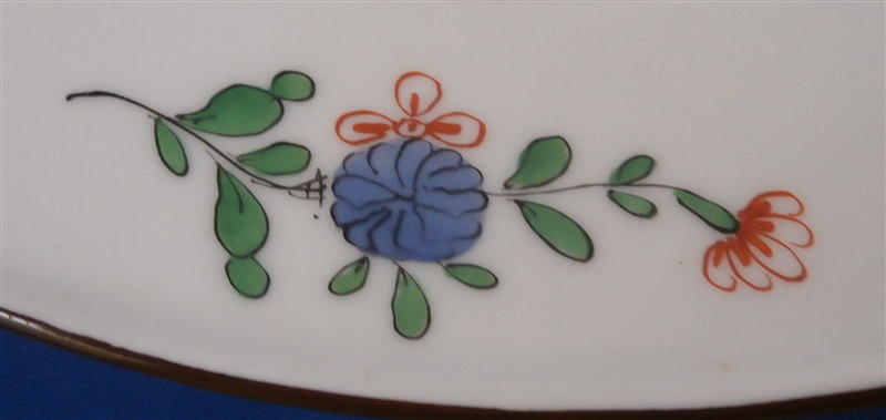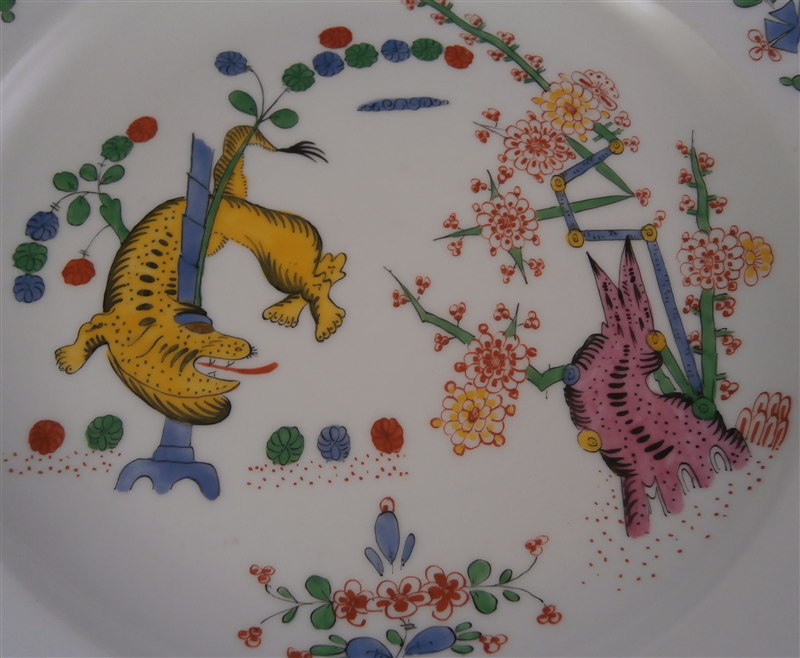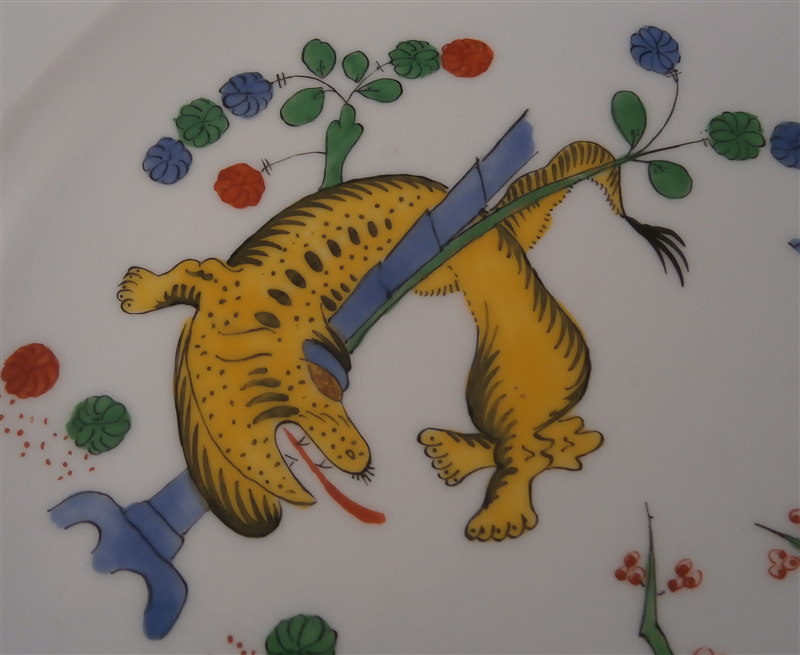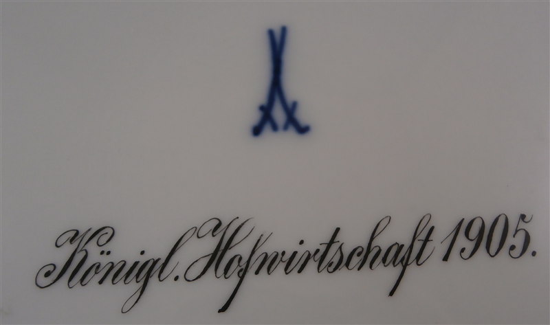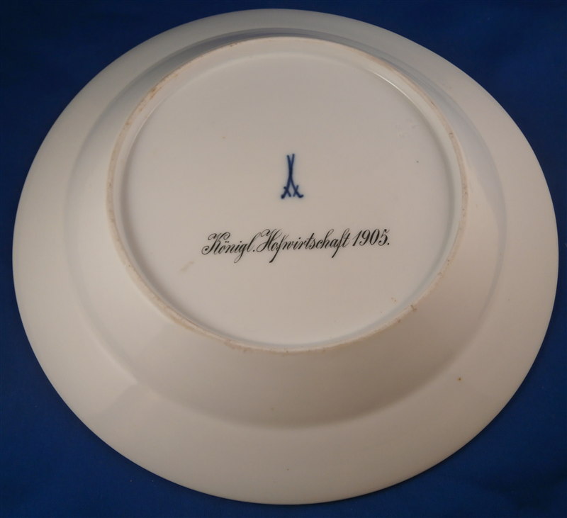 This is a rare porcelain soup plate made by Meissen in 1905. It is handpainted with the superb yellow Tiger design made for the Saxon Royal Court. A very color ful design in the Kakiemon style with it covering the entire bowl with Kakiemon style flowers along the rim and a brown trim to the edge. This plate is in perfect condition. It is 1.375 inches tall and 9.5 inches in diameter. It is marked underneath with the underglaze blue crossed swords as well as the usual impressed numbers of the period and the black writing for the royal kitchen underneath - Koenigliche Hofwirtschaft 1905. A rare piece of German royal history! Please email me for more information or other pictures.