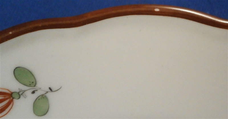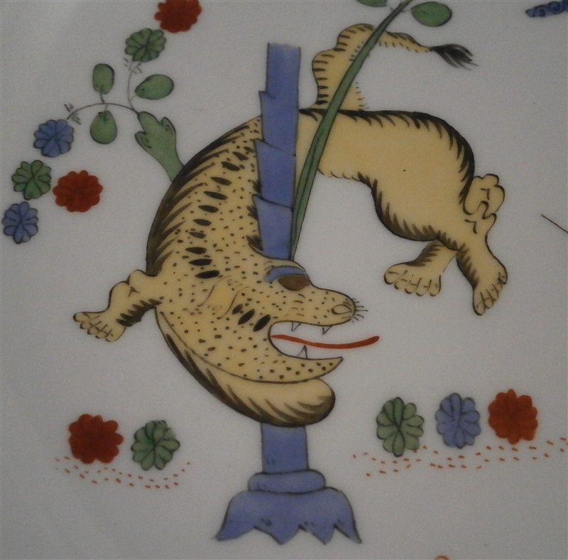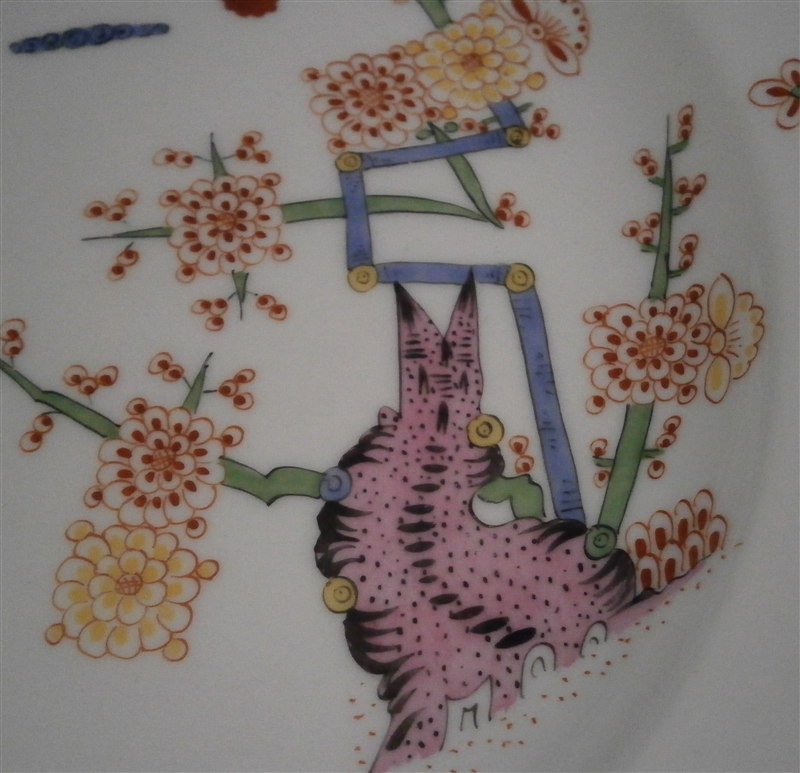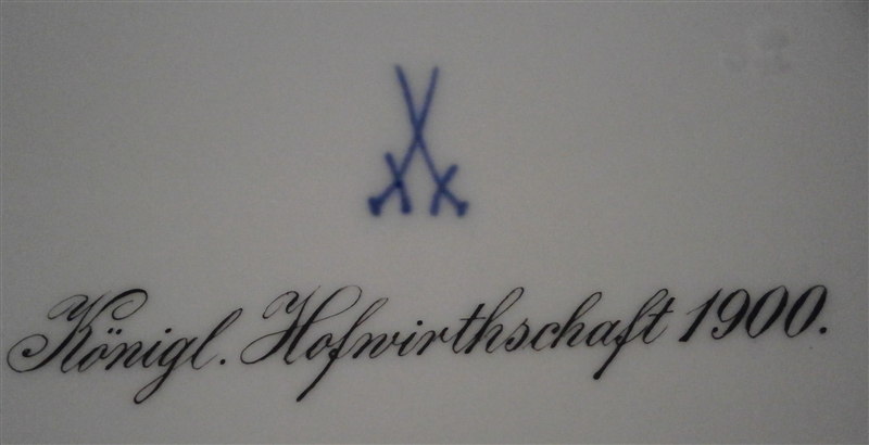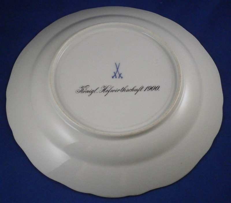 This is a rare porcelain plate made by Meissen in 1900. It is hand painted with the superb yellow Tiger design made for the Saxon Royal Court . A very colorful design in the Kakiemon style with it covering the entire well with Kakiemon style flowers along the rim and a brown trim to the edge. This plate is in perfect condition with some spots of wear on the brown edge trim that is very minor. The dish is 1.25 inches tall and 8.25 inches in diameter. It is marked underneath with the underglaze blue crossed swords as well as the usual impressed numbers of the period and the black writing for the royal kitchen underneath - Koenigl. (Koenigliche) Hofwirtschaft 1900. A rare piece of German royal history! Please email me for more information or other pictures.