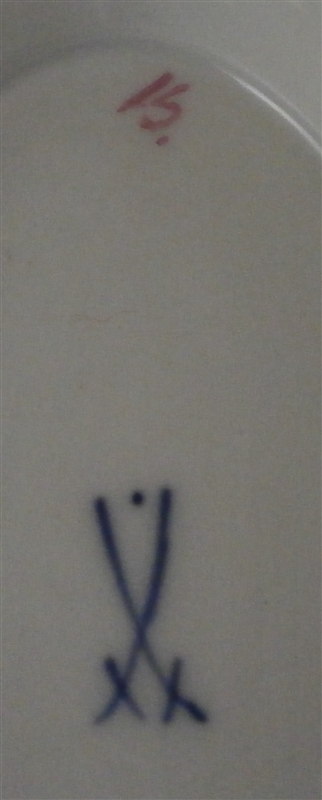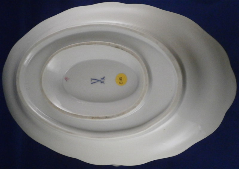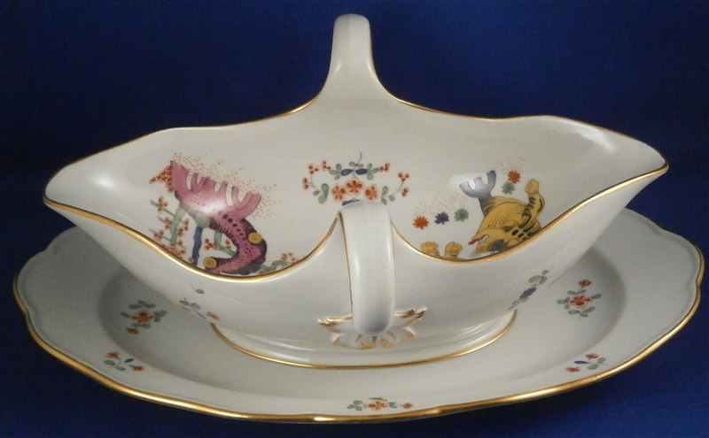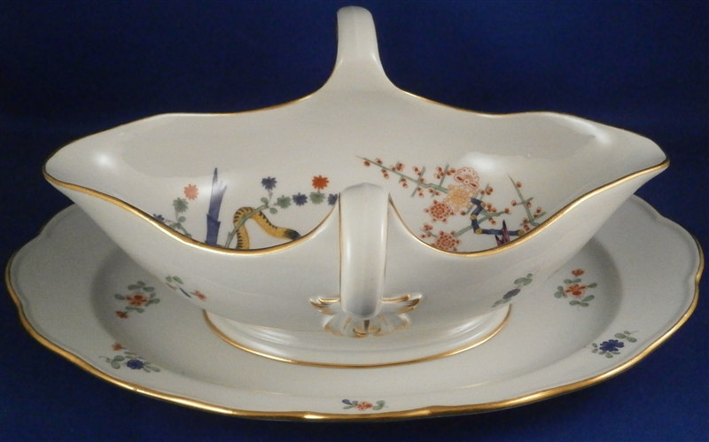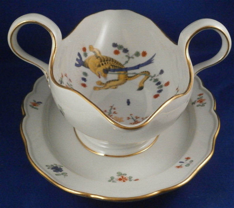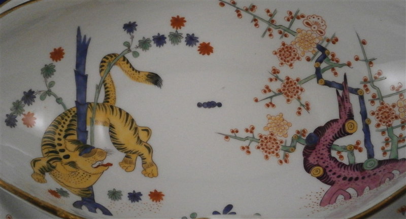 This is a fun porcelain sauciere or sauce dish made by Meissen during the Pfeiffer period of the early 20th century. It is hand painted with the very colorful yellow Tiger design on the inside as well as lots of small Kakiemon style flowers along the outside. Nice shape to the piece with two handles and a bit of gold trim. This dish is in perfect condition. It is 3.625 inches tall, 10 inches long and 6.25 inches wide. It is marked underneath with the underglaze blue crossed swords with the dot between the top as well as the usual impressed numbers of the period and a puce painter's mark 15. Please email me for more information or other pictures.