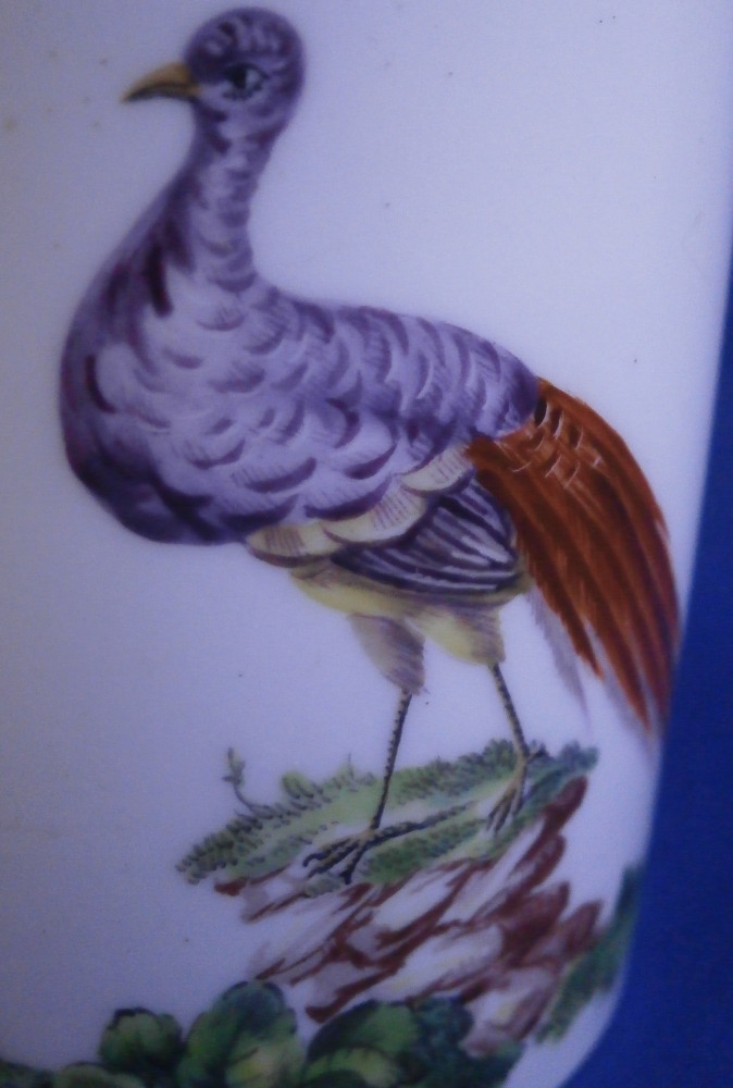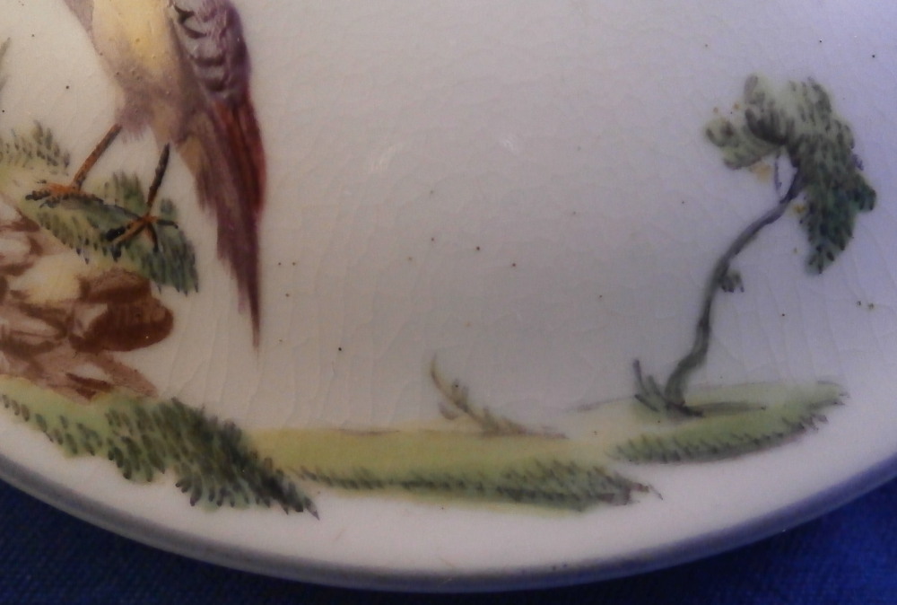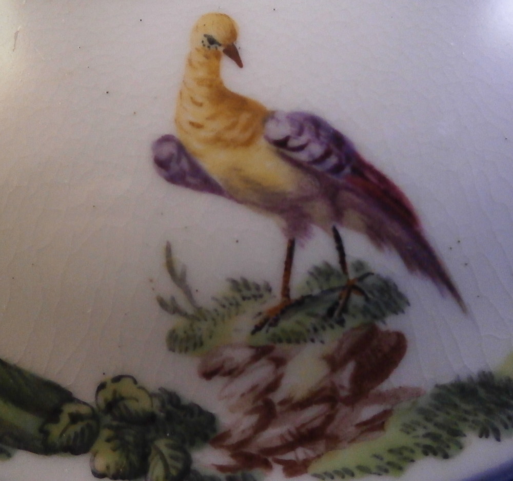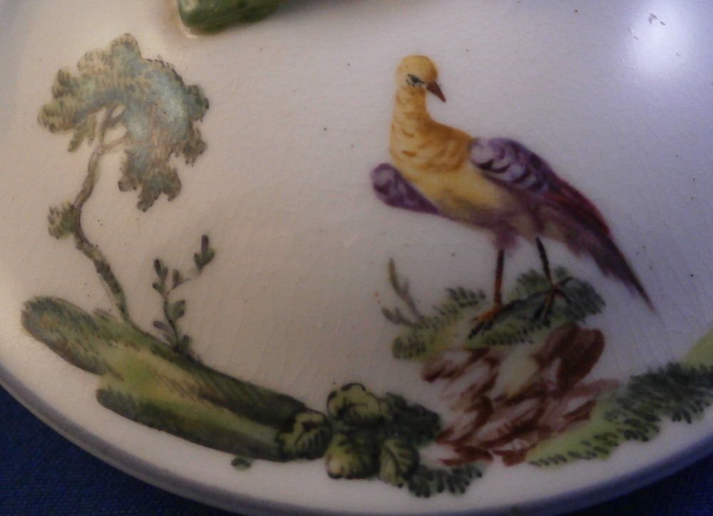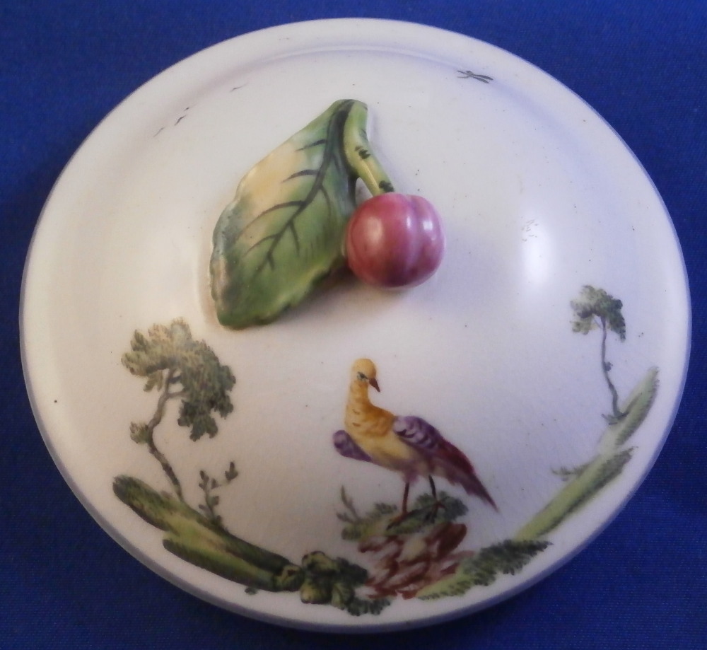 This is a very rare and amazing pot a pommade or pot a fard made by Mennecy in the 18th century. This lidded pot would generally have formed part of a service de toilette and would have contained cosmetics like lotion or some sort of ointment. What makes this a very special piece is that it was painted by the famous Fidelle Duvivier who is one of the best painter's out there. Very few Mennecy pieces are known that have been painted by him! This is the first and only piece of this shape of those few pieces. I had my suspicion about this when I bought it and it was confirmed by Charlotte Jacob-Hanson who is the expert on him. The bottom piece is hand painted with a really nice colorful bird standing on some grass on top of a rock base in a landscape surrounding. The lid has a similar but smaller scene to it. Blue trim to the edges and a nice fruit finial with its leaf on to fo the lid. Does not come much better than this! The enamel colors are amazing and it makes soft paste so much nicer than hard paste porcelain. The piece is marked underneath with the incised DV mark as shown. The main body with the lid in place is 4 inches tall including the finial with the lid having a diamete of 3.125 inches. The main body is slightly smaller in diameter. The set is in superb condition without any major issues. There is some crazing to the glaze in the thicker area of the lid as shown. As nice as they come! Please email me for more information or other pictures.