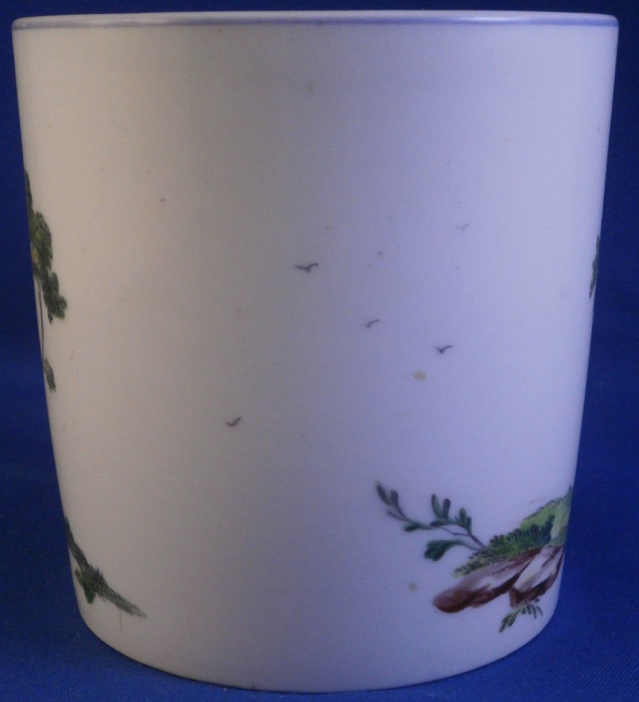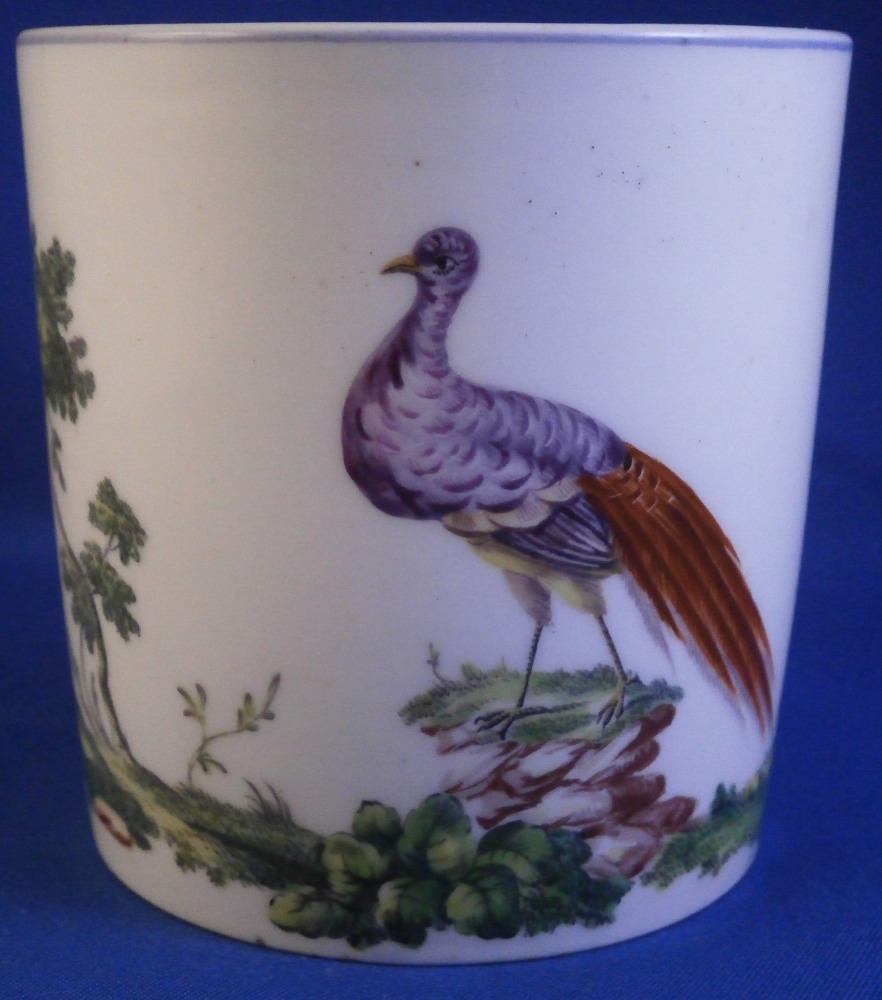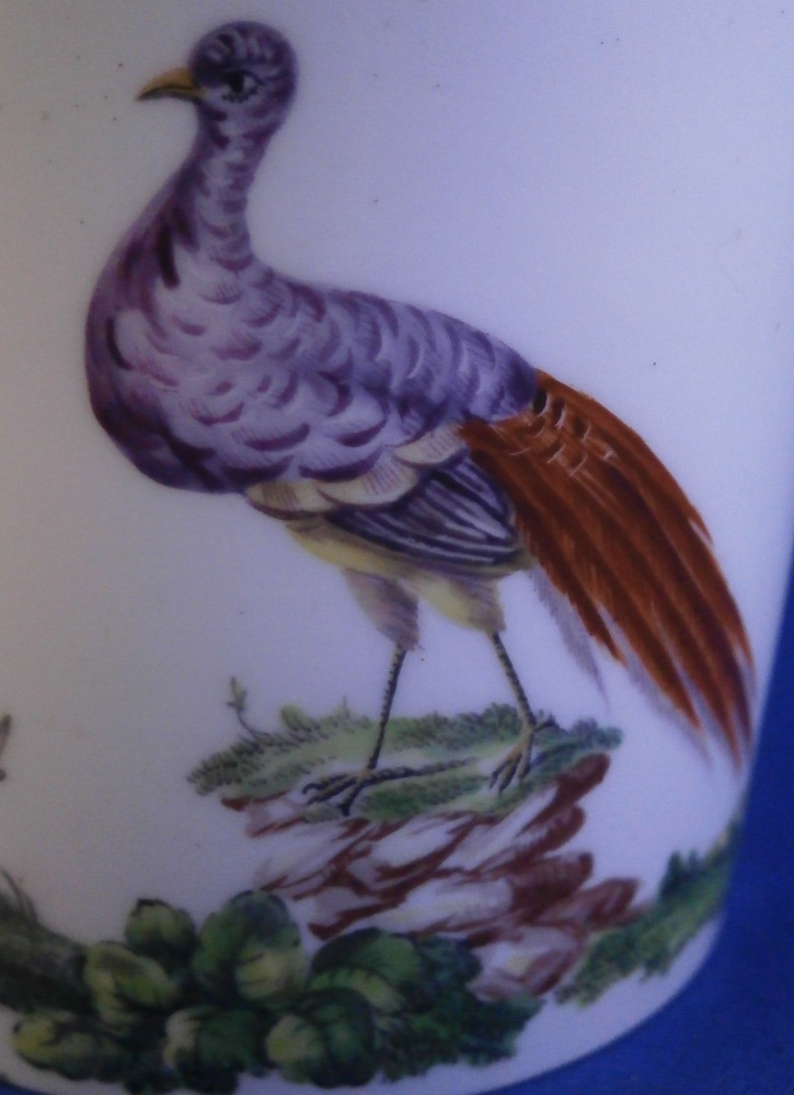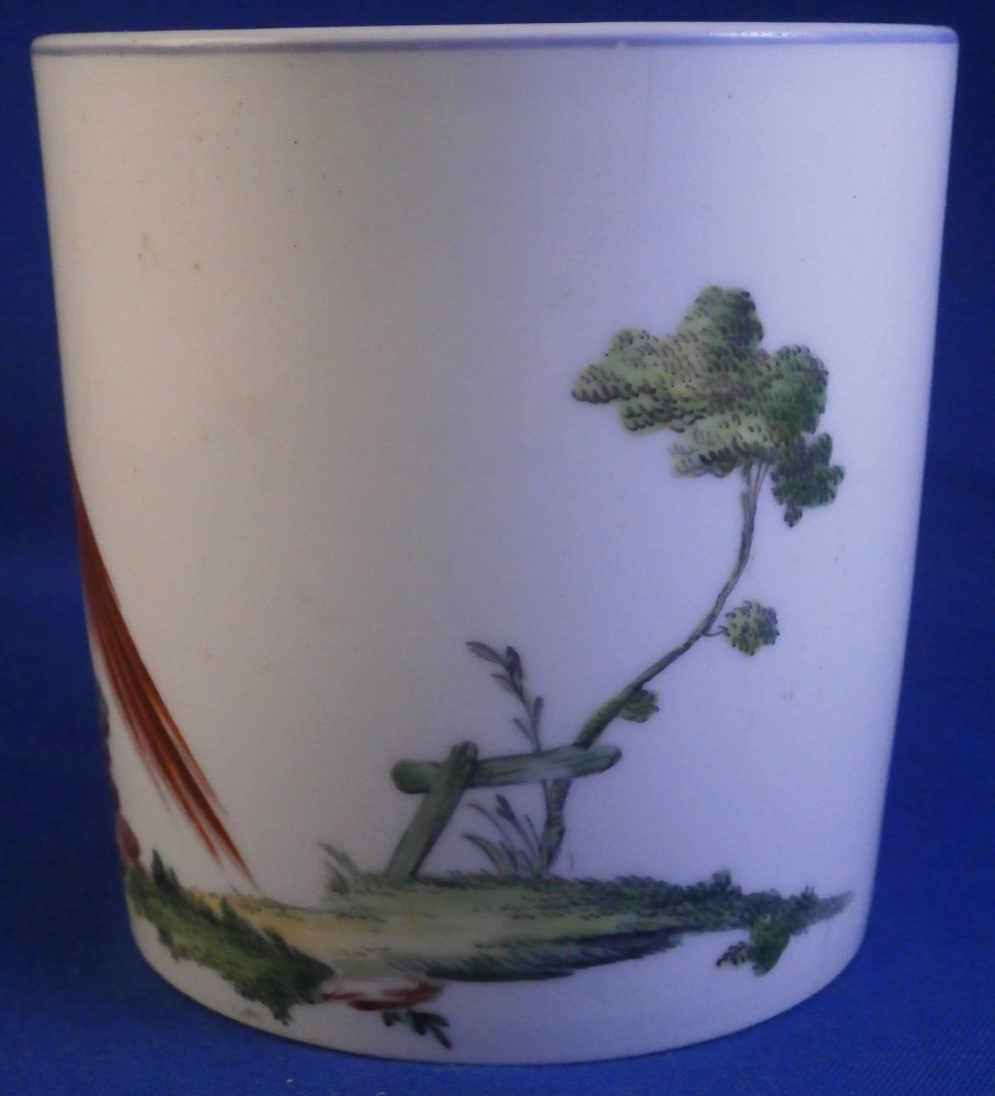 This is a very rare and amazing pot a pommade or pot a fard made by Mennecy in the 18th century. This lidded pot would generally have formed part of a service de toilette and would have contained cosmetics like lotion or some sort of ointment. What makes this a very special piece is that it was painted by the famous Fidelle Duvivier who is one of the best painter's out there. Very few Mennecy pieces are known that have been painted by him! This is the first and only piece of this shape of those few pieces. I had my suspicion about this when I bought it and it was confirmed by Charlotte Jacob-Hanson who is the expert on him. The bottom piece is hand painted with a really nice colorful bird standing on some grass on top of a rock base in a landscape surrounding. The lid has a similar but smaller scene to it. Blue trim to the edges and a nice fruit finial with its leaf on to fo the lid. Does not come much better than this! The enamel colors are amazing and it makes soft paste so much nicer than hard paste porcelain. The piece is marked underneath with the incised DV mark as shown. The main body with the lid in place is 4 inches tall including the finial with the lid having a diamete of 3.125 inches. The main body is slightly smaller in diameter. The set is in superb condition without any major issues. There is some crazing to the glaze in the thicker area of the lid as shown. As nice as they come! Please email me for more information or other pictures.
