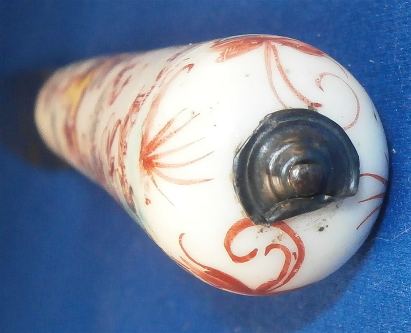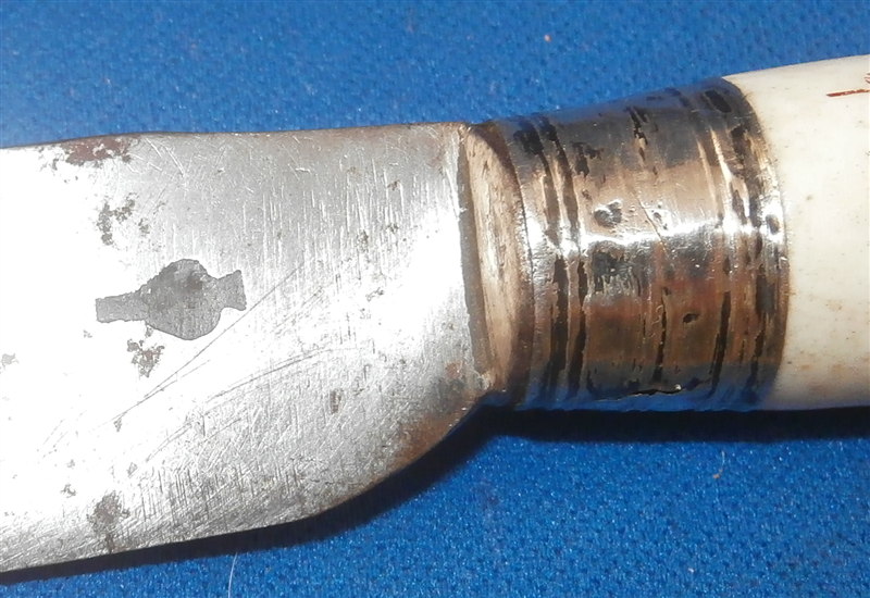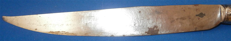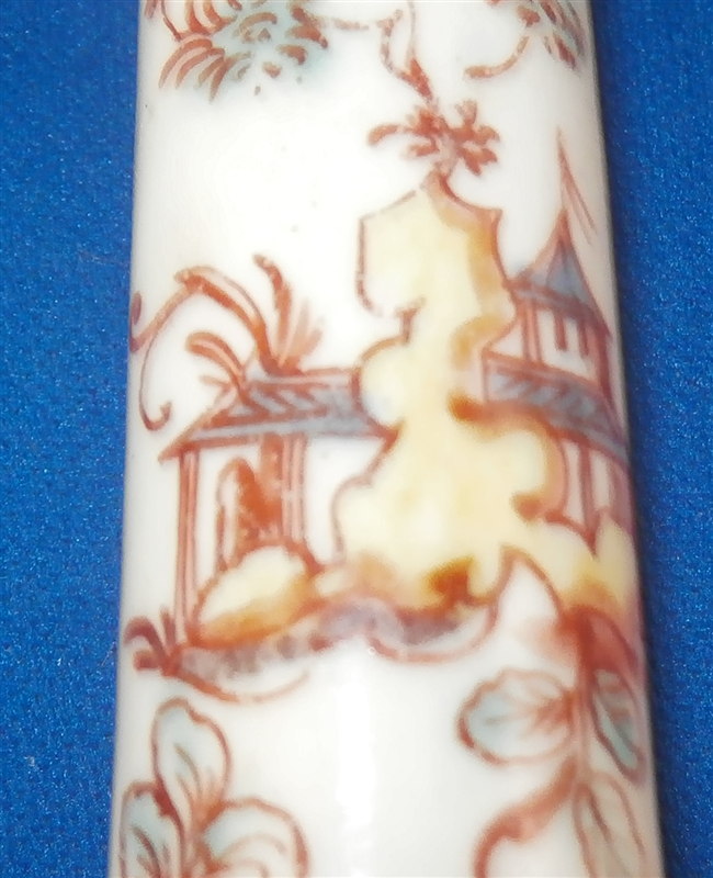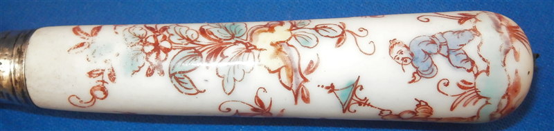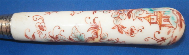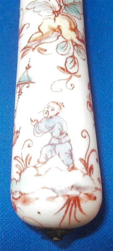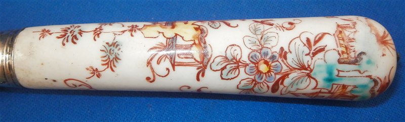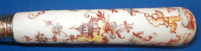 This is a very rare large knife with the handle made by Mennecy around 1740. It is made of a creamy colored softpaste with a colorful Chinoiserie design. The blade is steel which is marked as shown. The knife is amazingly complete with the blade which isn't that common and the porcelain has no damage but there is a bit of wear to the design which is normal on softpaste porcelain like this. The blade has a bit of oxidation to it as shown and the silver collar has some minor dings. The piece that sticks out at the end of the handle has bent over as shown. The porcelain is unmarked which is the norm. The knife is 10.375 inches long of which the visible porcelain handle is about 3.625 inches. Please email me for more information or other pictures.