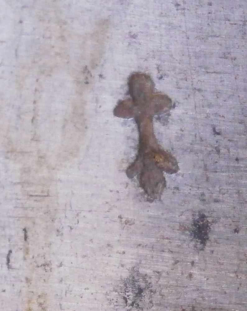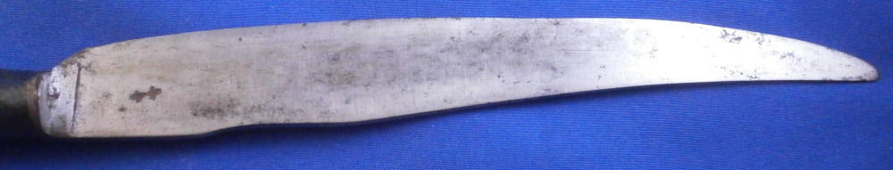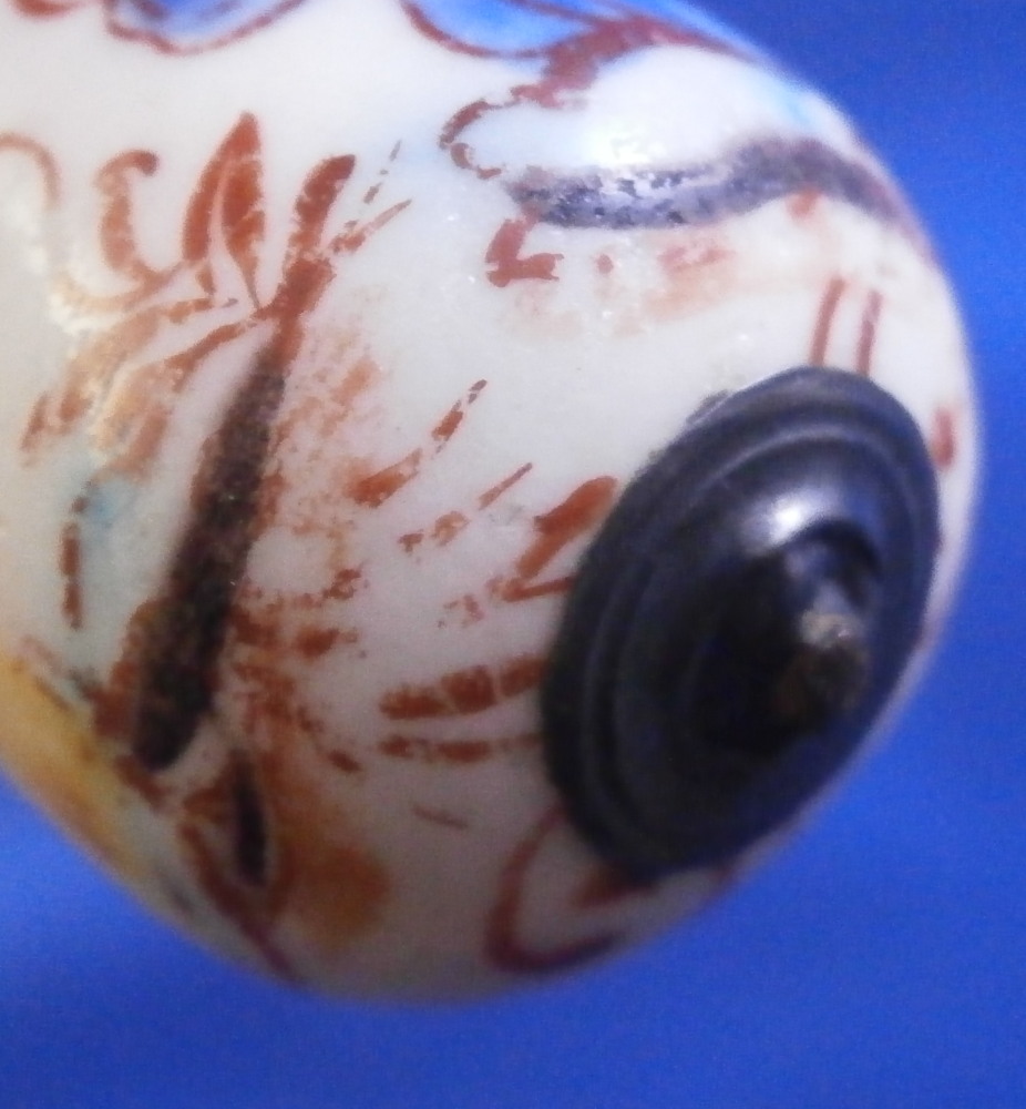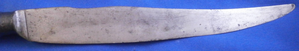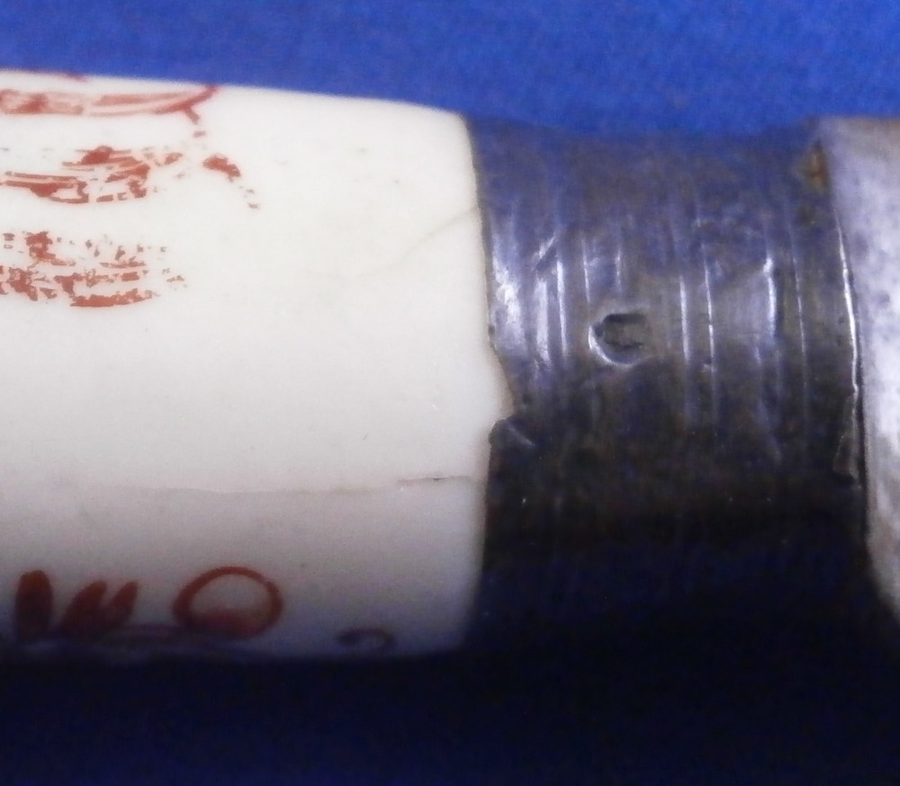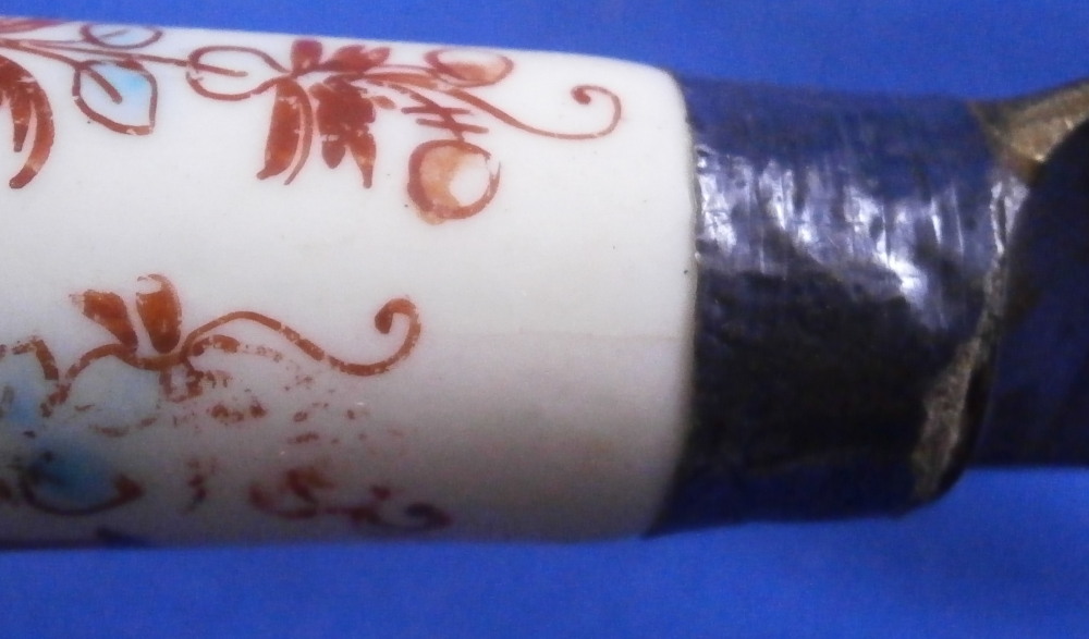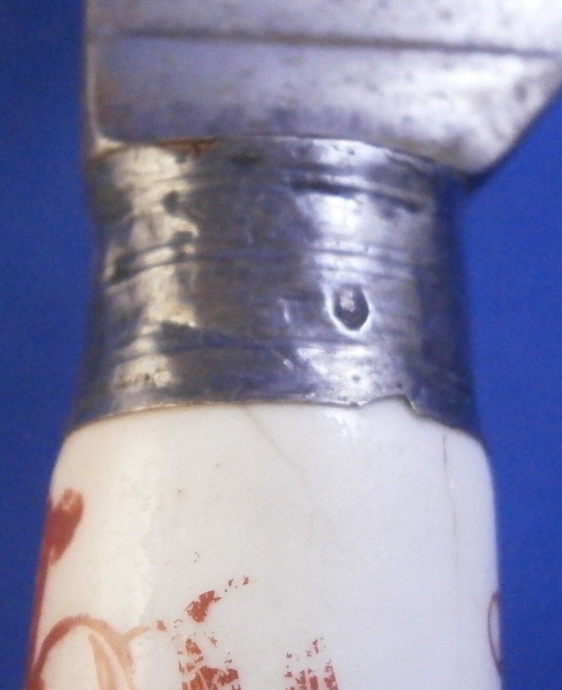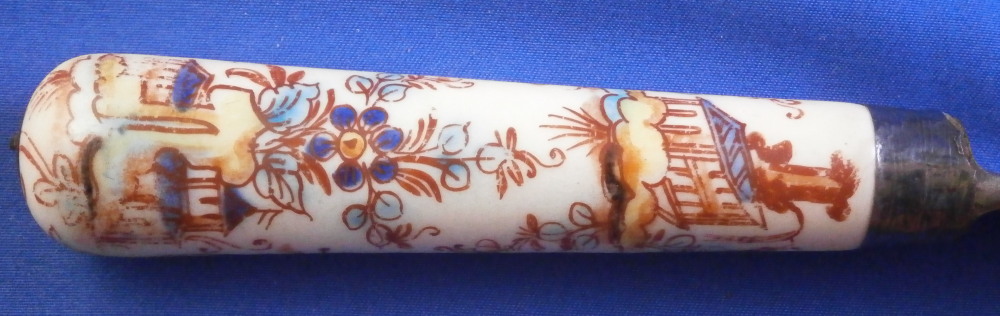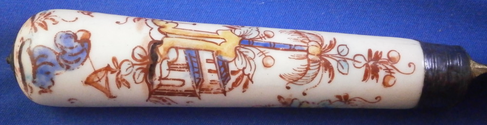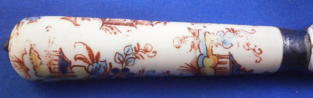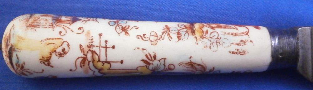 This is a very rare large knife with the handle made of porcelain by Mennecy around 1740. The porcelain has a creamy color to it and is made of softpaste. It is hand painted with a colorful Chinoiserie design. The blade is steel which is marked as shown. The knife is amazingly complete with the blade which isn't that common and the porcelain is in good condition with some wear to the decoration and three short hairlines on the end enar the ferrule. The wear to the decoration is very comon on softpaste porcelain like this. The blade has a bit of oxidation to it as shown and the silver collar is oxidized and has some minor dings. The piece that sticks out at the end of the handle is still present and in good shape which is a plus! The porcelain is unmarked which is the norm. The knife is 11.375 inches long of which the visible porcelain handle is about 3.5 inches long. Please email me for more information or other pictures.