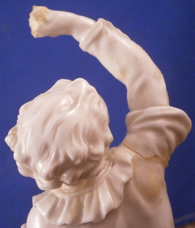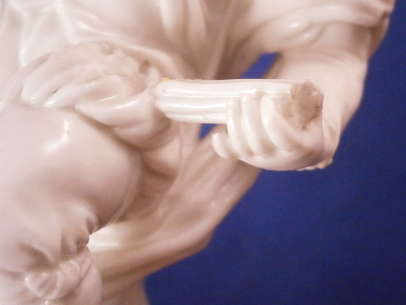 This is a nice figurine most likely made by Mennecy or possibly Tournai and definitely in the 18th century. I have not found this exact piece but there are not many makers that made soft paste of good quality and the style of this piece leads me to one of these two makers. The figurine is made of softpaste porcelain and is of a gentleman wearing some fancy clothes while standing on a typical rock shaped base holding some sort of implement in his hands. A tree stump to the back of her for support. A very well modeled piece and left in the white to show off all that nice detail - something that was more valued back then rather than colored examples. The figure is in decent condition with some damage - his right arm was reglued at the shoulder as was his head and whatever he was holding in his right hand is gone and the piece in his left hand is chipped off. Not sure what that was supposed to be. The bows on his right foot are shipped but he still displays nicely for sure! The piece is not marked but that is quite normal. The figure is 5.625 inches tall, 2.5 inches wide and 2.25 inches deep. Please email me for more information or other pictures.