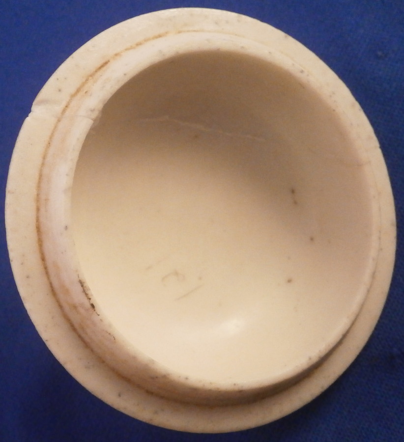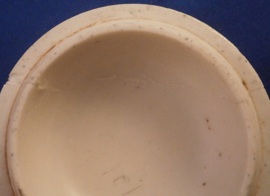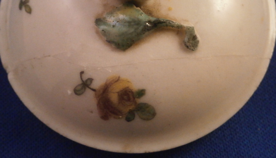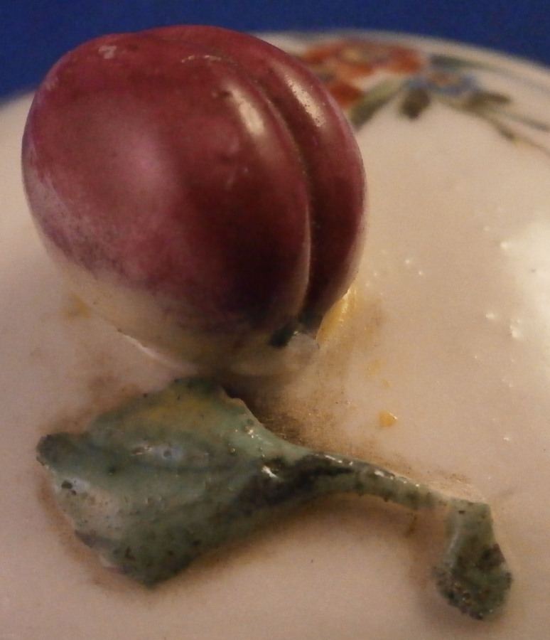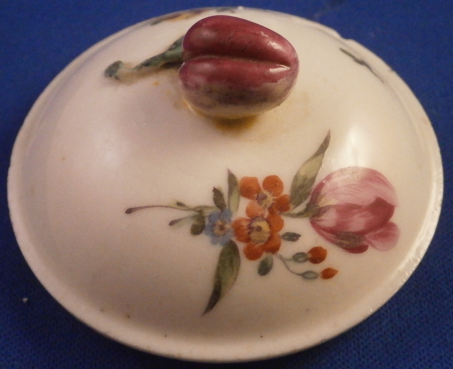 This is a rare lid made by Mennecy in about 1760. Not sure what kind of pot it is for. The piece is made of soft paste porcelain and is hand painted very nicely with a floral arrangement to one side, a single flower to the other and a little leaf in between with a great fruit finial with its leaf to the top. Sadly it has seen bettwe days with it having been broken a reglued with a tiny chip at one end of the crack. The stem of thefinial is missing as well. Still a rare survivor and if anyone needs a lid it will display nicely. It's rare to see single lids like this so it's still worth hanging on to them. The lid is about an inch tall with a diameter of 2.625 inches. The inner foot ring that would sit inside the pot has an outer diameter of 2.25 inches. Please email me for more information or other pictures.