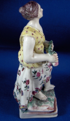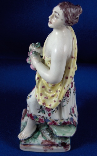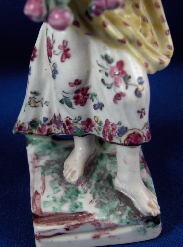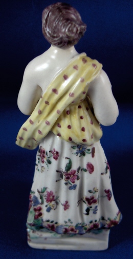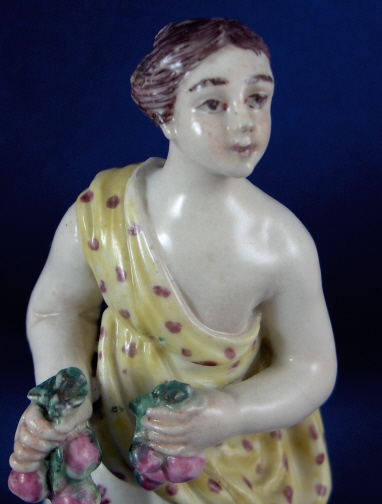 This is a figurine made by Mennecy in the 18th century. She is made of softpaste porcelain and thus has a creamy warm white color and the enamel colors look quite different from the usual hard paste figurine one sees much more often. She is wearing a dress that is painted nicely with flowers. Her top has a yellow ground color with dots on it. She is holding some berries in her hands and the base is painted to look like grass and rocks. The figurine is not marked which is pretty common on pieces this old. She is in good condition with the leaves in her hands being chipped and both arms have been restored well. The piece is 5.375 inches tall and 2.25 inches wide. Please email me for more information or other pictures.