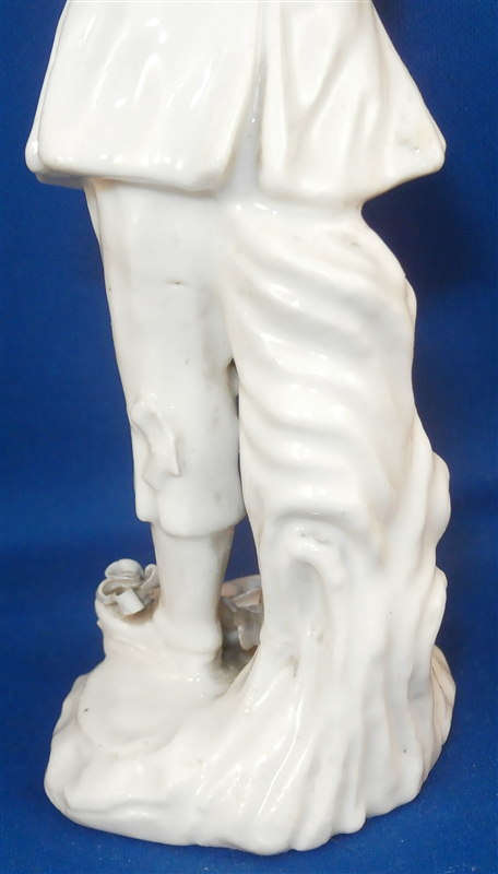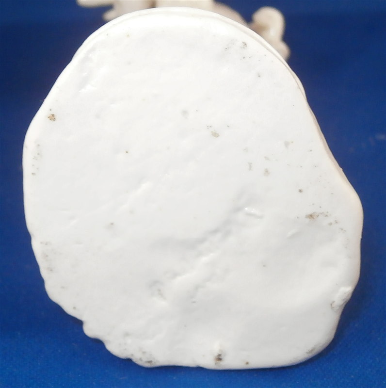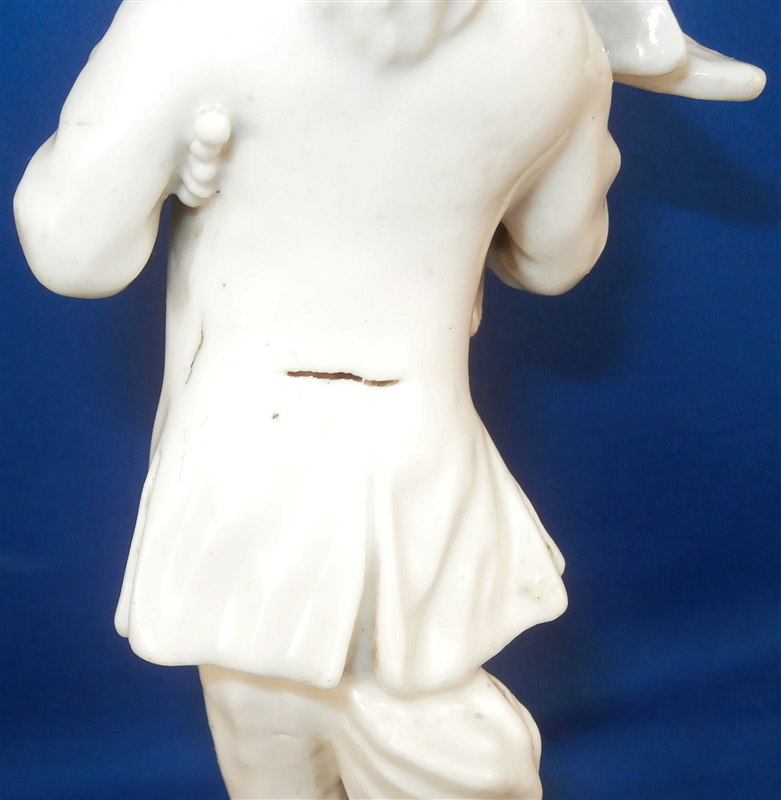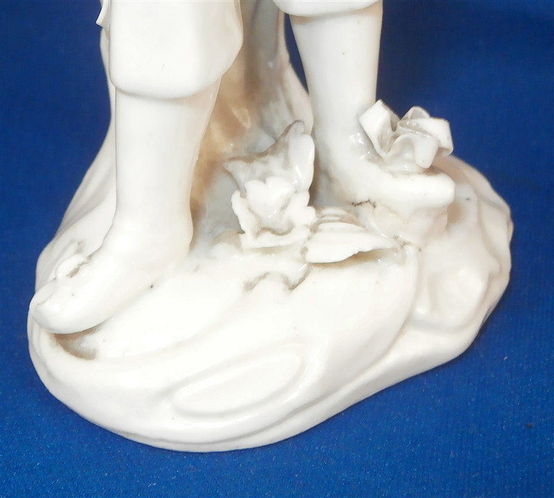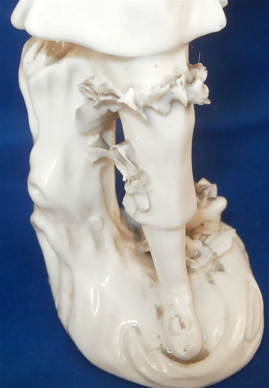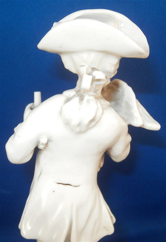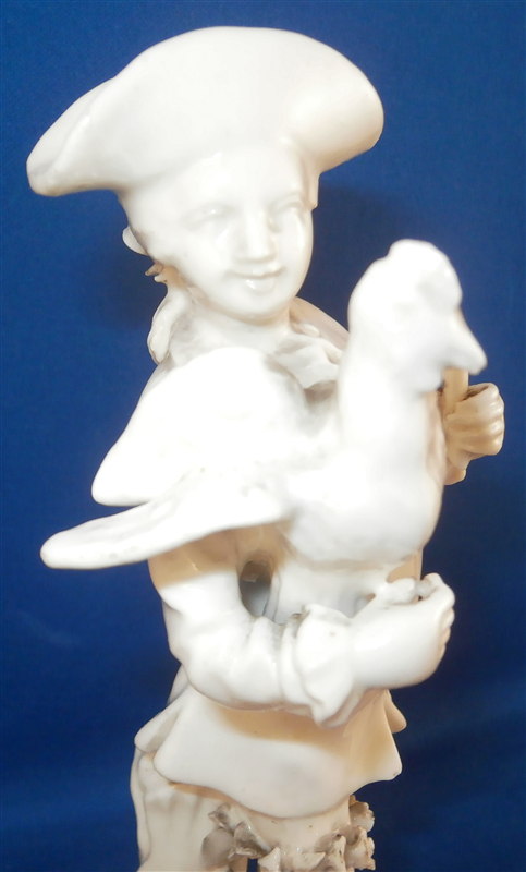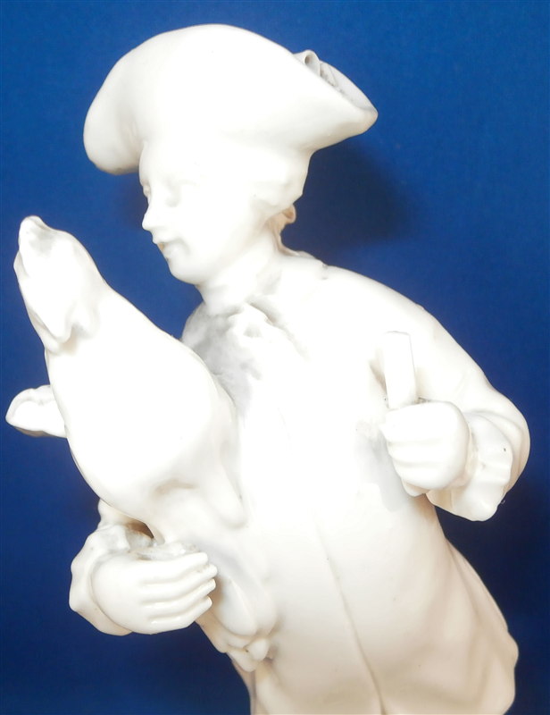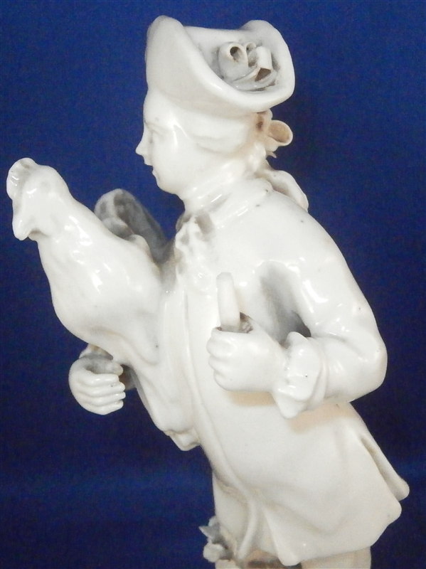 This is a fun figurine most likely made by Mennecy and definitely in the 18th century. I have not found this exact piece but there are not many makers that made softpaste of good quality and the style of this piece leads me to Mennecy with little doubt if any. The figurine is made of soft paste porcelain and is of a gentleman holding a rooster. A very well modeled piece with him wearing a hat and a nice jacket. Lots of little details like bows on the hat, on the sides of the leg and the one shoe (the other shoe likely had one as well but it looks to have come off during the making as it is glazed over in that spot). A floral garland around his right leg not sure what that is about and a flower between his feet on the base. Left in the white which was more sought after back then and more expensive as well as the flaws could not be hidden by paint. The figure is in great condition with damage to the item he is holding in his left hand. The top is fine as it is glazed over but the bottom seems to have broken off. No idea what it might be! Damage to the bows on his pant legs with one being mostly gone and the other one mostly fine. As I mentioned before the one shoe is missing the bow and the little flowers on the garland around his leg have some minor damage but nothing obvious. A firing crack on the jacket on his backside. Could use a little cleaning :) All in all a great piece in very good condition considering the age and that is it softpaste! The piece is not marked though there might be writing underneath which I cannot make out or I might just be imagining things. The figurine is 6.5 inches tall, 2.25 inches wide and 2.25 inches deep. Please email me for more information or other pictures.
