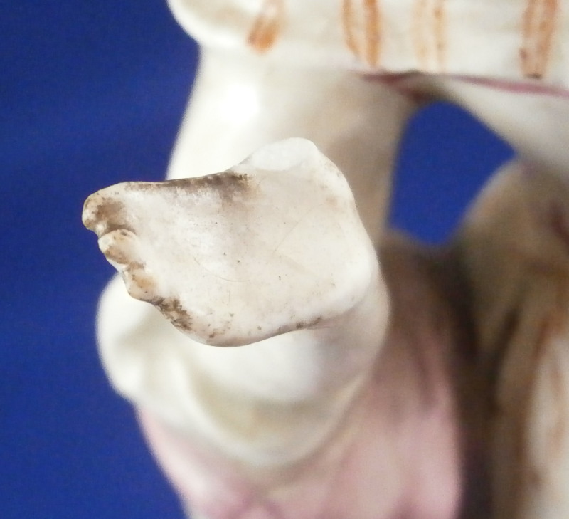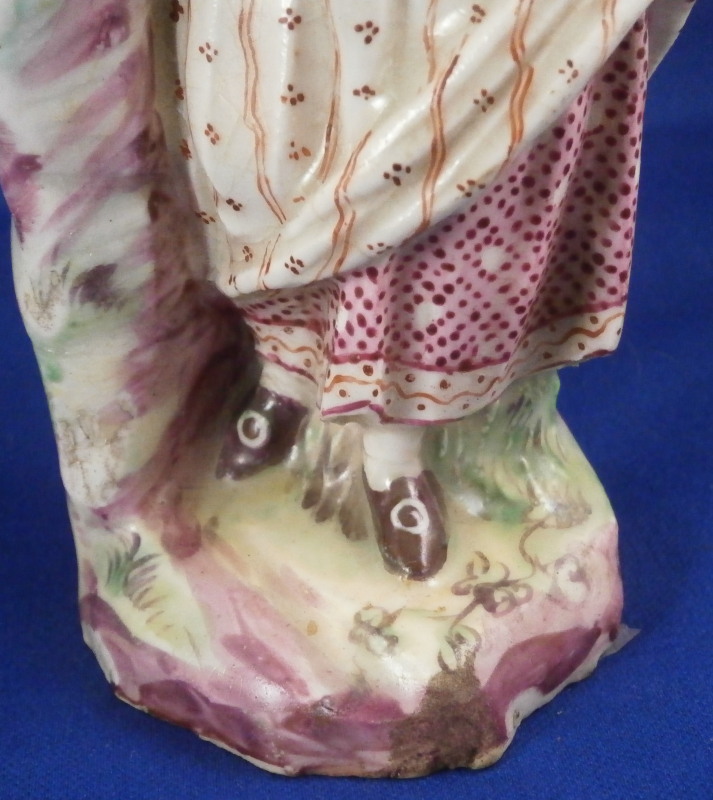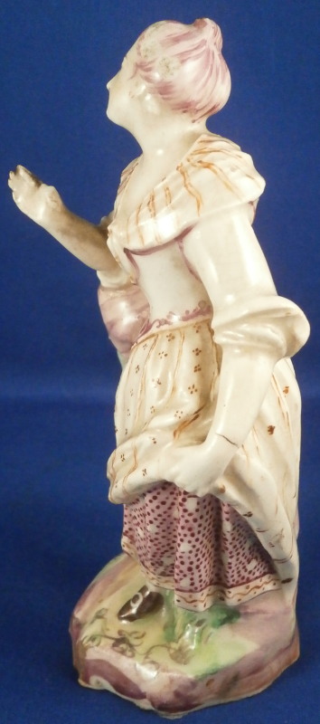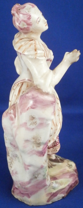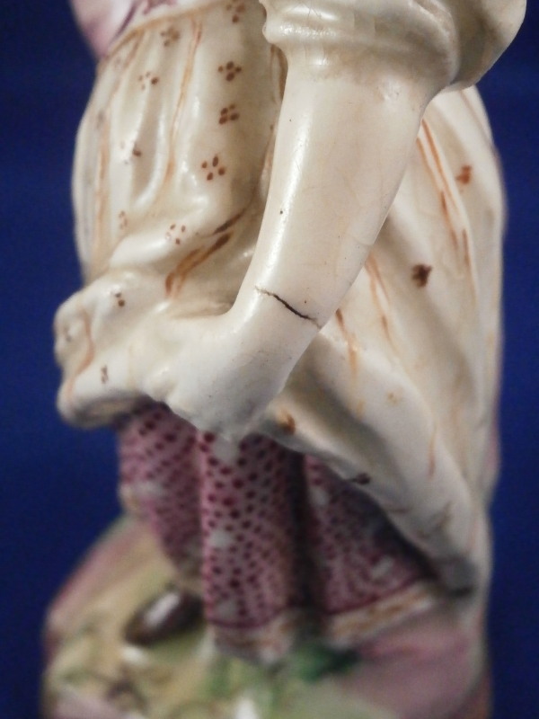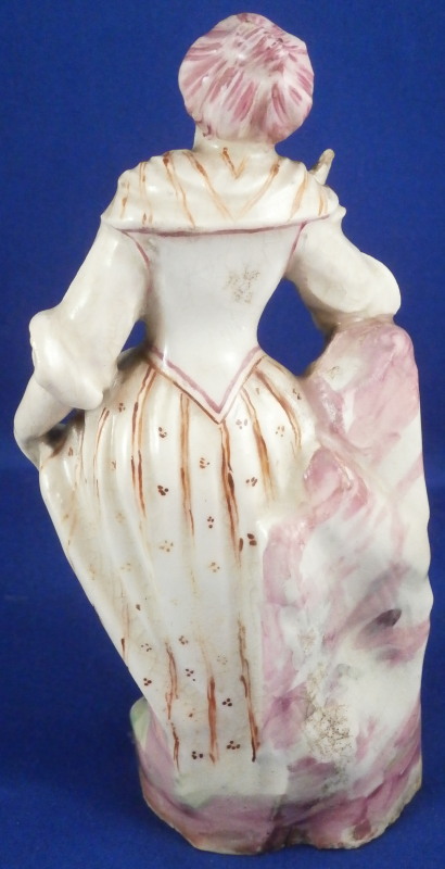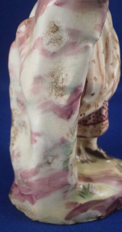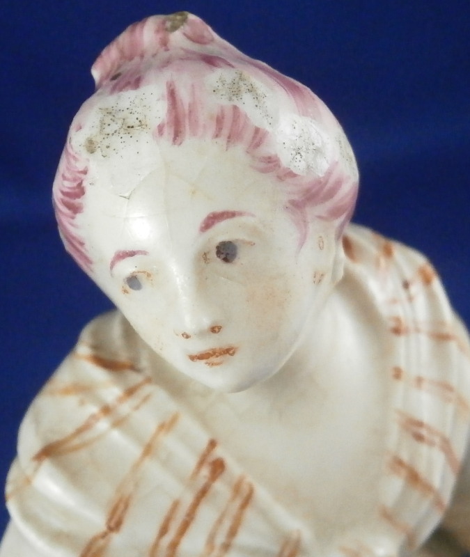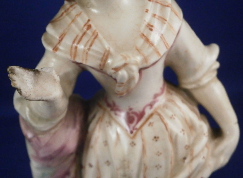 This is a figurine of a lady made by Mennecy in the 18th century. She is made of soft paste porcelain and thus has a creamy warm white color and the enamel colors look quite different from the usual hard paste figurines one sees much more often. Nicely modeled and hand painted. Pink hair is one of the oddities of this maker at times :) The figurine is in good condition with a lot of mostly firing issues. The right hand is a bit rough with the thumb missing and lots of black kiln dust and at first glance it looks like the other fingers are chipped but I do believe it was made this way. Her hair has spots where small items seems to be missing like a crown of leaves or flwoers but it is glazed so I think this happened during the making as did the areas to her backand along the rck she is leaning on and along the edge of the base. Not sure what happened here but she is an early example and lots of things went wrong during the porduction of these pieces. Some wear to the center area of the back of her skirt. Firing crack in the wrist of her other hand. She still displays very nicely and is a fun example from a hard to find maker even with these flaws. All part of the charm of these early piece I think. The figurine is not marked which is pretty common on pieces by them. Quite heavy for the size! The figure is 5.5 inches tall, 2.75 inches wide and 2.25 inches deep. Please email me for more information or other pictures.