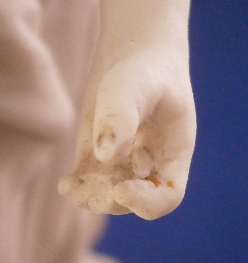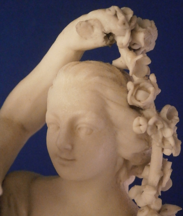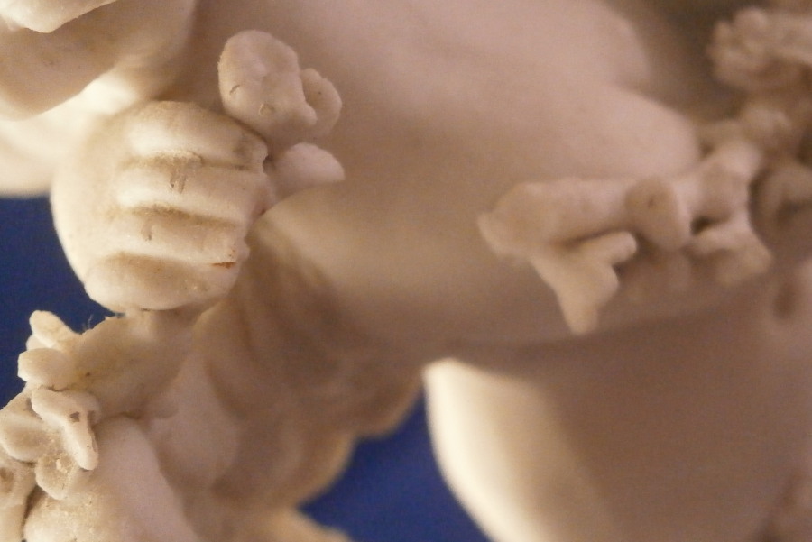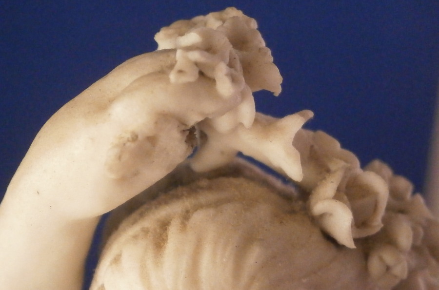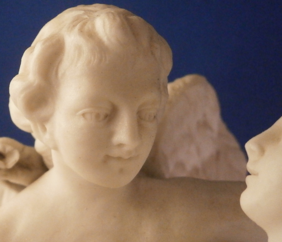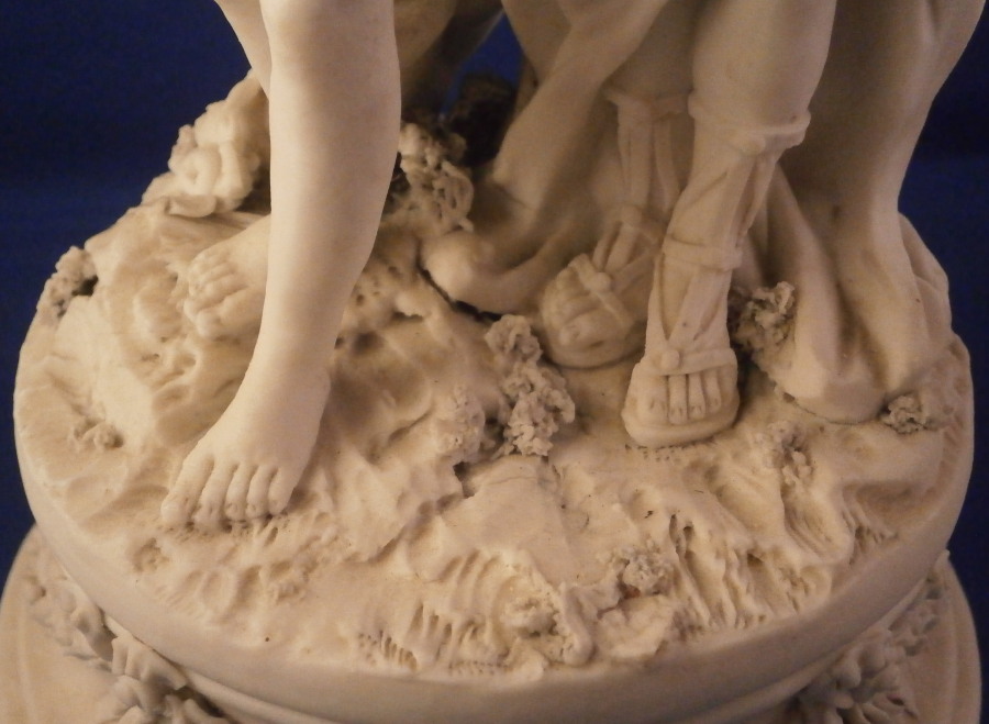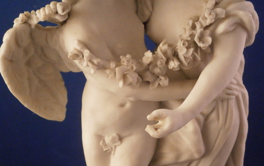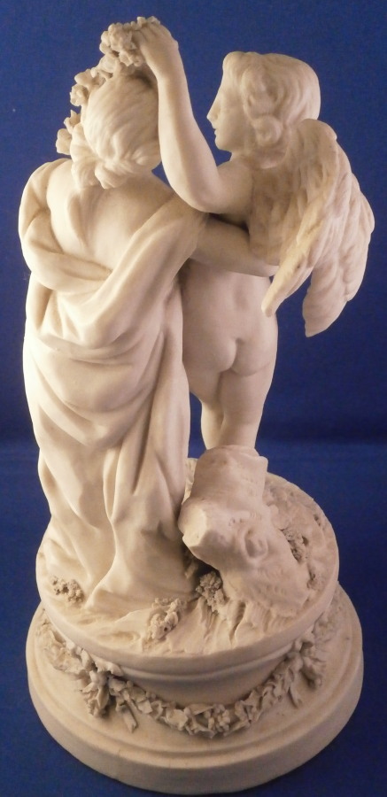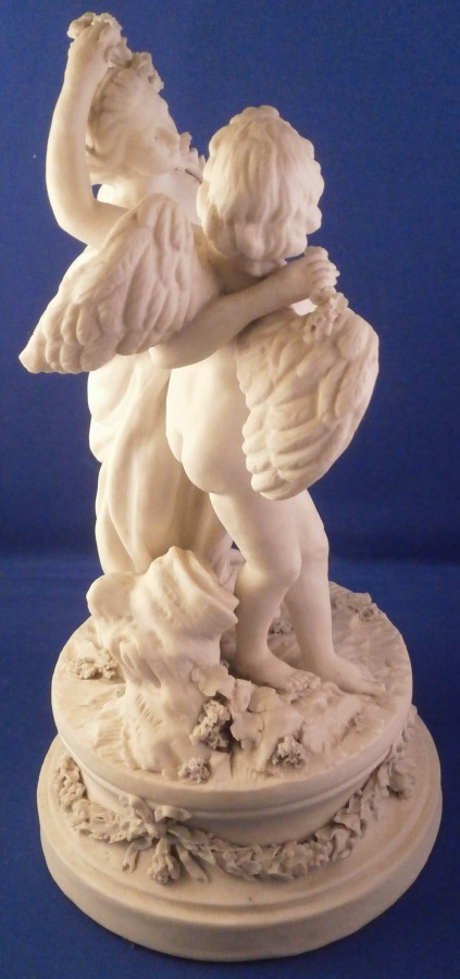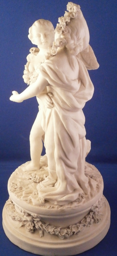 This is a biscuit / unglazed type of porcelain figurine made by Mennecy in the 18th century. It is a figurine of Amor / Cupid with a lady - either Zephyr or Flora - not sure. I have not been able to find this exact model but the pieces with this base are attributed to Jean-Baptiste Mo . A nice sized piece that is larger than any I ahve owned by them before. Modeled suprbly with lots of detail and the unglazed nature meants the details are crisper than in the glazed versions. The cupid figure has one hand on the lady's side with his other holding a floral garland over her head. Her hand is around his neck holding up the other end of the garland and her other hand is in the front possibly having held something small at some point. A leaf is discreetly placed over his mid section and she is wearing a flowing dress and fancy sandals. Nice base with lots of detail to is and some flowers and greenery. The sides have swags of leafand berry garlands held up by bows. A really nice addition. A stunning looking figurine that is in amazing condition given the fragile nature of it. There is a small piece of the floral garland missing near her hand, some chips to the rest of the garland but looks great. Two fingers in her front hand are very slightly chipped. Not sure if she ever held anything in them but that is possible. A couple of chips to the loops of the bows around the base and the leaf garland as well but nothing that takes away from the piece. No restoration or major damage. Even his wings are intact which amazed me. As nice a piece as you will find! The figurine is marked underneath - twice - once it came out a little sloppy I guess so they did it again. It is the not often seen script DV monogram as shown. The piece is 10 inches tall and the base has a diameter of 5.25 inches. Quite heavy for its size! Please email me for more information or other pictures.