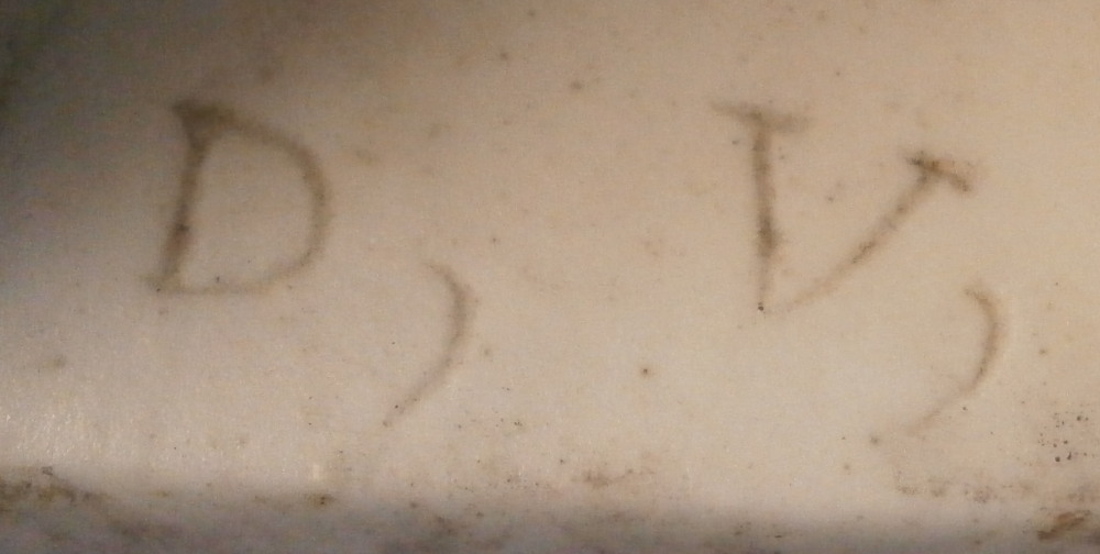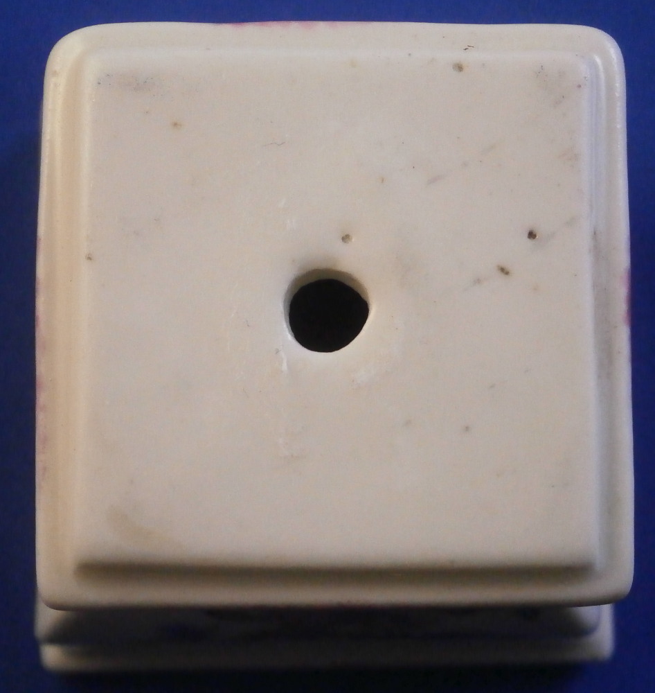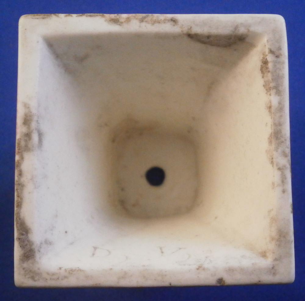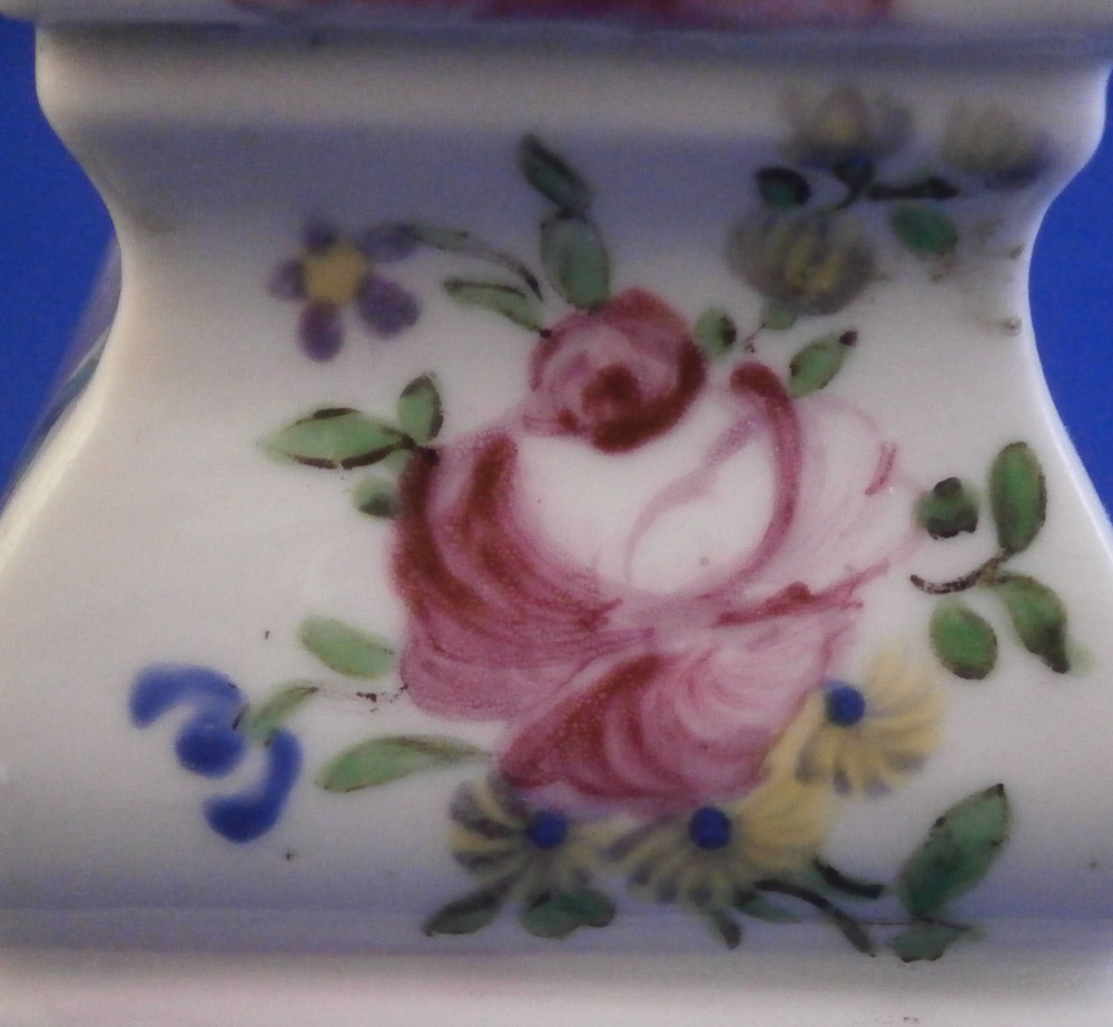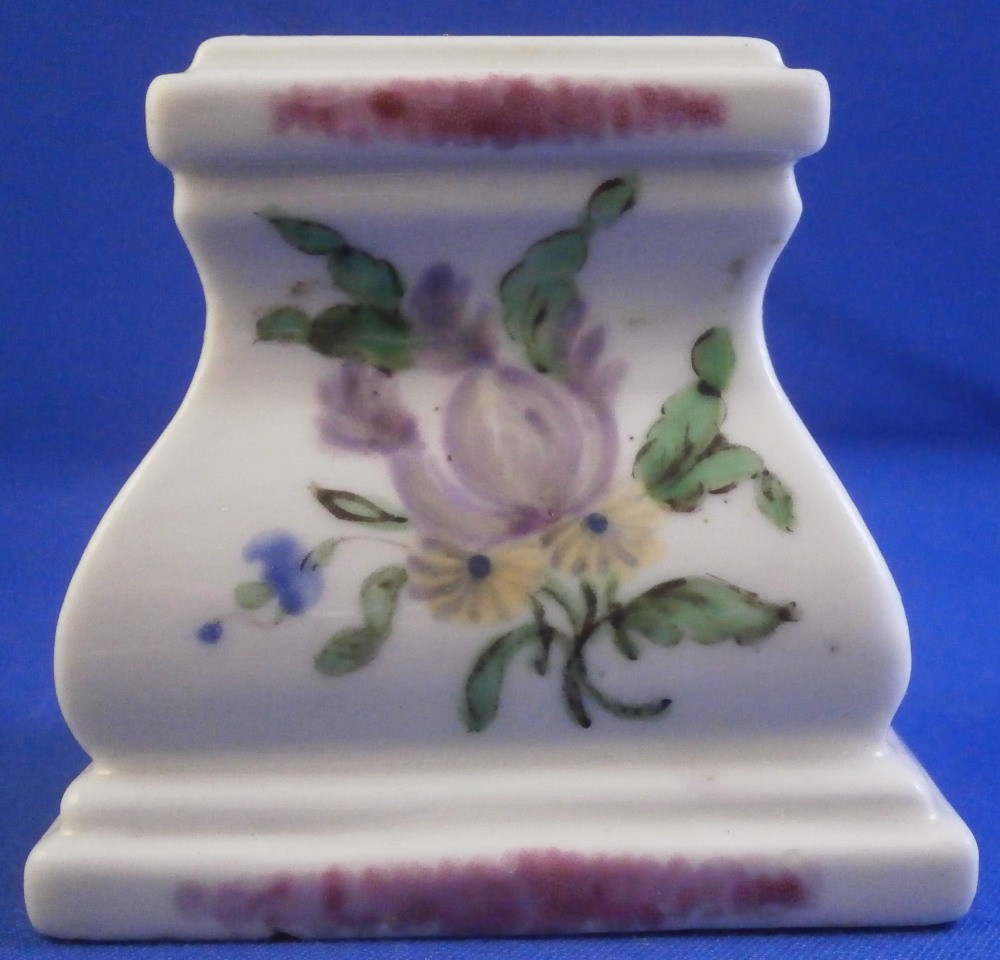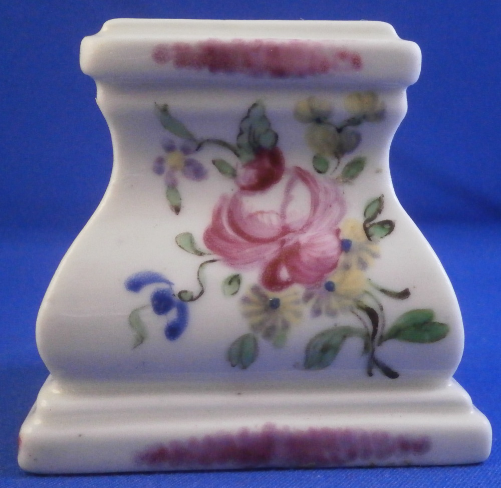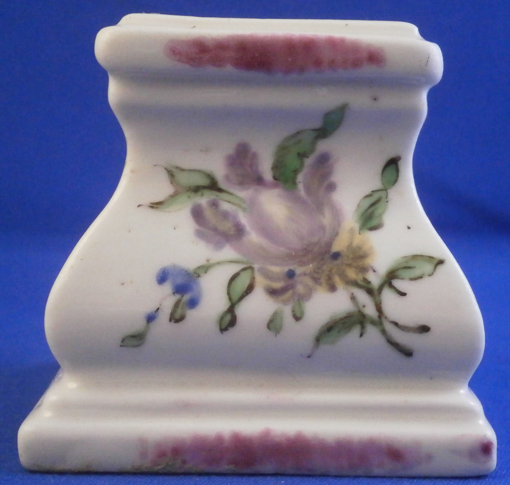 This is a fun little pedestal made by Mennecy in the 18th century. It is made of softpaste porcelain and thus has a creamy warm white color to the paste and the enamel colors look quite different from the usual hard paste one sees much more often. Much much nicer! The pedestal is hand painted nicely with a floral arrangement to all four sides - two different types - and a bit of puce trim to the edges. The piece is marked with the incised D.V. mark as shown. The piece is in superb condition with no issues at all except some stainign to the inside from when it was made which does not affect the piece at all. The stand is 2 inches tall and 2 inches square on the bottom. The top part where a figurine or miniature vase would sit is just over 1.25 inches on each side. Please email me for more information or other pictures.