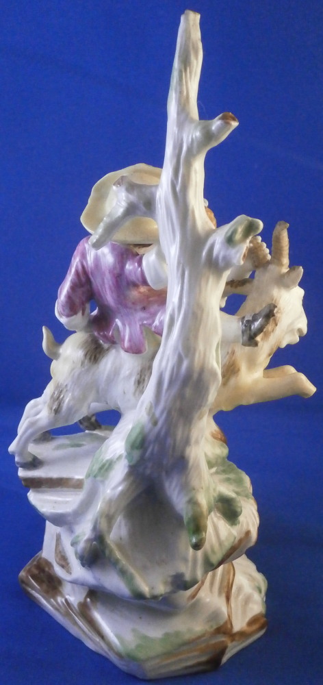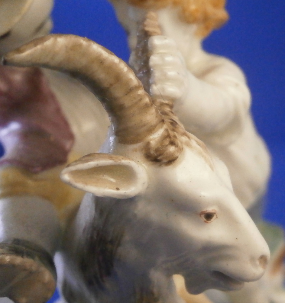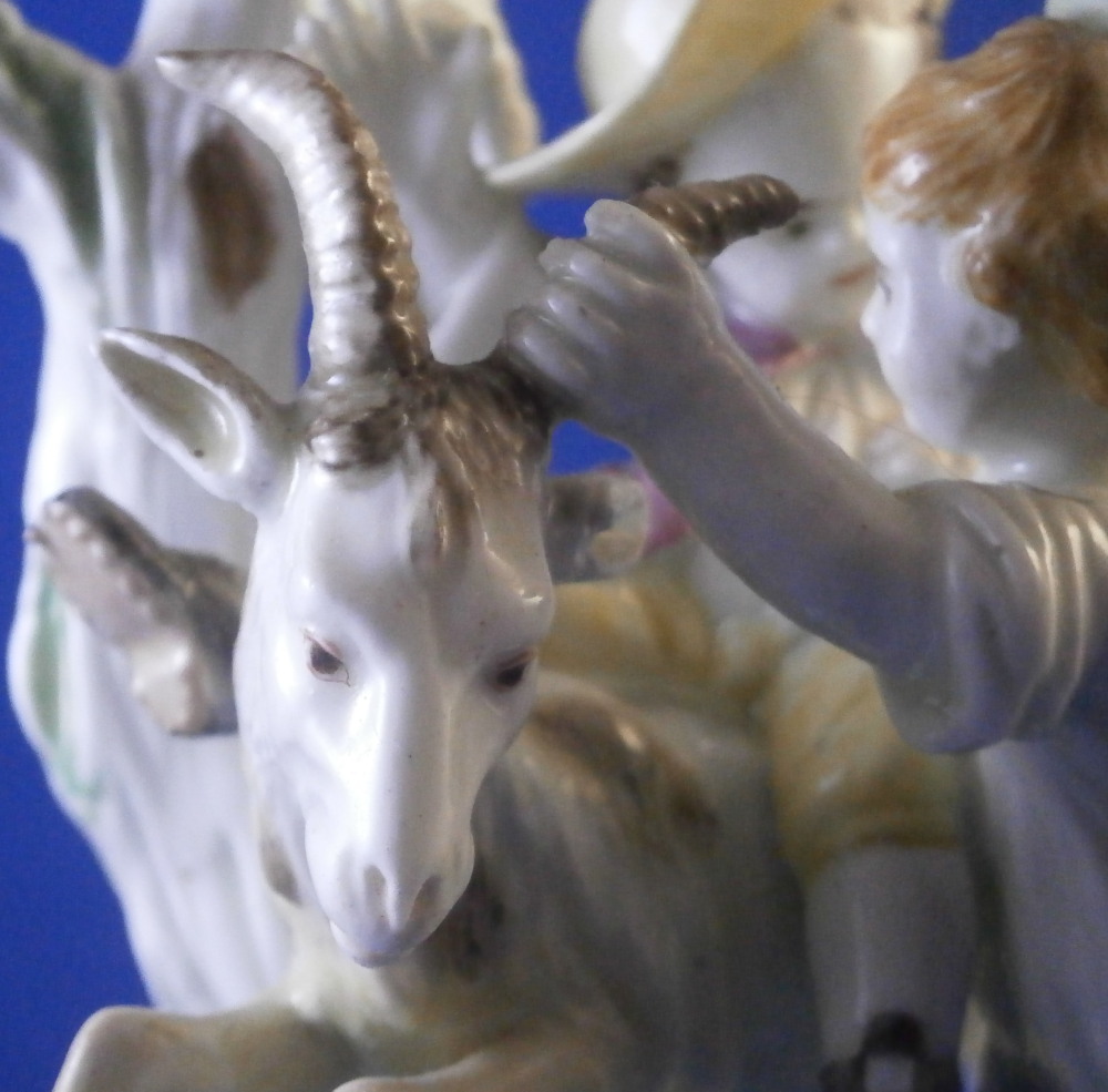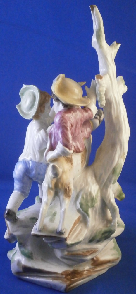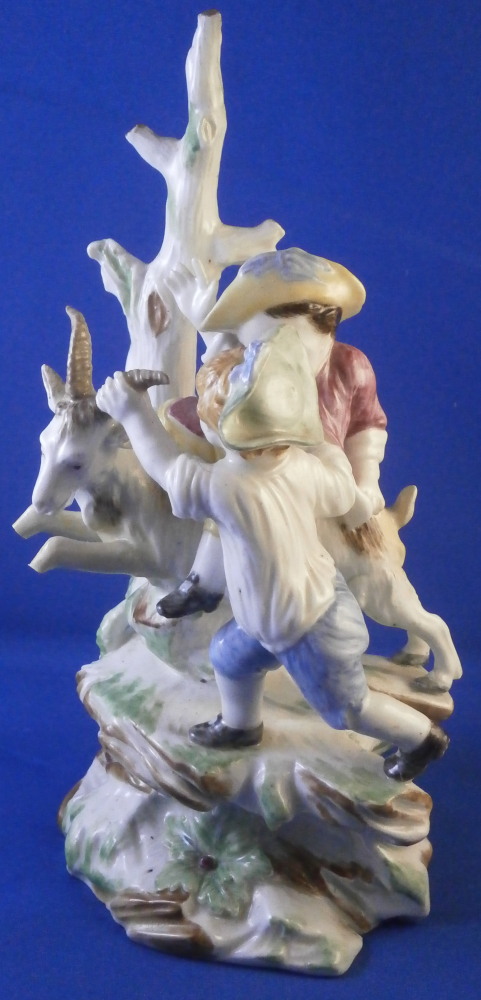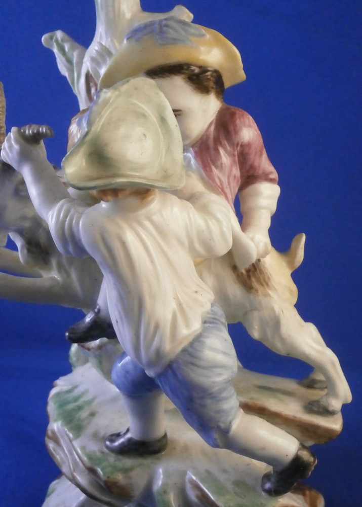 This is a superb figurine made by Mennecy in the 18th century. These polychrome larger figures are really quite rare and hard to find. Here we have a figure of two boys playing with a goat and a rocky base with a tree stump in the back. One of the boys is riding the goat while the other is holding it by a horn, The base is typically modeled with green and brown color patches to it. There i a flower to the front. The figurine is nicely modeled and hand painted.In pretty good shape considering its age. It has had the tail of the goat restored which has yellowed over time and both front legs of the goat were restored as well and are now missing again. One small piece of root sticking out the back has been restored and one back leg of the goat has a crack in it. So as I said all in all in great shape and an easy fix for a decent restorer. The piece is marked with the impressed D.V mark as shown on the bottom edge of the back. The figure is 8.125 inches tall, 4 inches wide and 3.25 inches deep. Please email me for more information or other pictures.