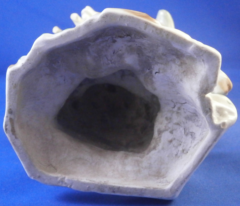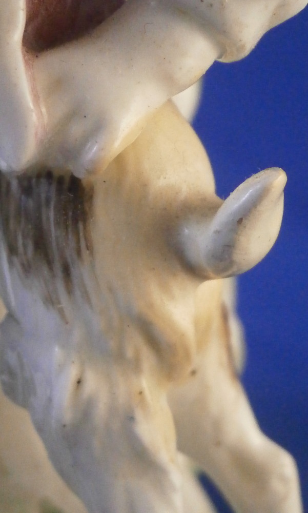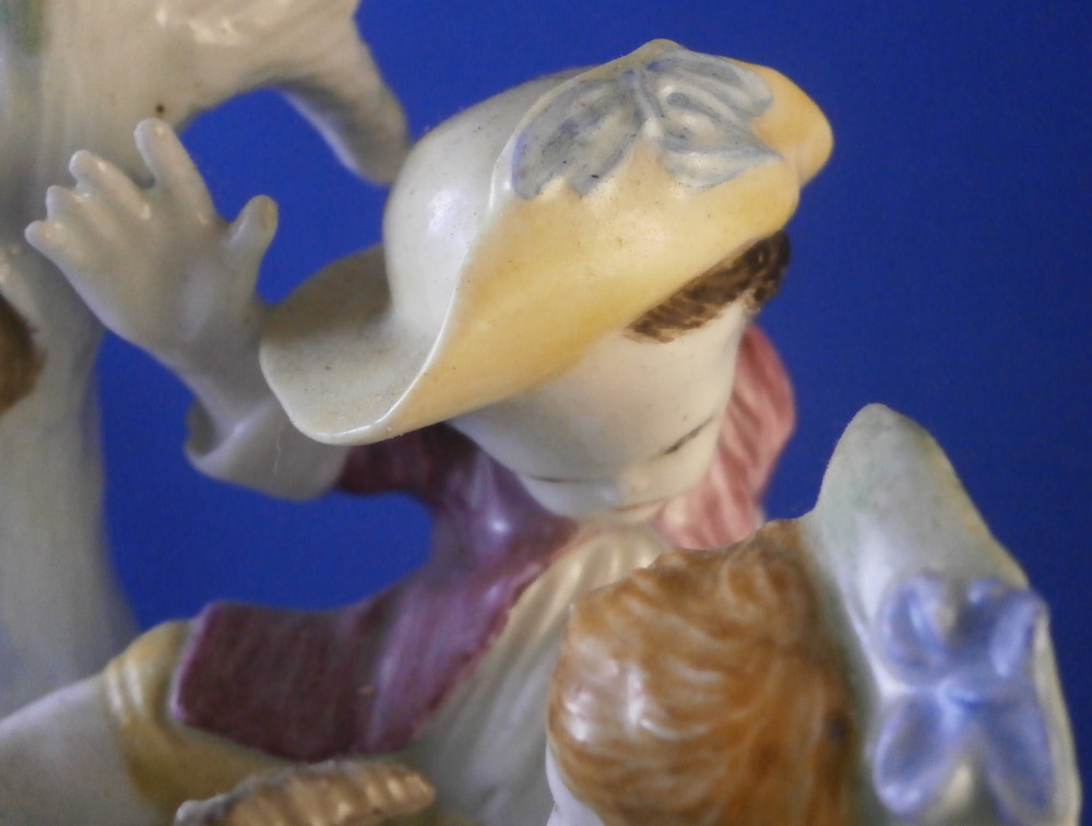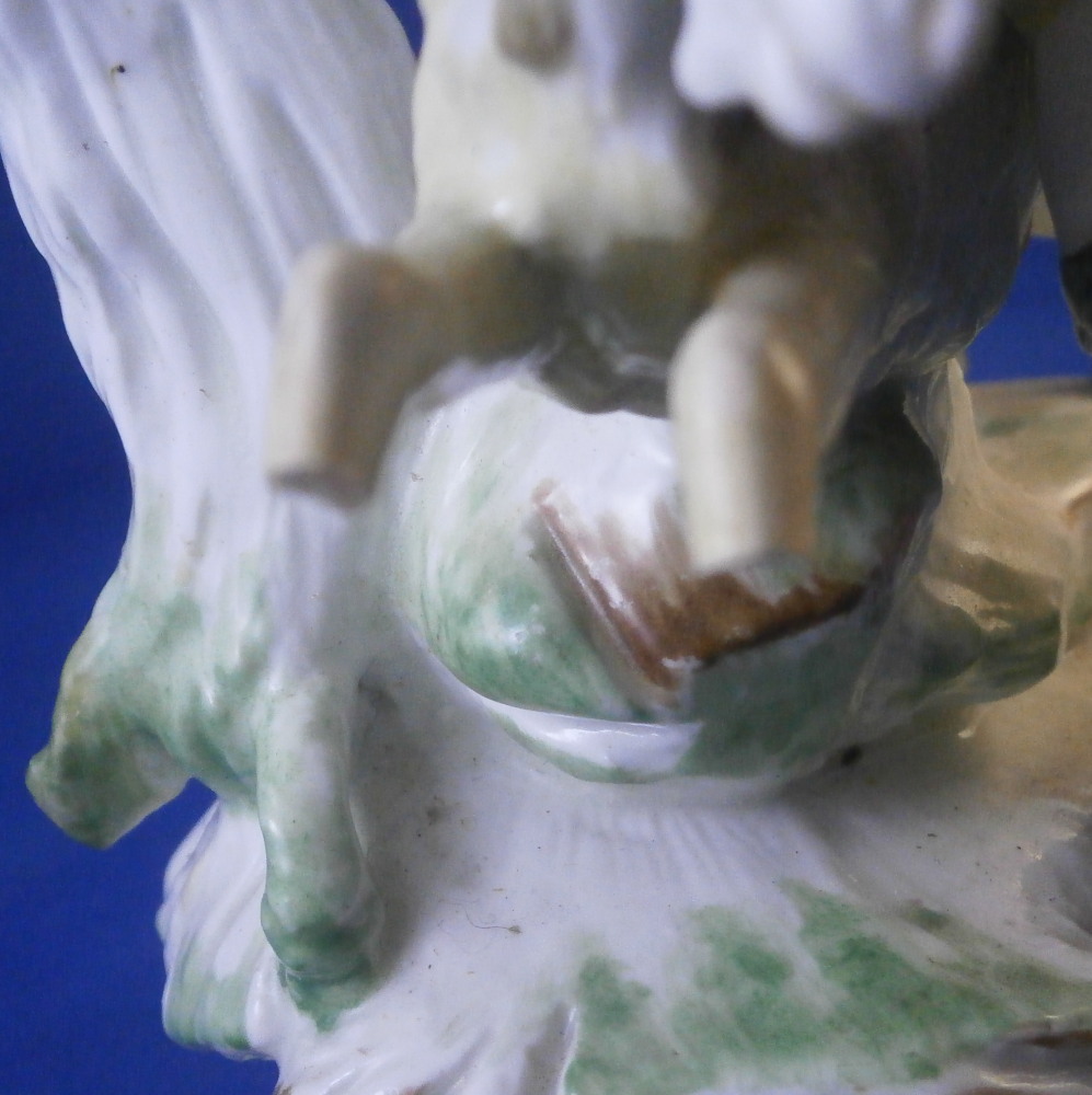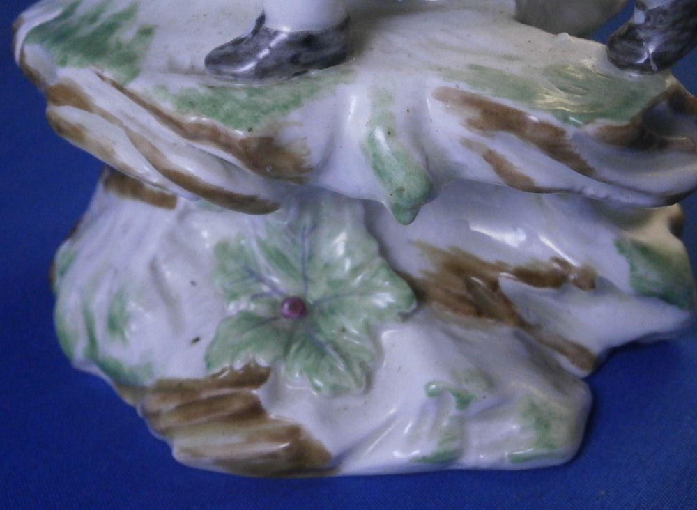 This is a superb figurine made by Mennecy in the 18th century. These polychrome larger figures are really quite rare and hard to find. Here we have a figure of two boys playing with a goat and a rocky base with a tree stump in the back. One of the boys is riding the goat while the other is holding it by a horn, The base is typically modeled with green and brown color patches to it. There i a flower to the front. The figurine is nicely modeled and hand painted.In pretty good shape considering its age. It has had the tail of the goat restored which has yellowed over time and both front legs of the goat were restored as well and are now missing again. One small piece of root sticking out the back has been restored and one back leg of the goat has a crack in it. So as I said all in all in great shape and an easy fix for a decent restorer. The piece is marked with the impressed D.V mark as shown on the bottom edge of the back. The figure is 8.125 inches tall, 4 inches wide and 3.25 inches deep. Please email me for more information or other pictures.