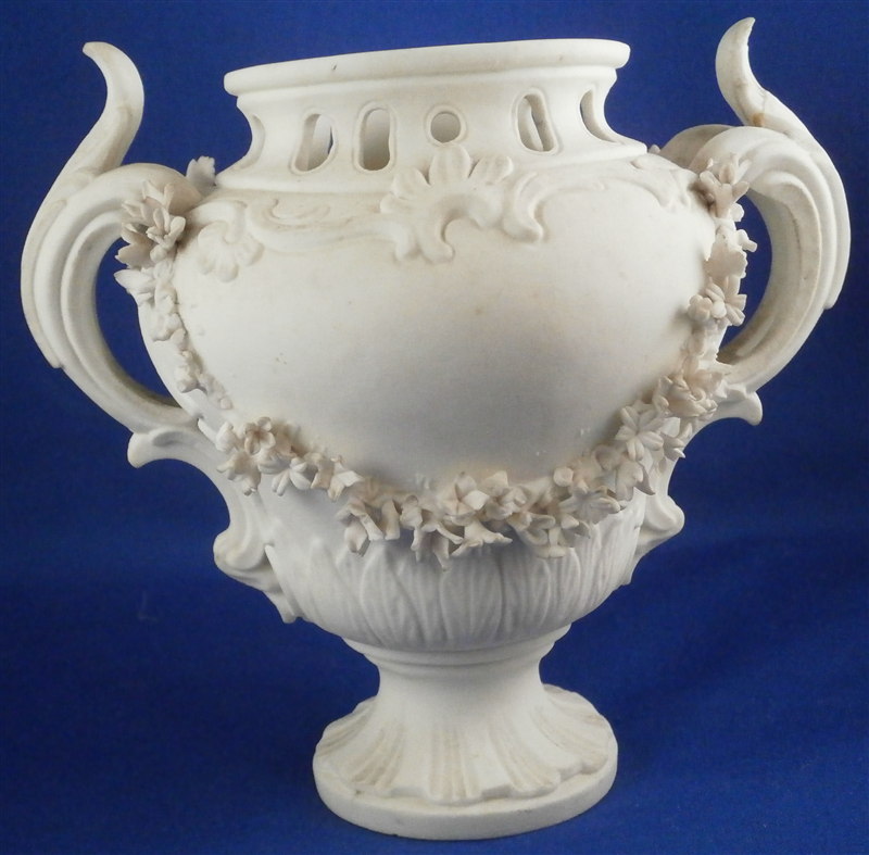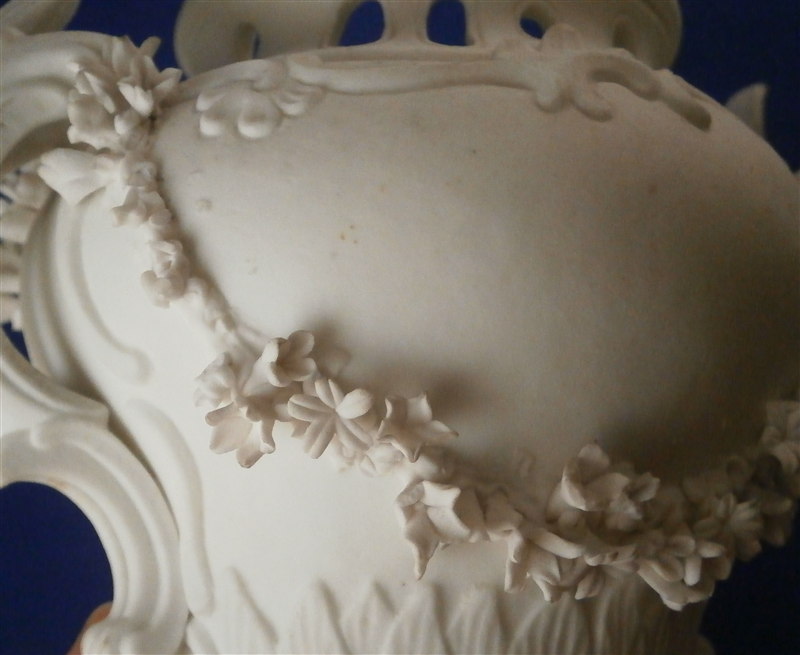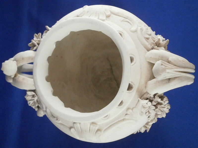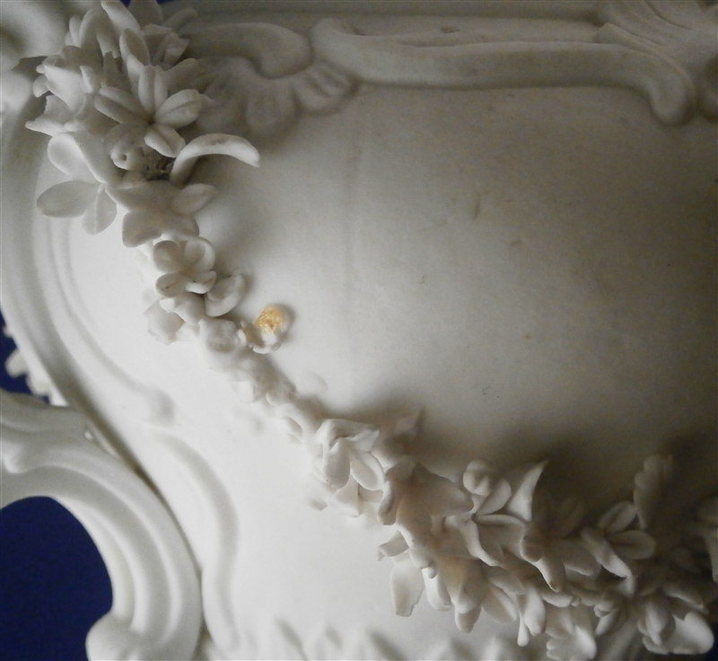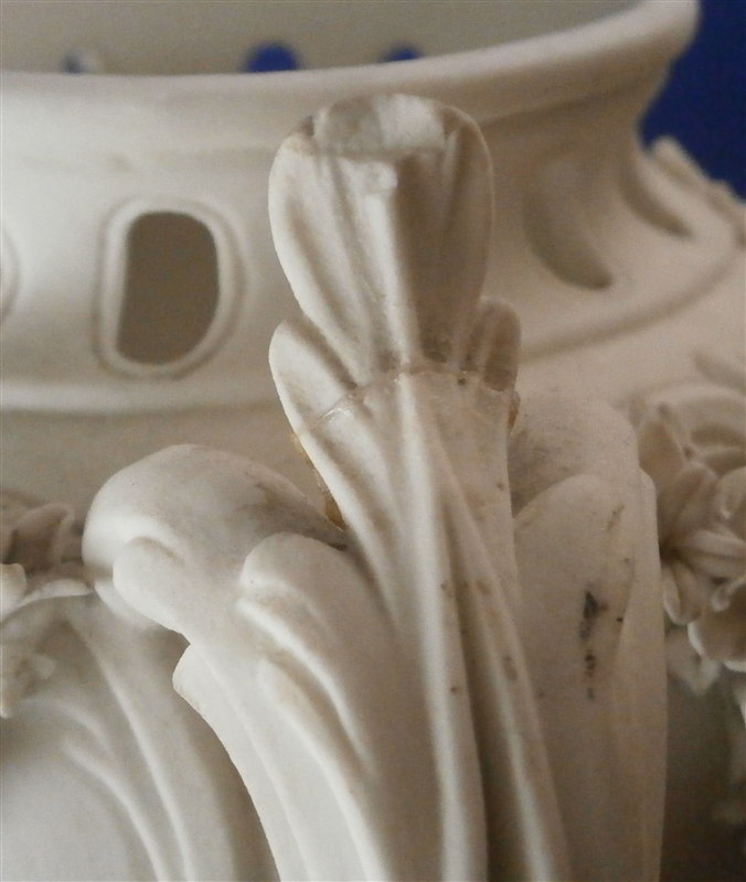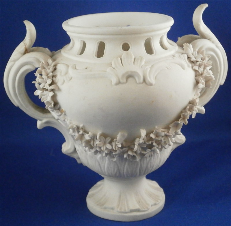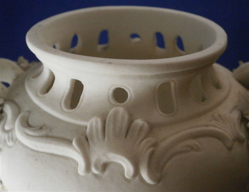 This is a superb potpourri vase made of biscuit porcelain by Mennecy in the 18th century. An amazingly detailed piece with the detailed handles, the holes for the scent to come out of as well as the relief design to the paste but the best part is all those tiny applied flowers. If you consider that each leaf and petal was individually made by hand it is simply amazing! The piece is made of softpaste porcelain and thus quite a bit thicker than real porcelain would be. Still has that warm white color though which makes softpaste so popular. The piece is in good condition with the one handle being broken and reglued at the top with a small chip but the applied flowers have a some damage and lots of missing flowers as shown. The lid has a hairline to it which one can see from the underside and some glue residue. I know a good restorer could fix the missing flowers but it would involve a lot of work. It does still display nicely and is a very rare piece and worth having for sure! The underside is a bit uneven so it wobbles a bit. The piece is not marked but I am certain it is by them! The urn and lid are 6.75 inches tall, 5.5 inches wide and 4 inches deep. Please email me for more information or other pictures.