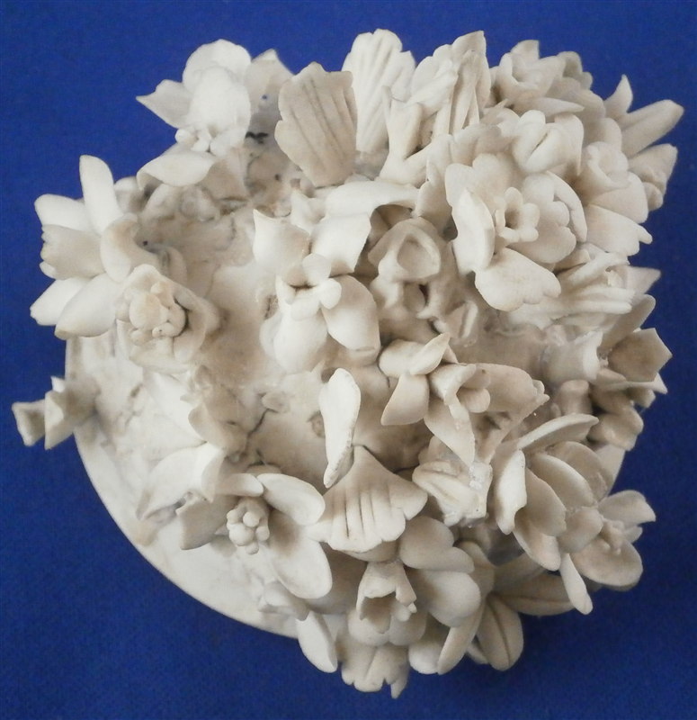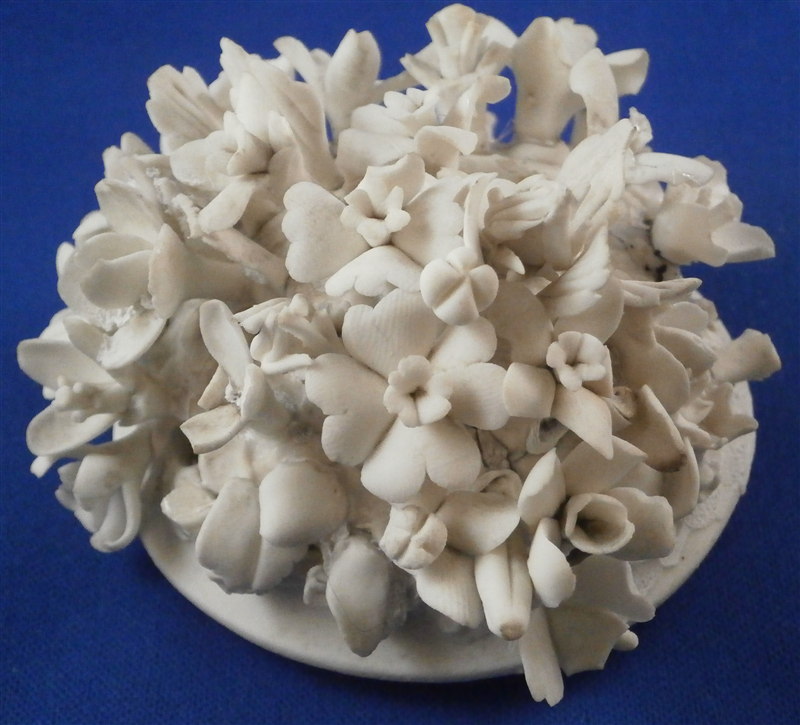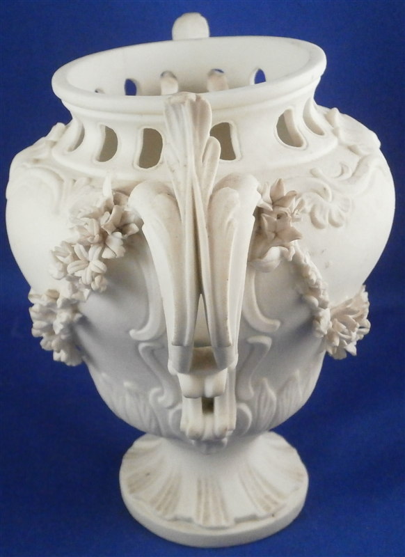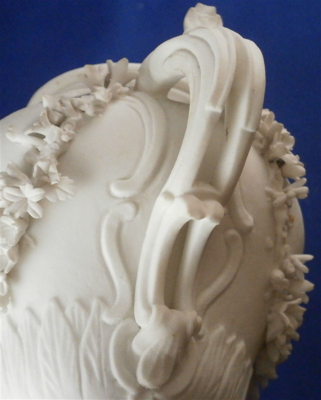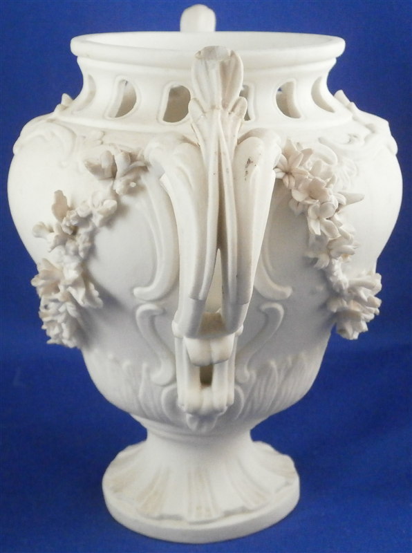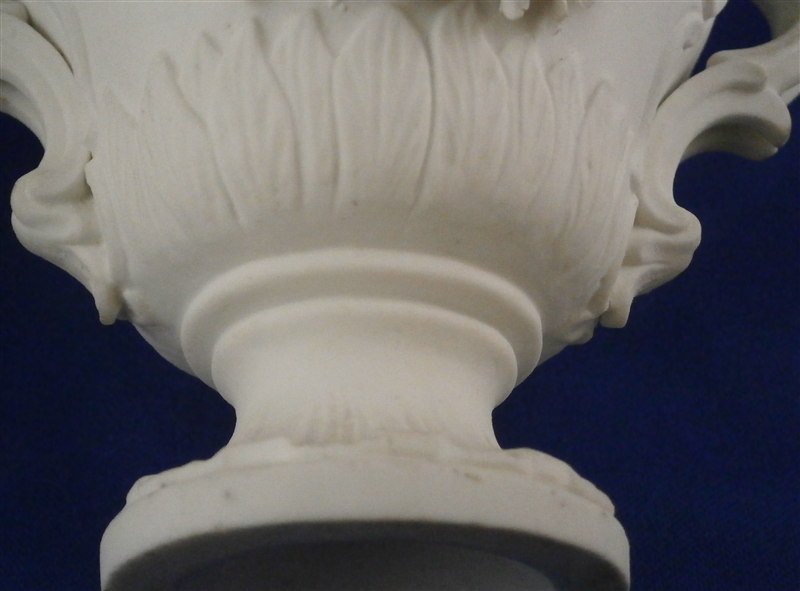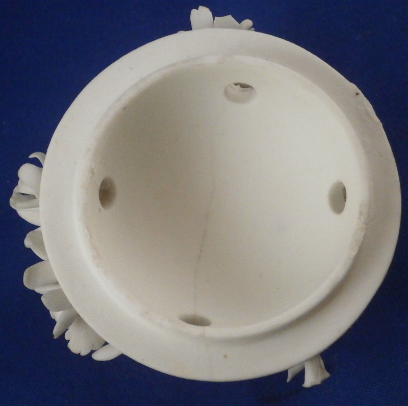 This is a superb potpourri vase made of biscuit porcelain by Mennecy in the 18th century. An amazingly detailed piece with the detailed handles, the holes for the scent to come out of as well as the relief design to the paste but the best part is all those tiny applied flowers. If you consider that each leaf and petal was individually made by hand it is simply amazing! The piece is made of softpaste porcelain and thus quite a bit thicker than real porcelain would be. Still has that warm white color though which makes softpaste so popular. The piece is in good condition with the one handle being broken and reglued at the top with a small chip but the applied flowers have a some damage and lots of missing flowers as shown. The lid has a hairline to it which one can see from the underside and some glue residue. I know a good restorer could fix the missing flowers but it would involve a lot of work. It does still display nicely and is a very rare piece and worth having for sure! The underside is a bit uneven so it wobbles a bit. The piece is not marked but I am certain it is by them! The urn and lid are 6.75 inches tall, 5.5 inches wide and 4 inches deep. Please email me for more information or other pictures.