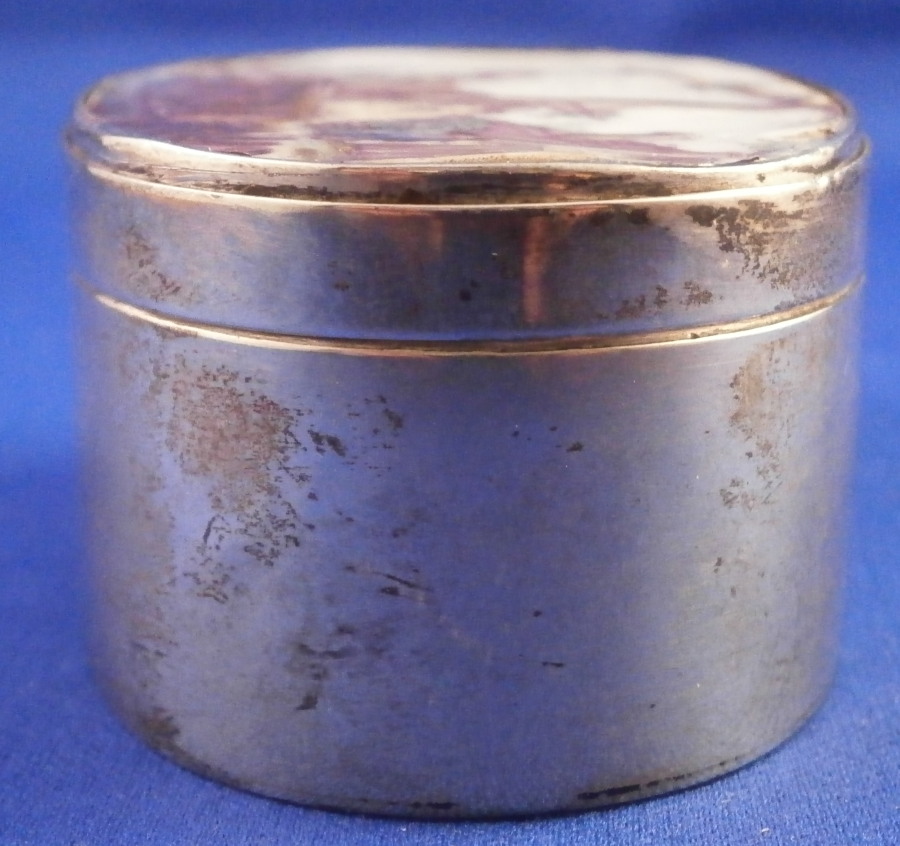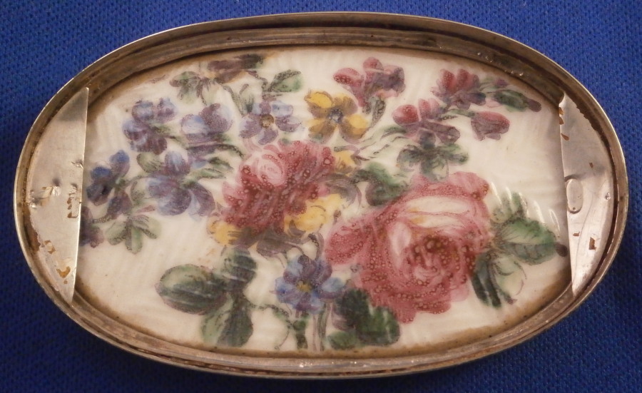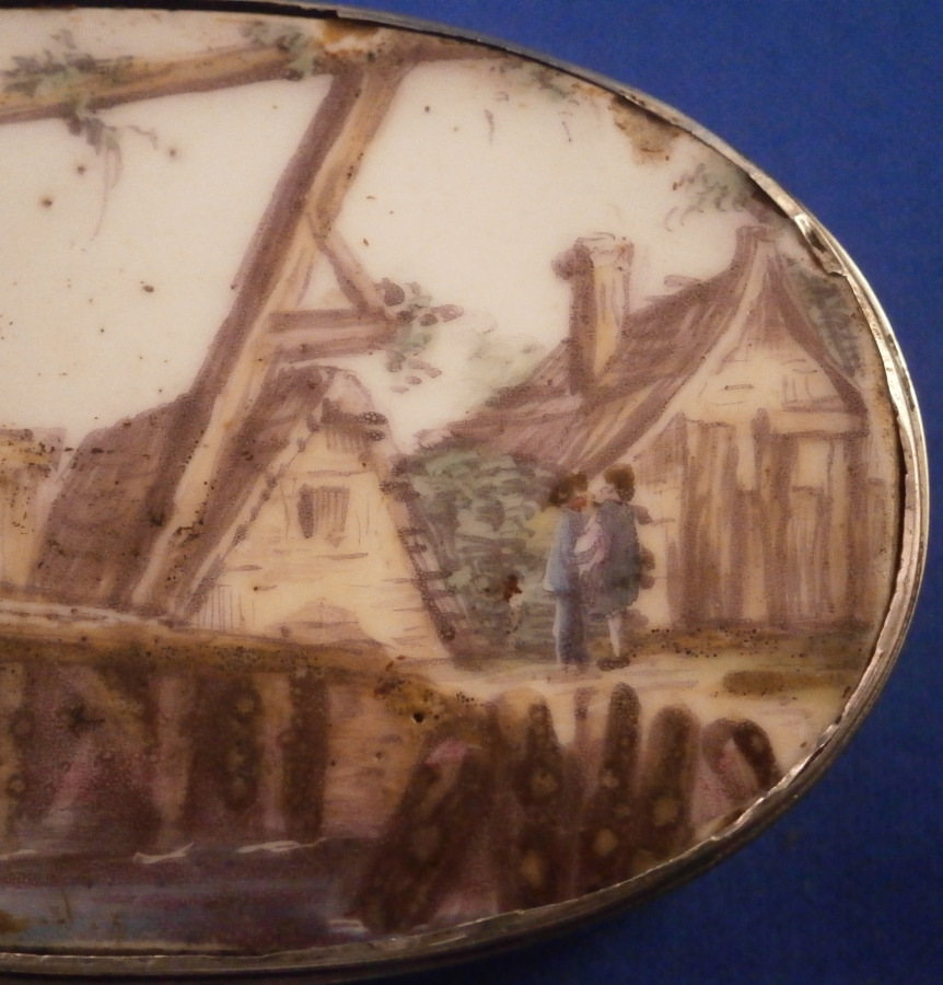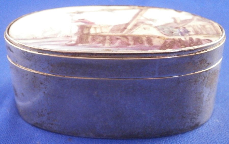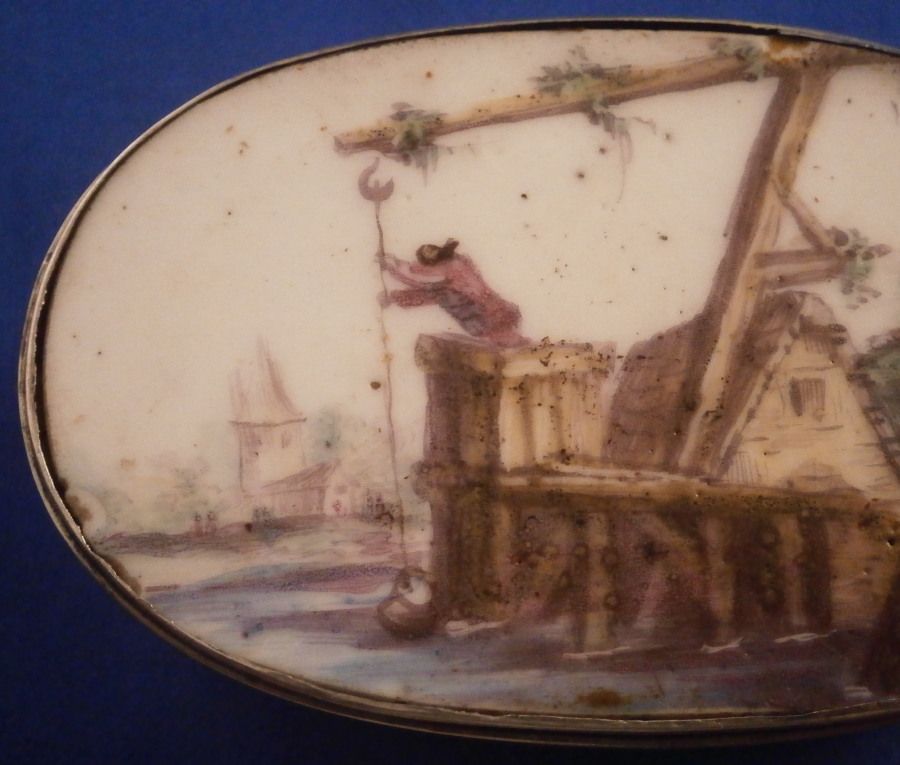 This is an interesting box! The lid was taken from a soft paste Mennecy snuff box that probably had the bottom damaged beyond repair. A really great idea! The porcelain top is hand painted with a superb scene of a guy operating an early crane while standing on the shore of a river near some houses with more buidlings in the background. A stuning scene. The underside of the lid has a hatch mark relief design to it typical for Mennecy and is hand painted with a floral arrngement. That side used to be more likely the top and the scene would have been on the inside. The rest of the box is Sterling silver and not too flimsy either. Simple lines to complement the porcelain perfectly. The two go perfectly together! The porcelain is not marked which is normal but there is no doubt it was made by Mennecy in the 18th century. The silver is not marked either. There is an odd spot to the underside of the bottom but it's not deep enough to be the result of a mark being removed so it's probably just wear. I do have another box that is similar which is marked but the style of the underside lid is different so I doubt these are by the same maker. Either way a really near piece! The piece is in great condition with some normal oxidation that just needs a quick polish if one wanted that. The porcelain has a few minor chips to the edge which would ahve been hidden by the mounts had it been put in the right position. It displays perfectly as is though! It would make a superb pill or patch box! The piece is 1.125 inches tall, 2.75 inches wide and 1.75 inches deep. A nice size! Please email me for more information or other pictures.