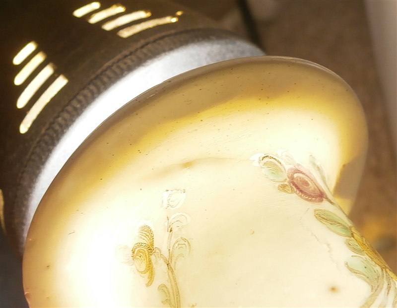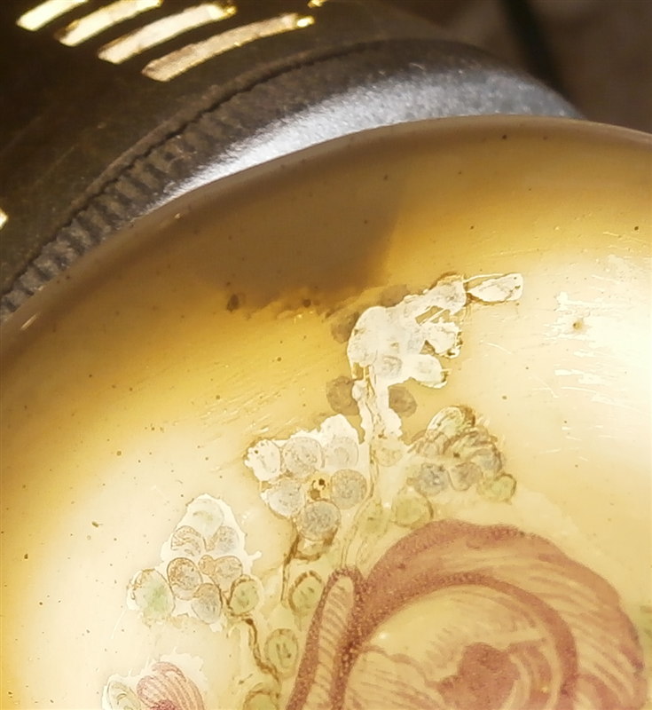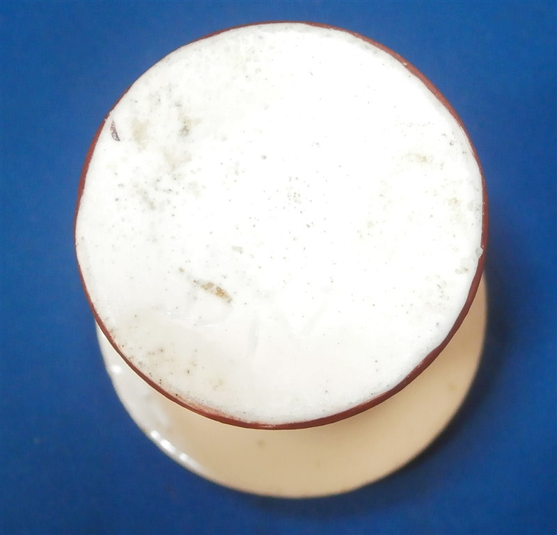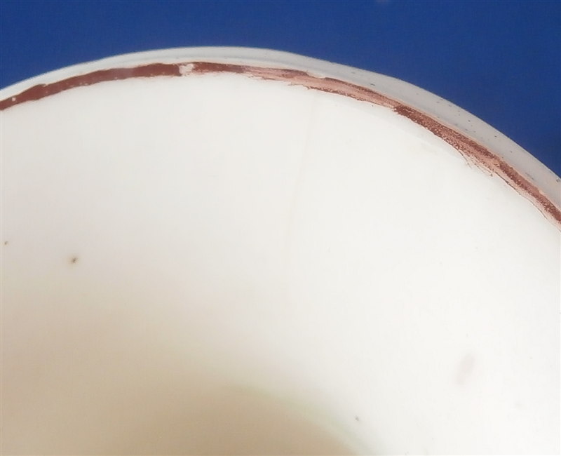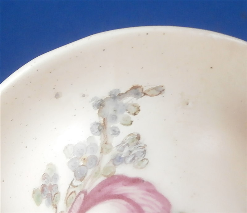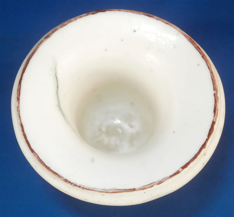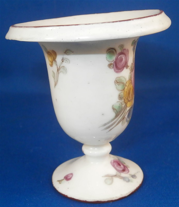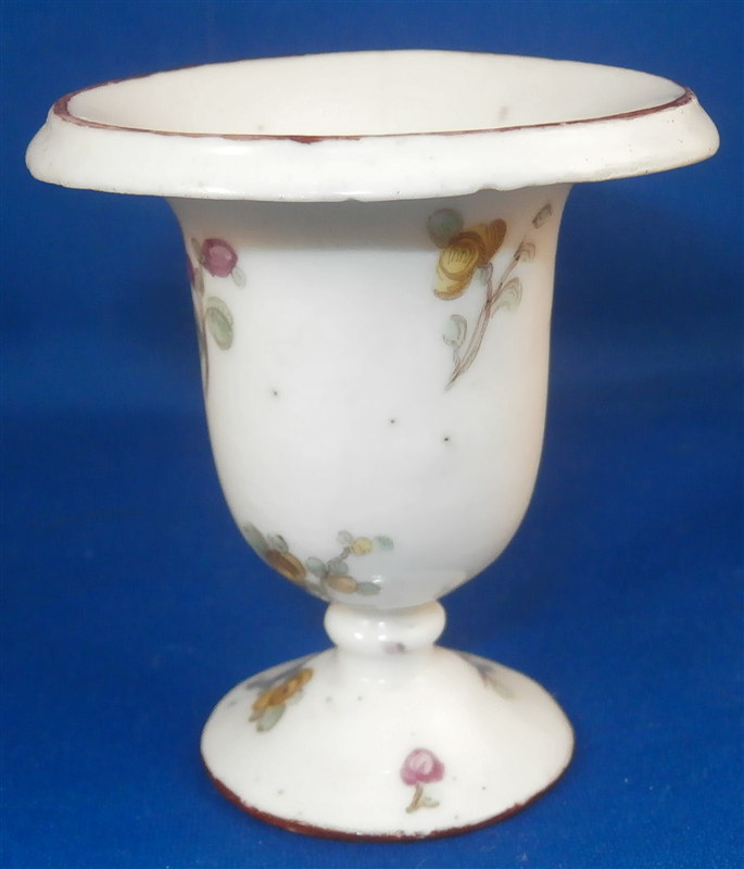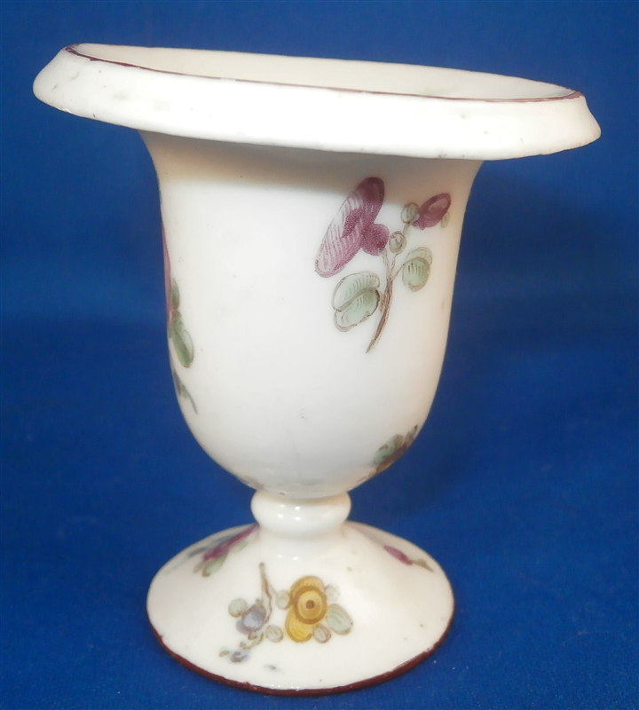 This is a fun litte urn / vase made by Mennecy in the 18th century. It is made of softpaste porcelain and thus has a creamy warm white color and the enamel colors look quite different from the usual hard paste one sees much more often. The vase is hand painted nicely with a floral arrangement as well as some scattered flowers and a reddish brown trim. This would go well with the pedestal I own. The piece is marked with the incised D.V mark as shown. The vase displays perfectly but has had two spots along the edge repaired. Looks like two chips as well as a hairline. Perfectly repaired. There is also a firing crack on the inside top which is fairly typical for them which was just painted in green a bit to cover it. The vase has sagged a bunch during firing which is evident in the pics. A charming and rare survivor nontheless! It is 2.725 inches tall and 2.375 inches in diameter. Please email me for more information or other pictures.