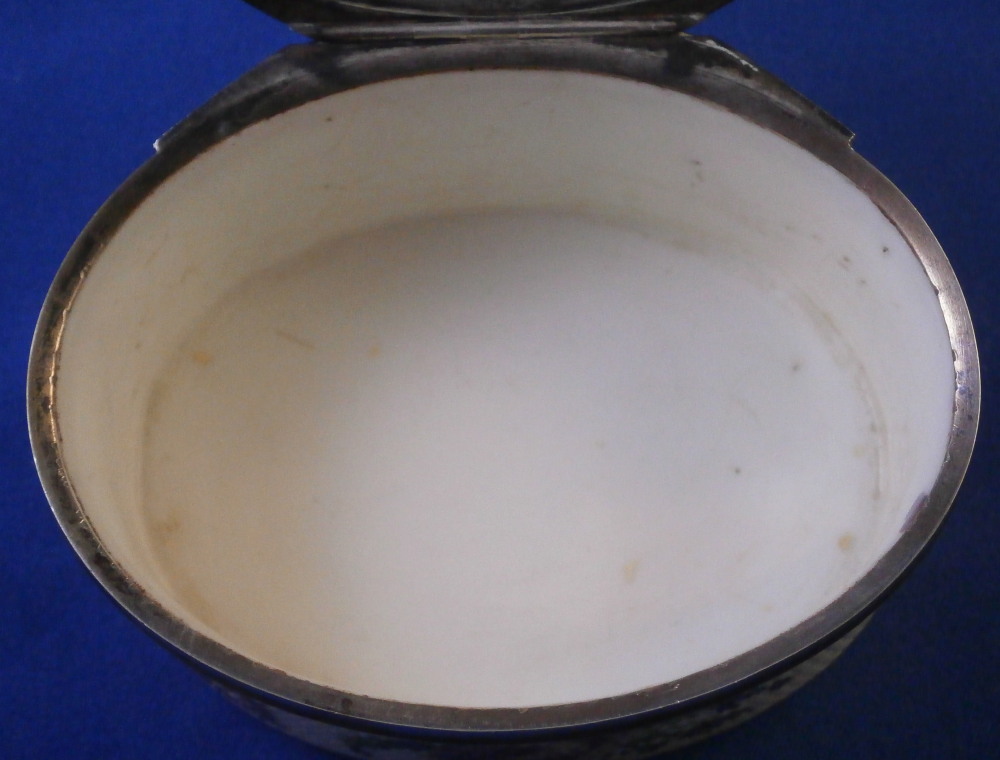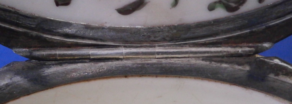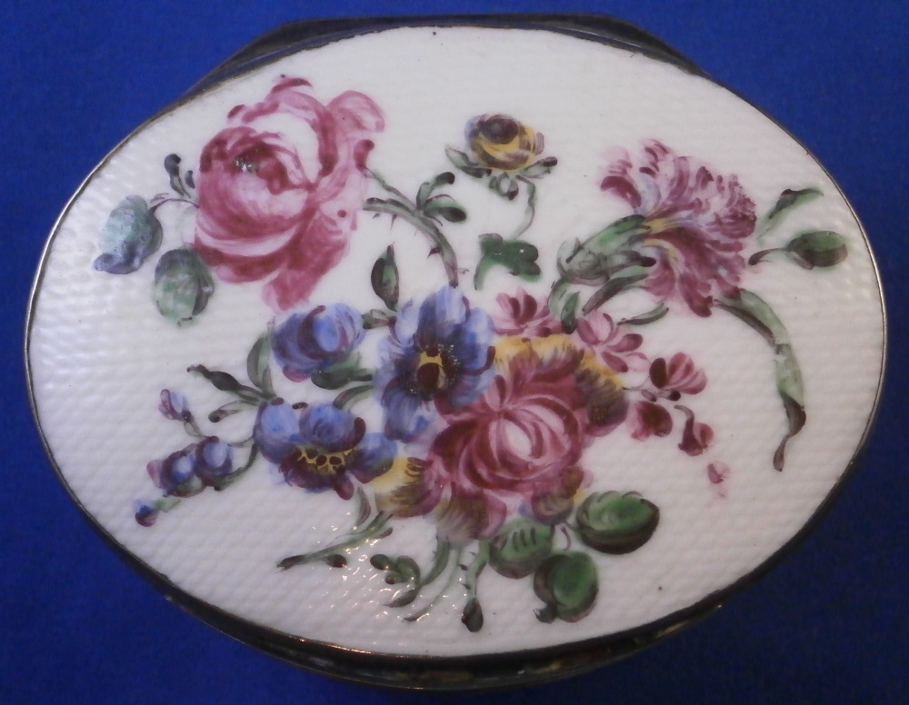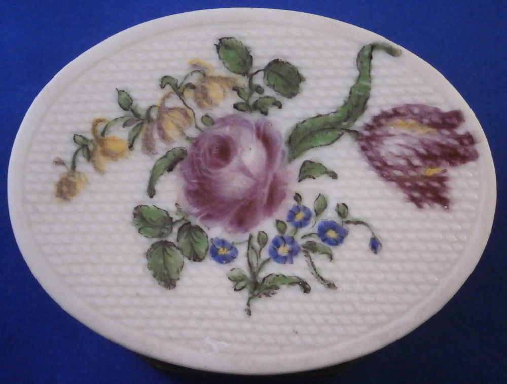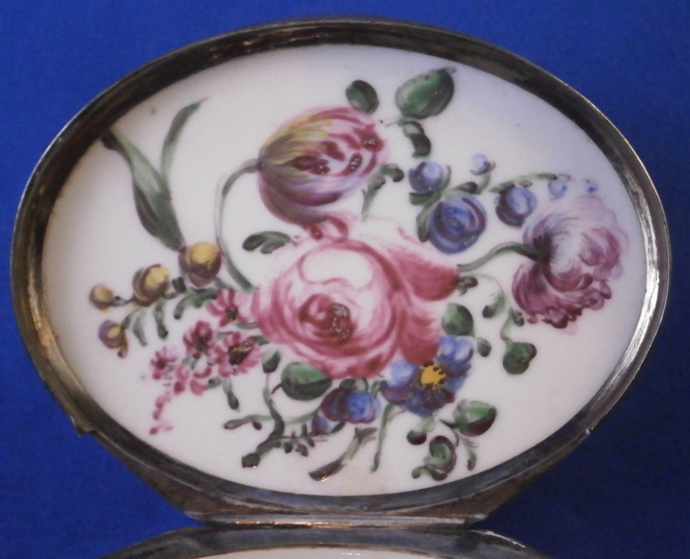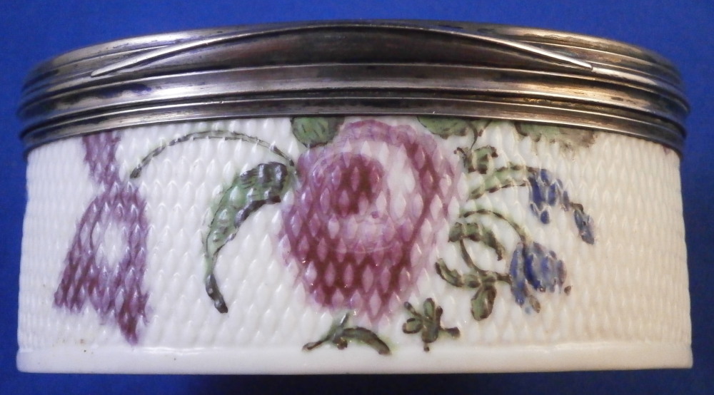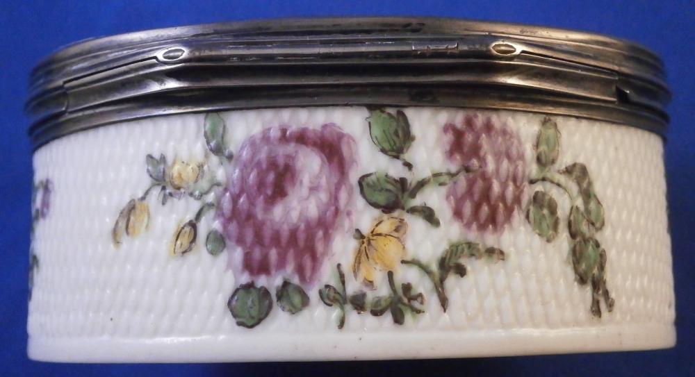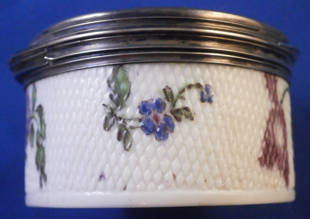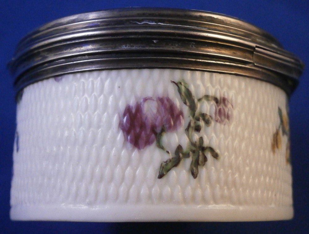 This is a rare and really nice snuff / patch / trinket / pill box / tabatiere made by Mennecy in the 18th century. It is made of softpaste porcelain and thus has a creamy warm white color and the enamel colors look stunning. The box has a relief design to the paste and is hand painted with floral arrangements to the top, bottom, inside top as well as the back and front with a smaller single flower to either side. The mounts are sterling silver - which is marked though it is tiny and I cannot make it out! Really a superb piece! The porcelain is not marked which is normal on these types of items but it was definitely by them. The piece is in superb condition without any issues. There is some normal oxidation to the silver which could be cleaned if one wanted to and the bottom edge has lost its glazed from years of use but these are not real issues. The box is 1.375 inches tall, 3.125 inches wide and 2.5 inches deep. So rather large for their boxes and a truly excellent example of their work! Please email me for more information or other pictures.
