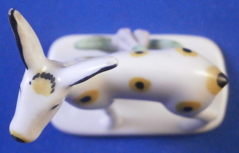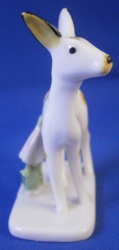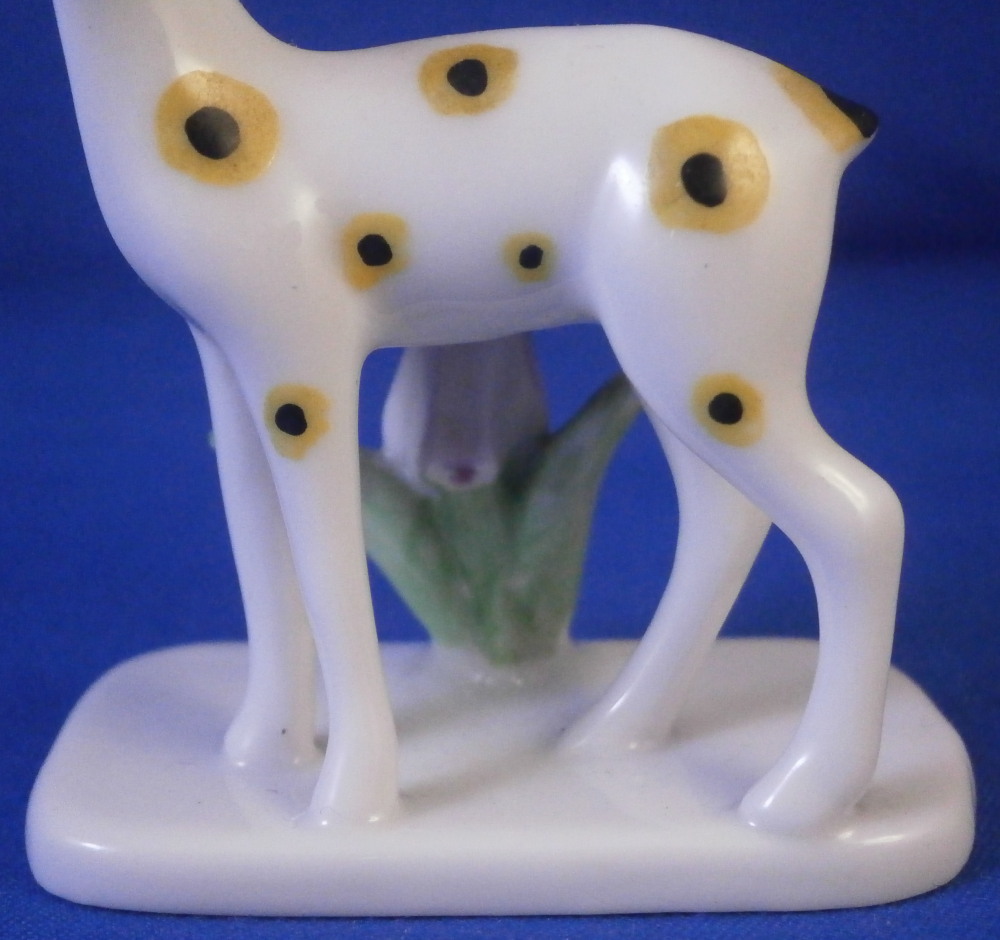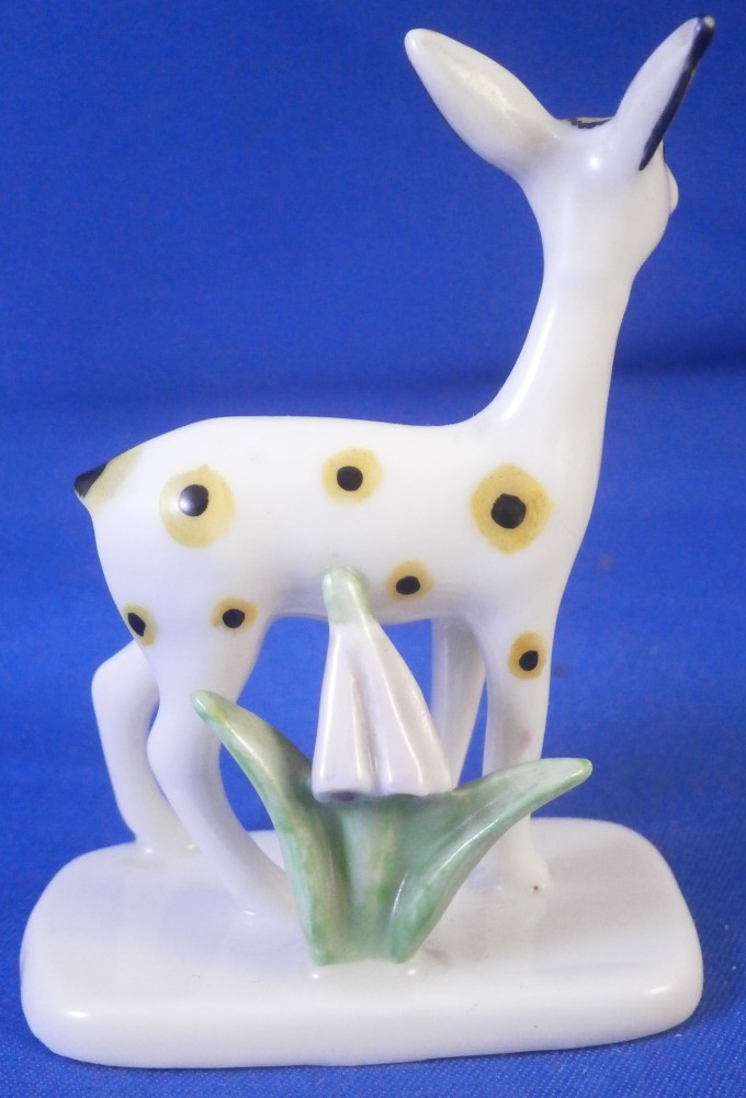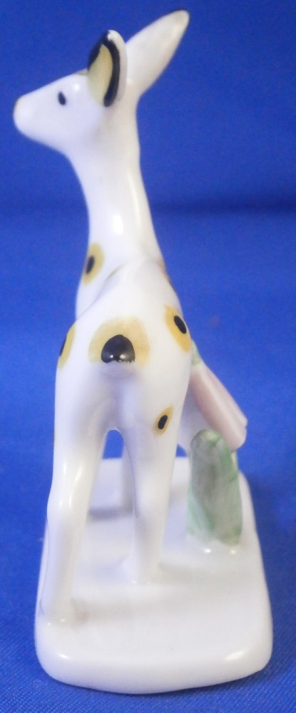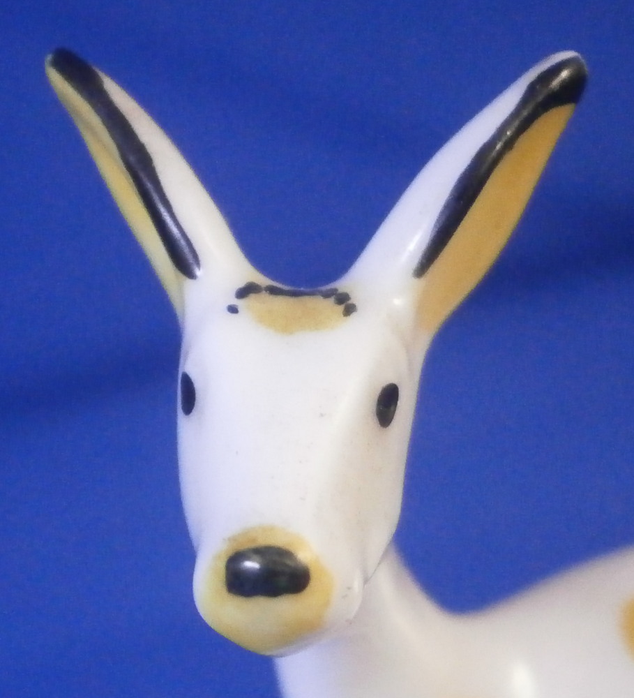 This is a cute porcelain figurine made by Metzler & Ortloff in the late 1920's. Metzler & Ortloff was founded originally around 1873 and finally closed its doors in 1976. This figurine was designed during their best period by the famous Walter Bosse who worked for them from 1926 until 1930. He made about 200 different figures though most are dogs or such things and very few are larger pieces. The piece here I have never seen. It is of a little horse standing on a rectangular base with a flower with its leaves next to it. Normally I would say it is part of their place card holder serie but there is no space between the flower and the deer. Either it is not part of this series or the flower moved during the firing process and stuck to the deer. Either is an option. The deer is super cute with the little black and yellow circle design to it. Meant to be a fawn I suppose. The figure is modeled and hand painted in the typical fashion for this maker and designer. I have never come across this piece before nor can I find it in my searches but have had the cow, elephant and donkey before. Really a fun little piece! The figurine is in perfect condition which always helps and is marked underneath with the green MO mork under a crown in a circle as well as an impressed number 5546 (I think) as shown. The figurine is about 2.375 inches tall, 1.125 inches wide and 1.75 inches long. Please email me for more information or photos.
