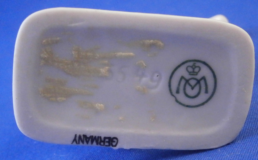 This is a cute and very rare porcelain figurine made by Metzler & Ortloff in the late 1920's. Metzler & Ortloff was founded originally around 1873 and finally closed its doors in 1976. This figurine was designed during their best period by the famous Walter Bosse who worked for them from 1926 until 1930. He made about 200 different figures though most are dogs or such things and very few are larger pieces. The piece here is of a dog possibly a boxer standing on a rectangular base with rounded corners with a flower with its leaves next to it. A super cute example with dark and light brown patches and a cute face. The figure is part of their placecard holder series but I could not find another example of this aprticular model. The figure is modeled and hand painted in the typical fashion for this maker and designer. Really a fun little piece! The figurine is in perfect condition which always helps and is marked underneath with the green MO mork under a crown in a circle as well as an impressed number 5549 as shown. The figurine is about 2.25 inches tall, 1.125 inches wide and 2 inches long. Please email me for more information or photos.