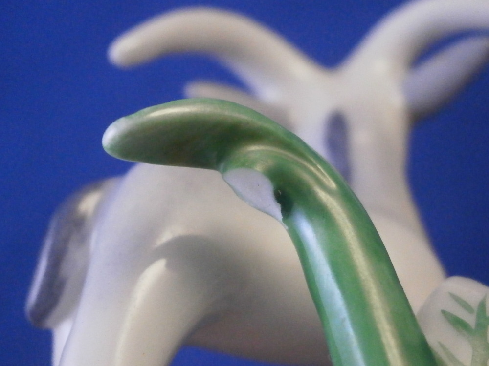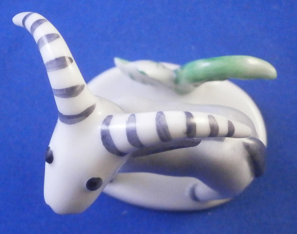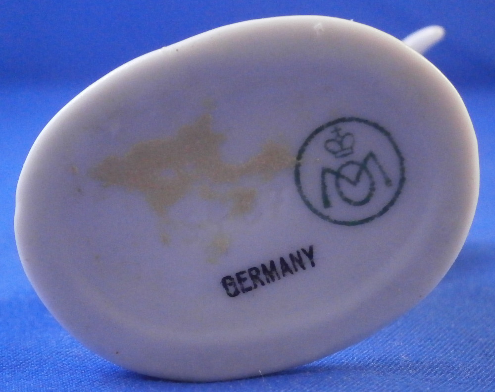 This is a cute porcelain figurine made by Metzler & Ortloff in the late 1920's. Metzler & Ortloff was founded originally around 1873 and finally closed its doors in 1976. This figurine was designed during their best period by the famous Walter Bosse who worked for them from 1926 until 1930. He made about 200 different figures though most are dogs or such things and very few are larger pieces. The piece here is a male goat (I think) figure standing on a rectangular base with rounded corners with some leaves next to it. The piece is part of their place card holder series. A very hard to find example. The goat is super cute with purple rings painted on its horns. The figure is modeled and hand painted in the typical fashion for this maker and designer. I have a few other examples if anyone would like to make a set. I have them all up on the site. These really are fun little pieces! The figurine displays perfectly but upon close inspection a tip of one of the leaves is chipped. It is underneath and impossible to spot when on display. The piece is marked underneath with the green MO mark under a crown in a circle as well as an impressed number 5467 and Germany in black as shown. The figurine is 2 inches tall, 1.375 inches wide and 1.875 inches long. Please email me for more information or photos.