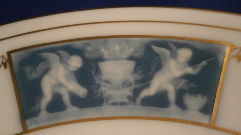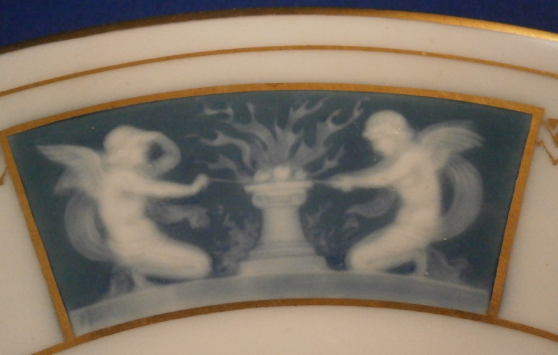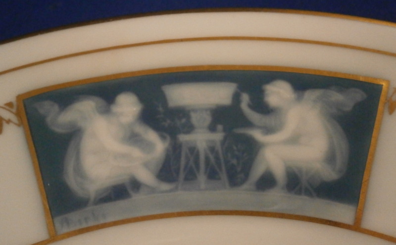 This is a very detailed pate-sur-pate plate made by Mintons in the 20th century - 1931 to be exact according to the date code. It has three different scenic panels in the pate sur pate technique on the rim and a nice gold trim to make this one very elegant plate. Each scene is very detailed with cherubs doing different things in the raised white paste with a blueish background color. Each of these was painted by Albion Birks a student of the famous Marc Louis Solon . Two of the scenes are simply signed AB while one is signed A. Birks. The plate is of a nice size being 0.875 inches tall and 10.25 inches in diameter. It is in perfect condition with some use marks in the clear glaze of the center which can only be seen when held up to the light at the right angle. It is marked underneath with impressed Mintons as well as their typical date cyphers and the puce Minton mark with England underneath used from 1912 to the 50's I believe. Please email me for more information or other pictures.