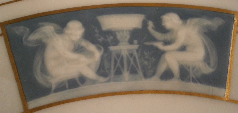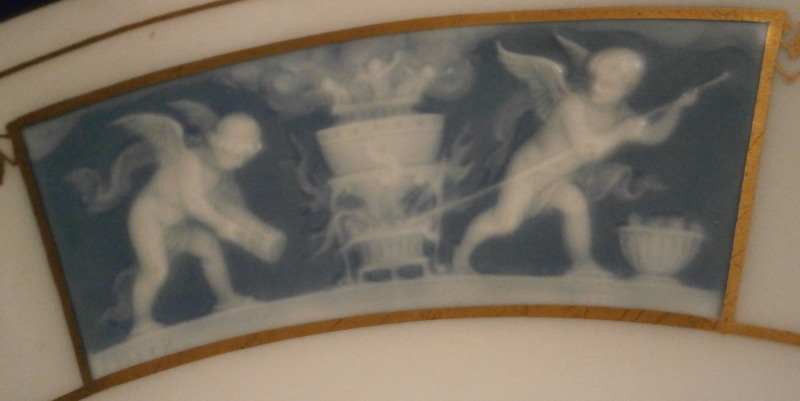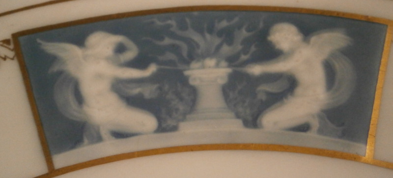 This is a very detailed pate-sur-pate plate made by Mintons in the early 20th century - can't quite figure out this date code so not sure of the exact year. It has three different scenic panels in the pate sur pate technique on the rim and a nice gold trim to make this one very elegant plate. Each scene is very detailed with cherubs doing different things in the raised white paste with a blueish background color. Each of these was painted by Albion Birks a student of the famous Marc Louis Solon . Two of the scenes are simply signed AB while one is signed A. Birks. The plate is of a nice size being 1 inch tall and 10.25 inches in diameter. It is in perfect condition with some use marks in the clear glaze of the center which can only be seen when held up to the light at the right angle. They were meant to be used after all :) It is marked underneath with impressed Mintons as well as their typical date cyphers and the puce Minton mark with England underneath used from 1912 to the 50's I believe. Please email me for more information or other pictures.